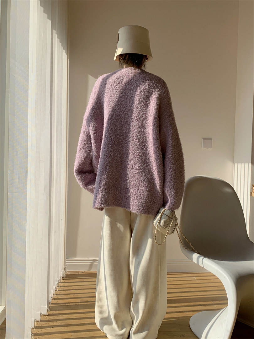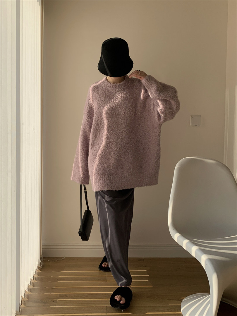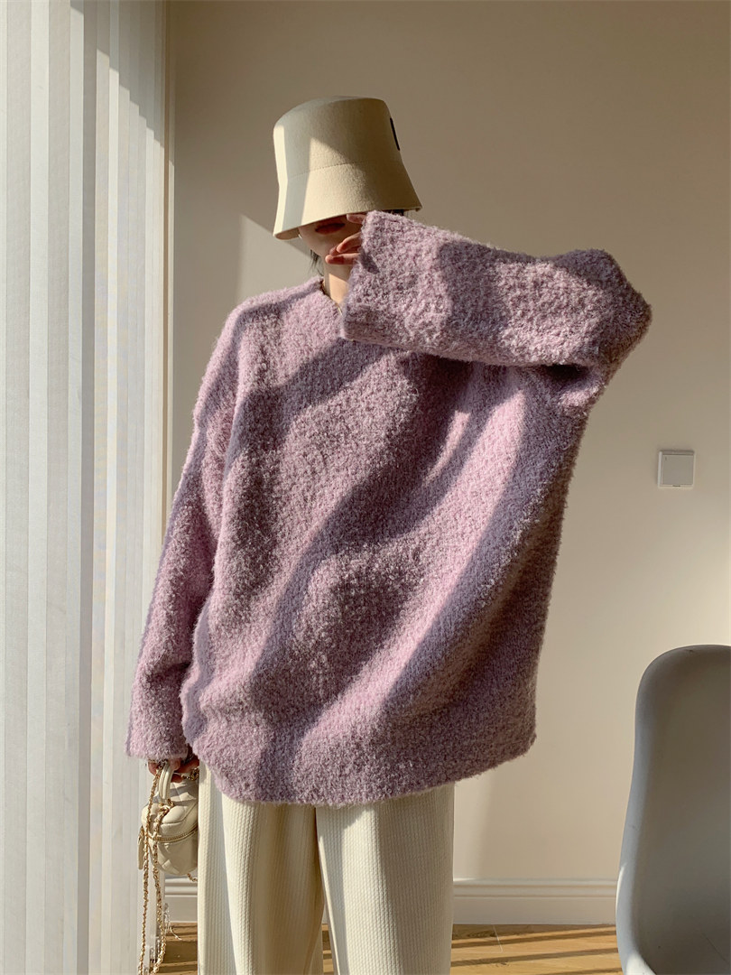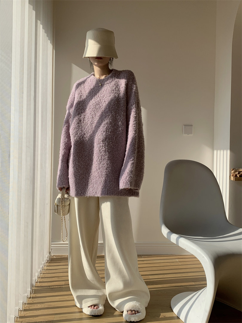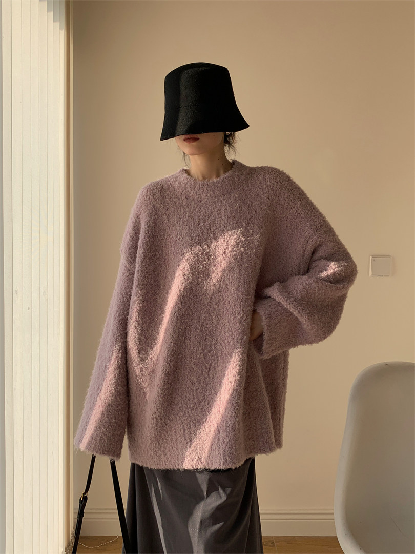 【トップス】シンプル ラフ サークルフリース ふわふわ ゆったり 丸首 プルオーバー ニット パープル レディース【JZシリーズ】