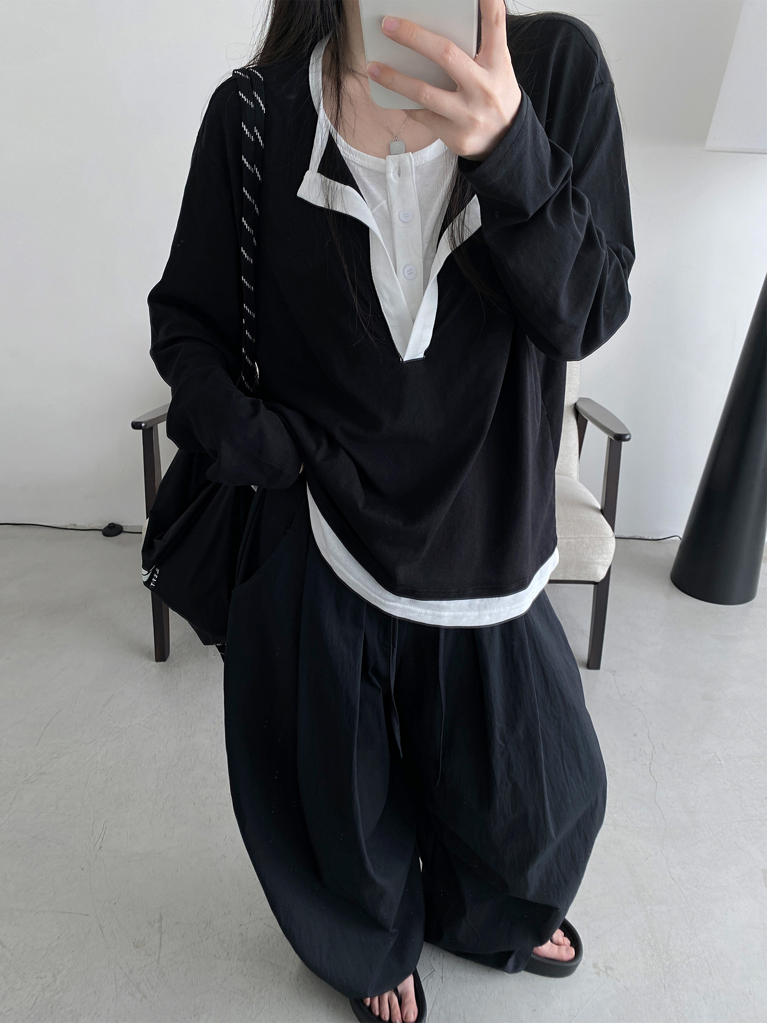 【トップス】フェイク2WAY 半開きカラー UVカット 長袖Tシャツ レディース 韓国デザイン ゆったり【FCシリーズ】