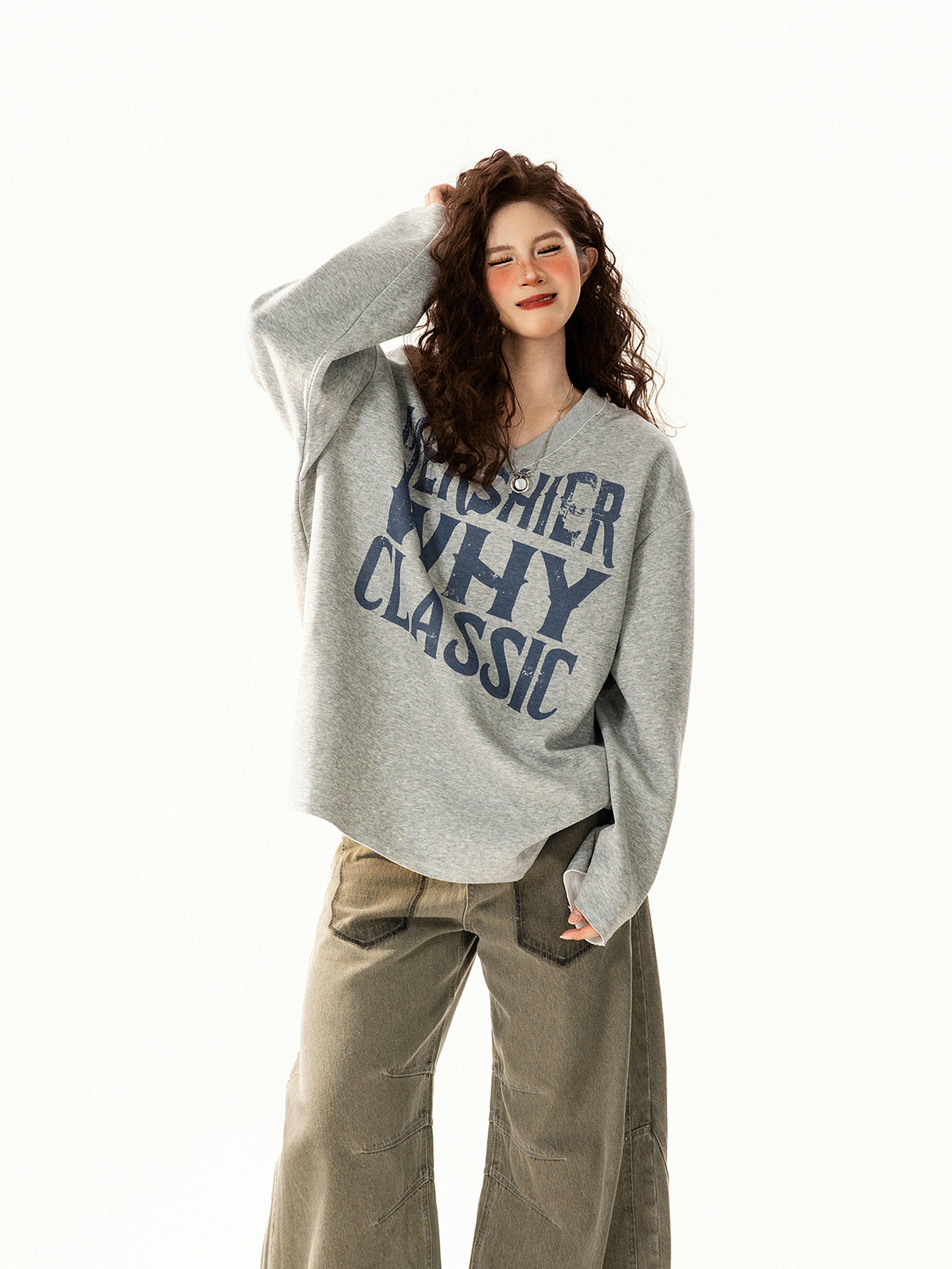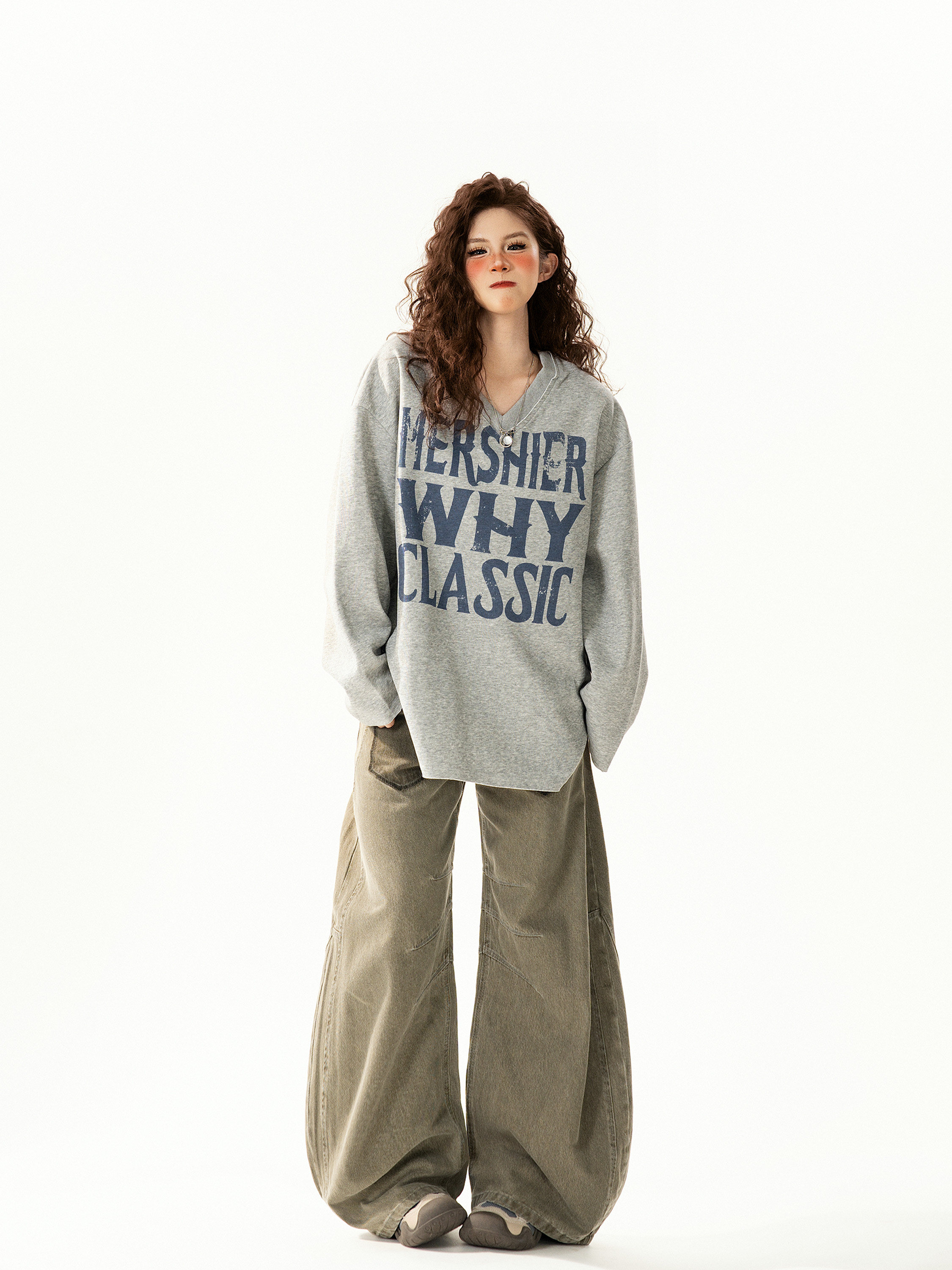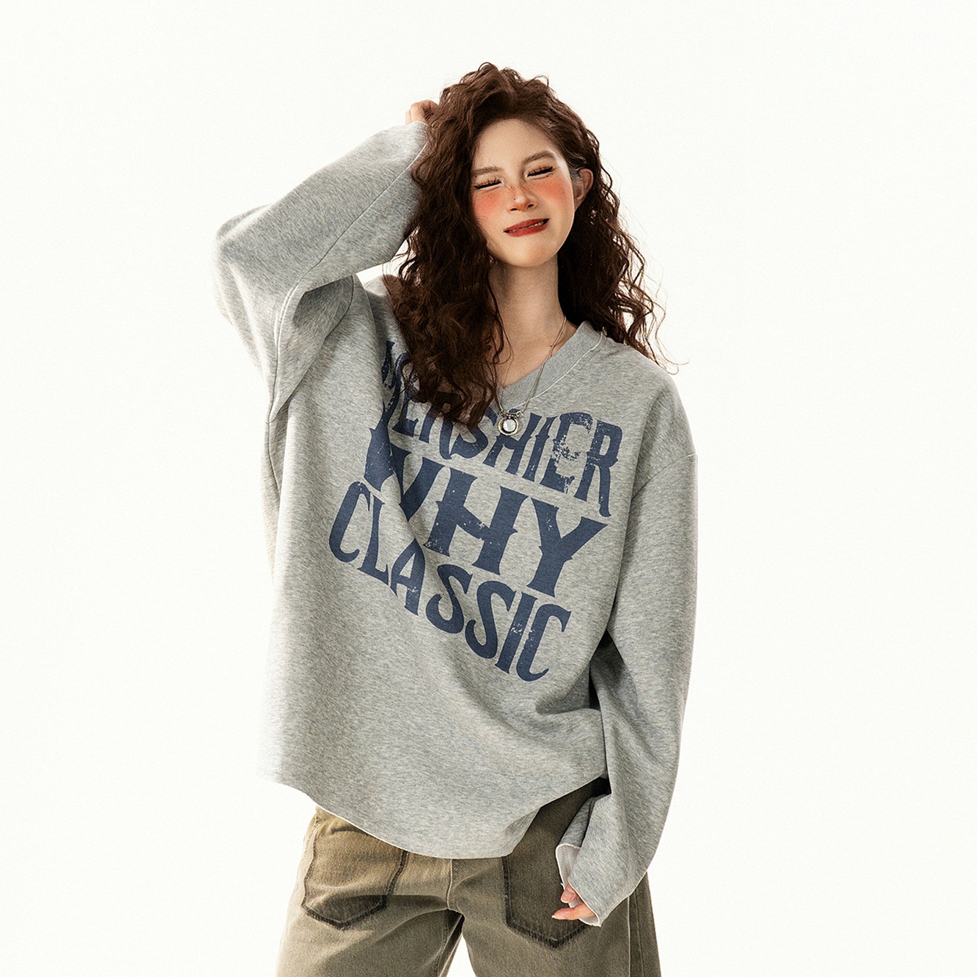 【トップス】アメリカンレトロ ルーズフィット ロゴプリント Vネック スウェット レディース 春秋 カジュアル 万能コーデ パーカー【FCシリーズ】