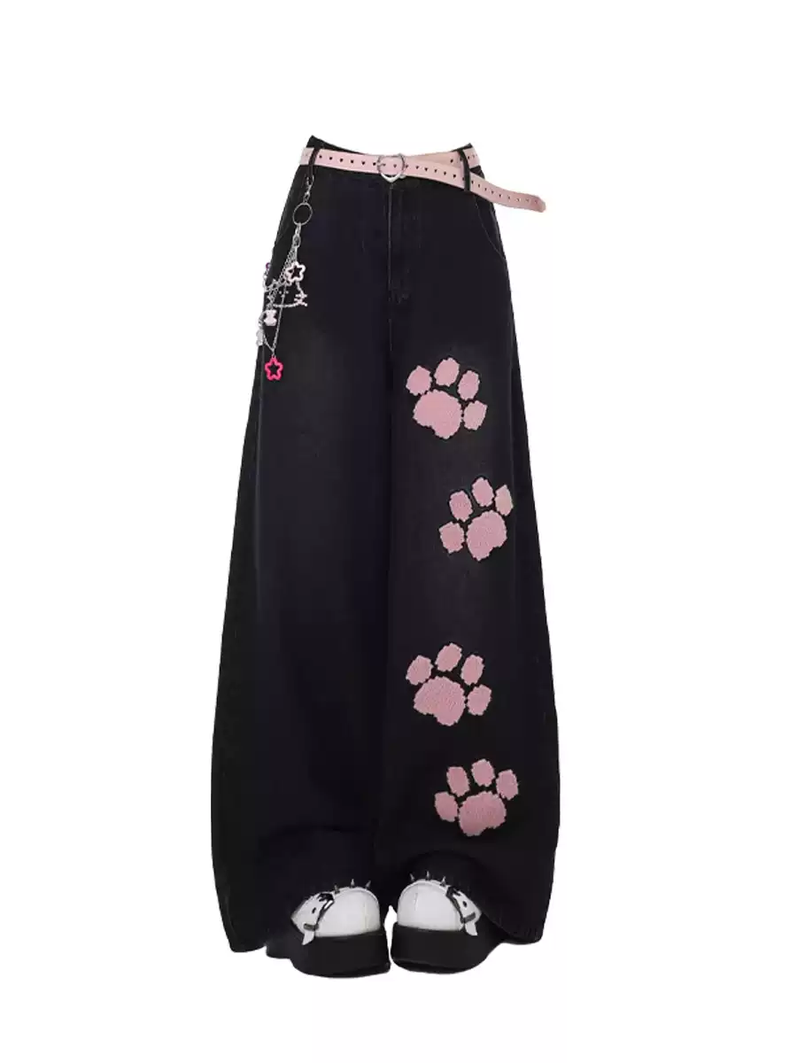 【ボトムス】猫の肉球 刺繍 海外トレンド 合わせやすい ワイドパンツ【FCシリーズ】