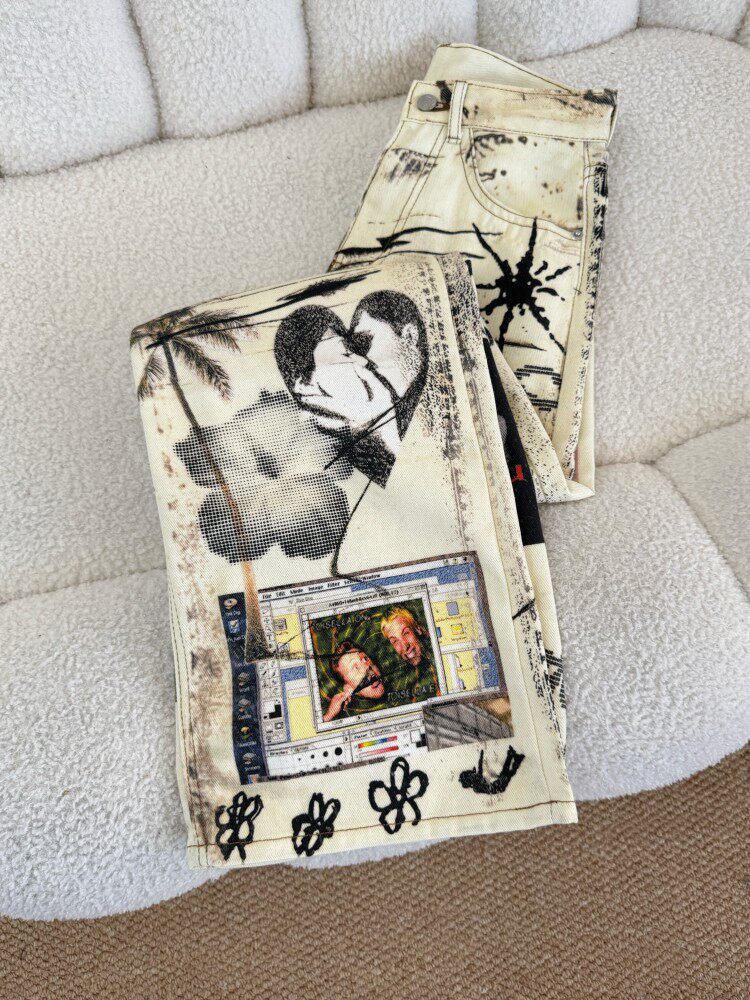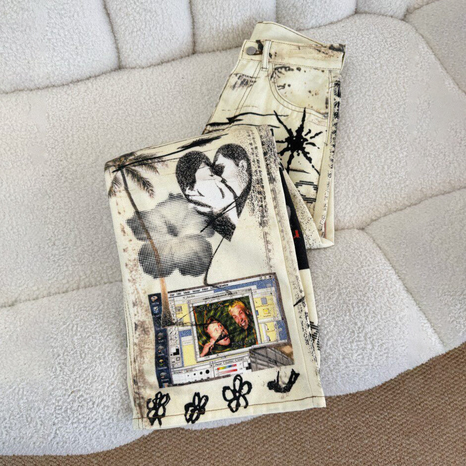 【商品名】【ボトムス】アメリカンストリート ヴィンテージ加工 グラフィティプリント ウォッシュド ワイドデニムパンツ ユニセックス【SHシリーズ】