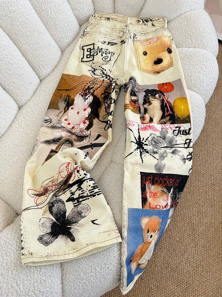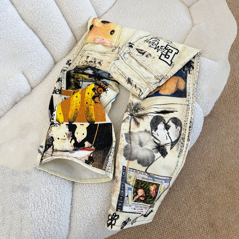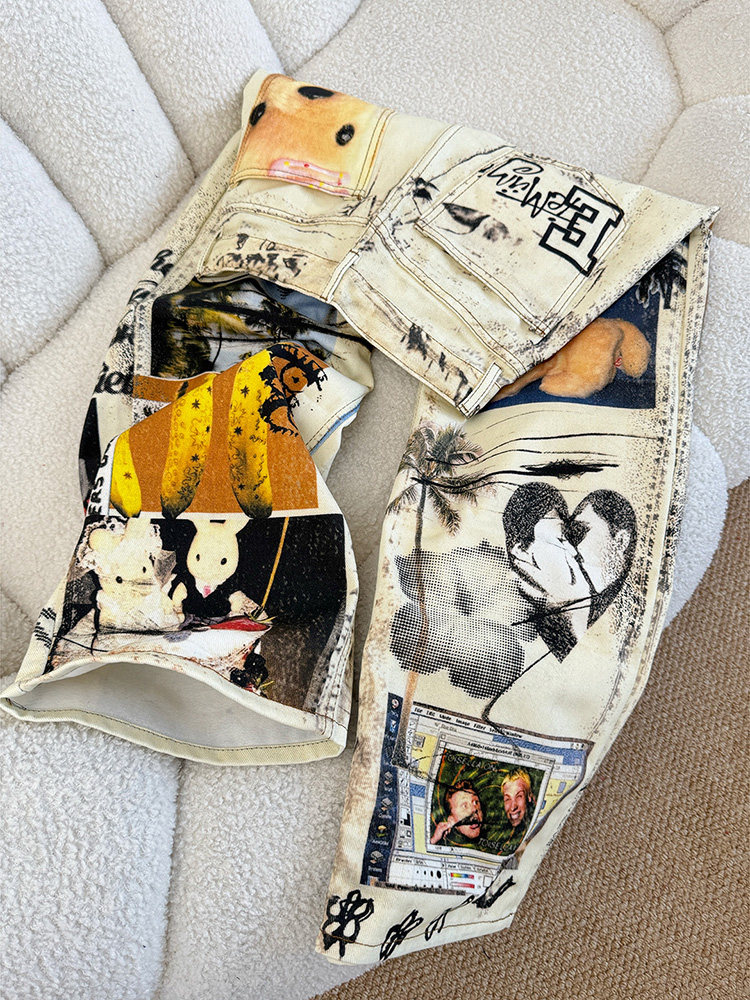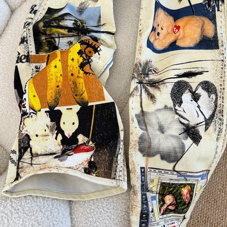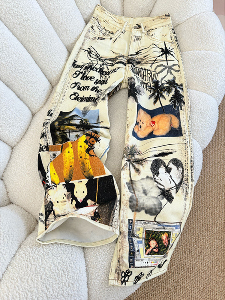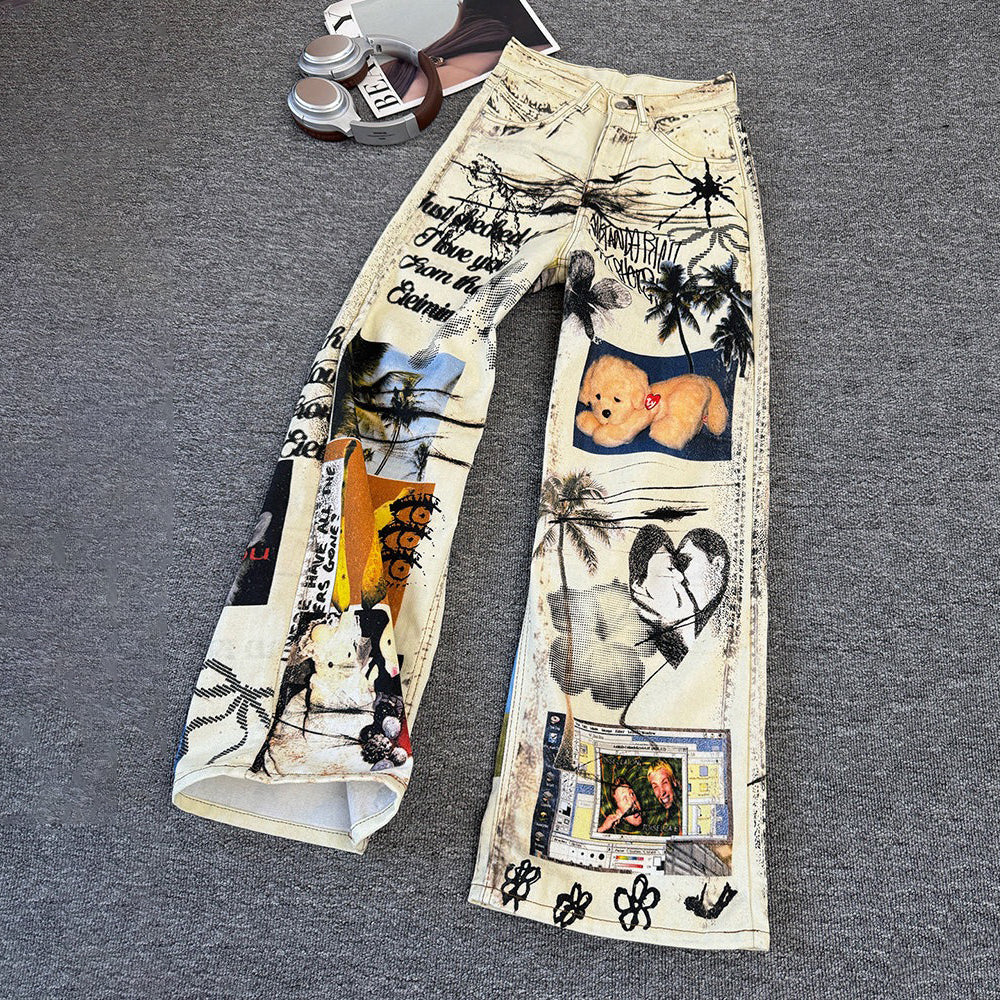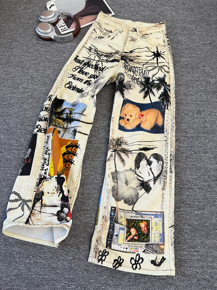 【ボトムス】アメリカンストリート ヴィンテージ加工 グラフィティプリント ウォッシュド ワイドデニムパンツ ユニセックス【SHシリーズ】