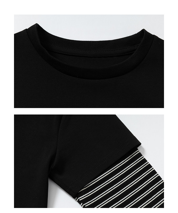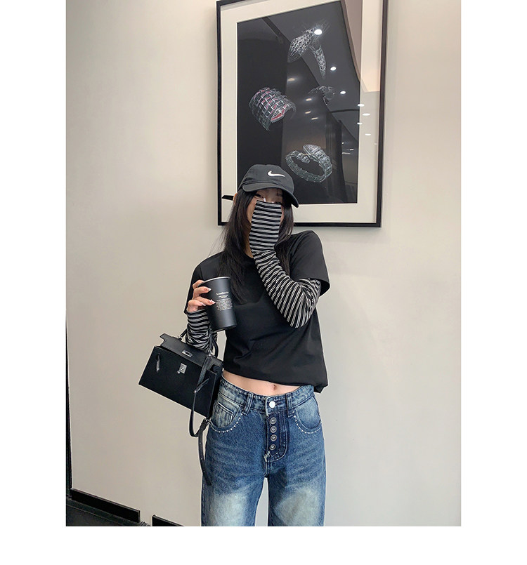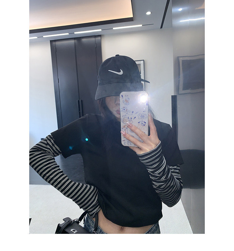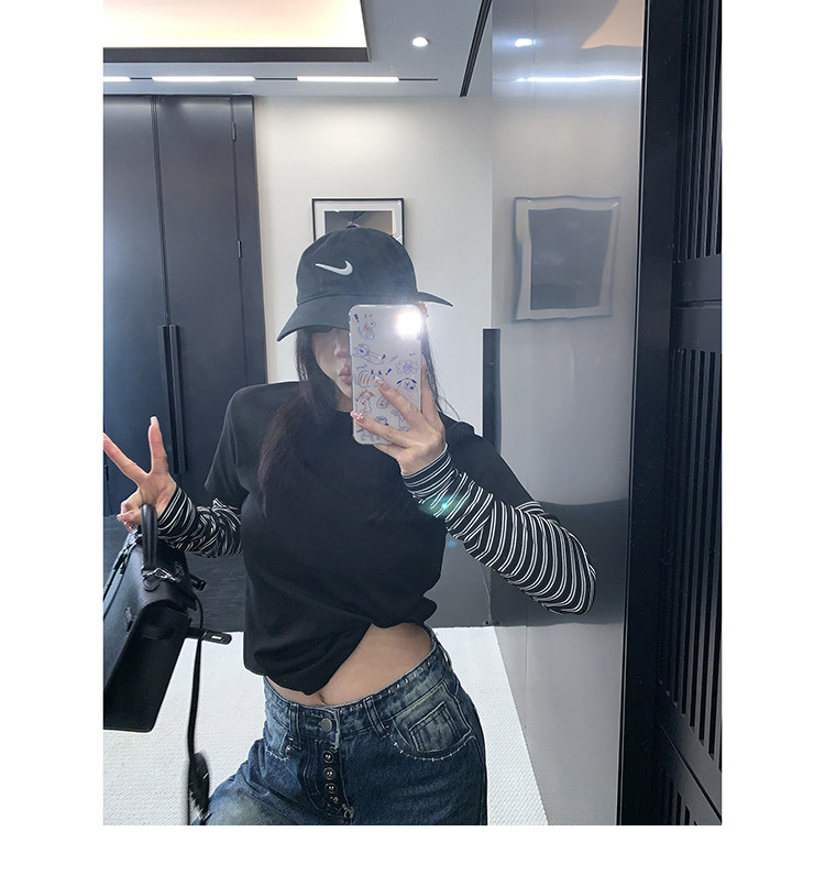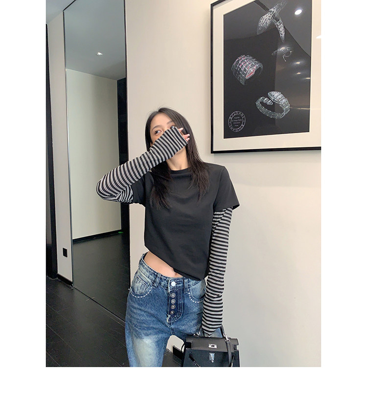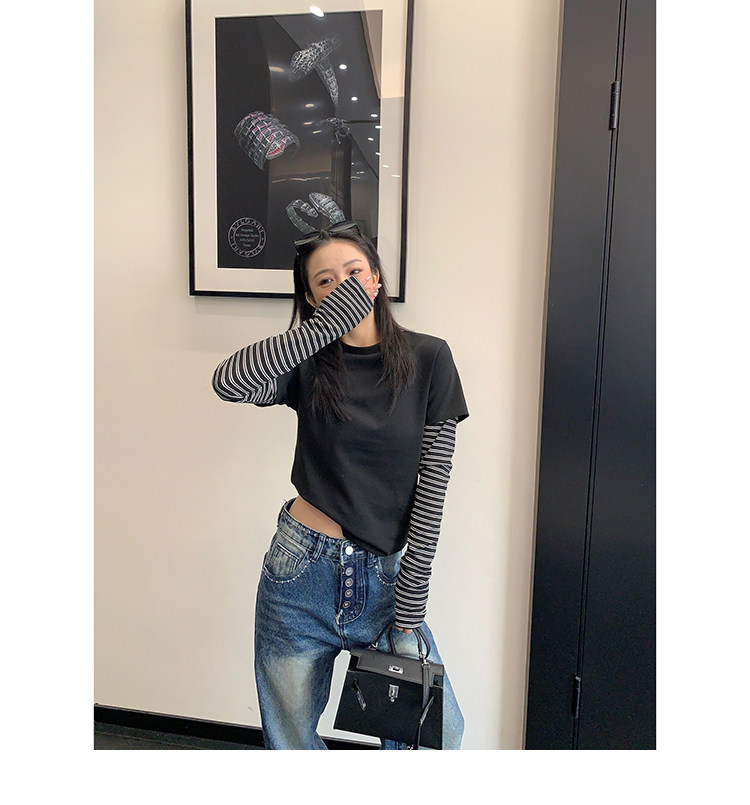 【トップス】タイト ショート丈 レイヤード風 ブラック 長袖 Tシャツ レディース トレンド【FCシリーズ】