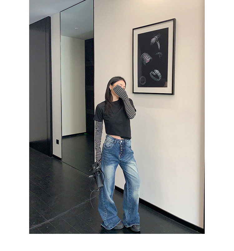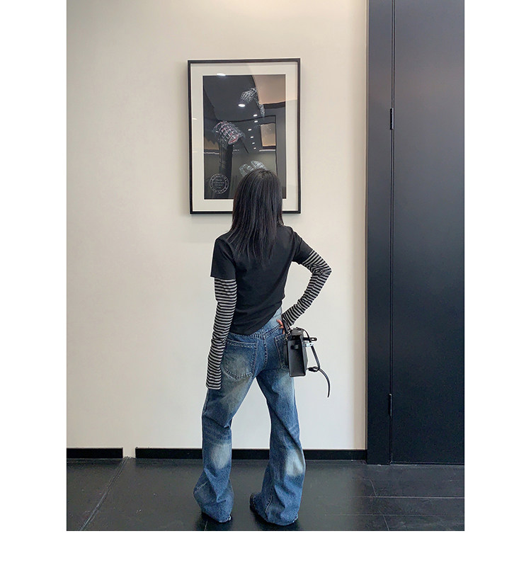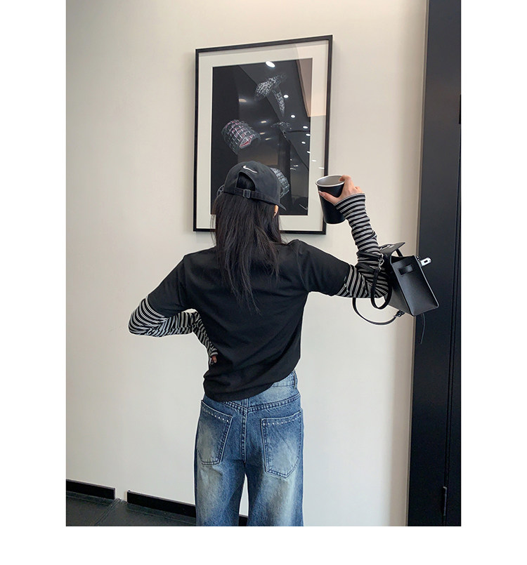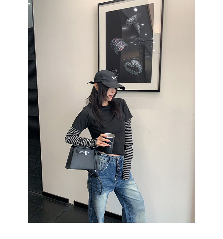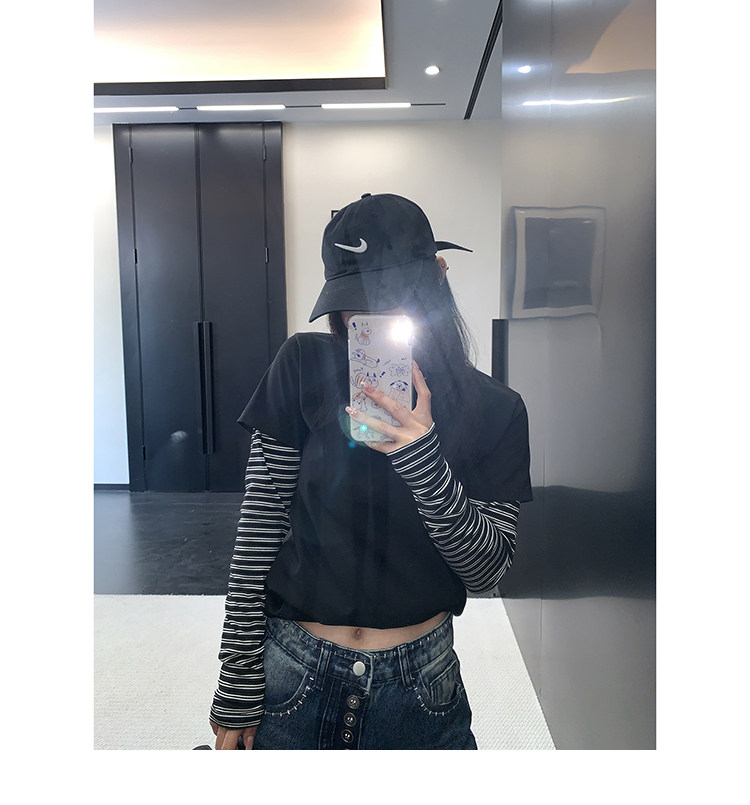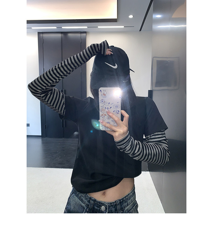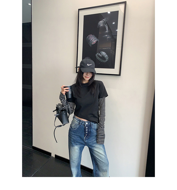 【トップス】タイト ショート丈 レイヤード風 ブラック 長袖 Tシャツ レディース トレンド【FCシリーズ】
