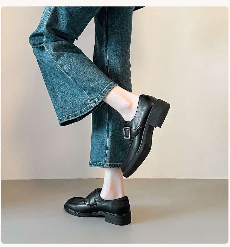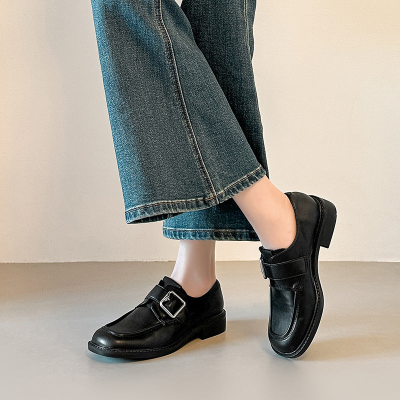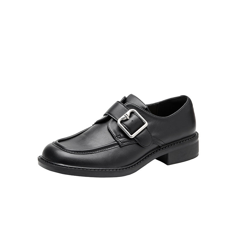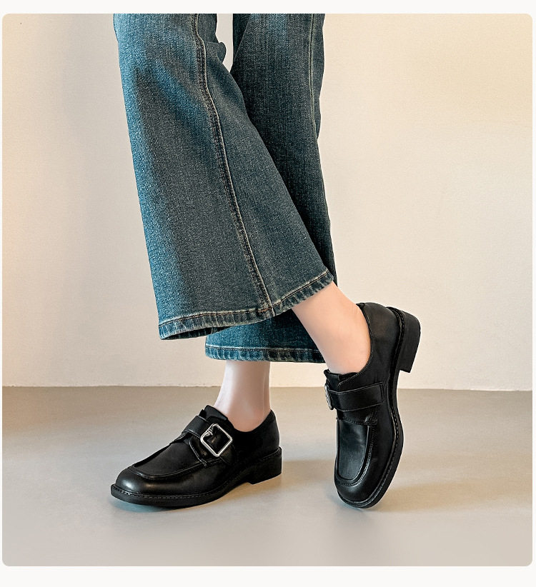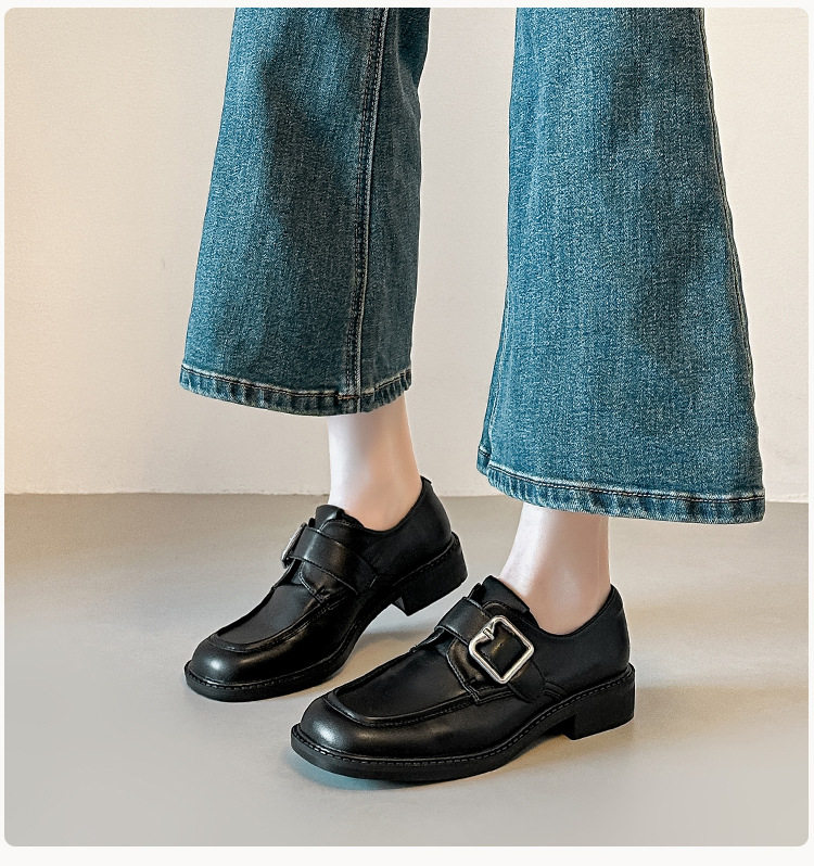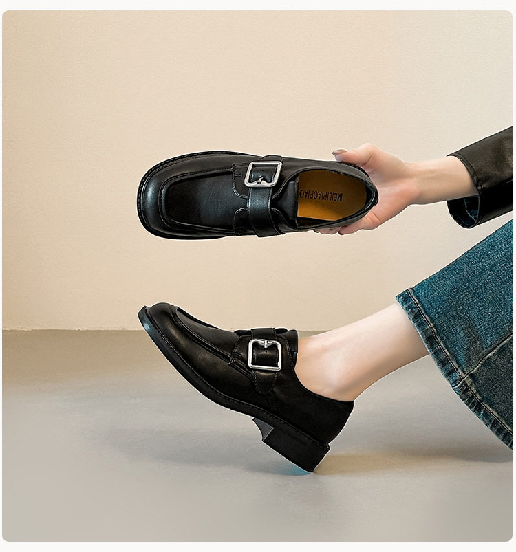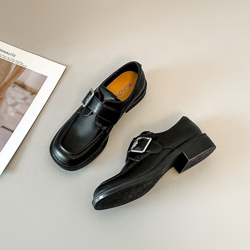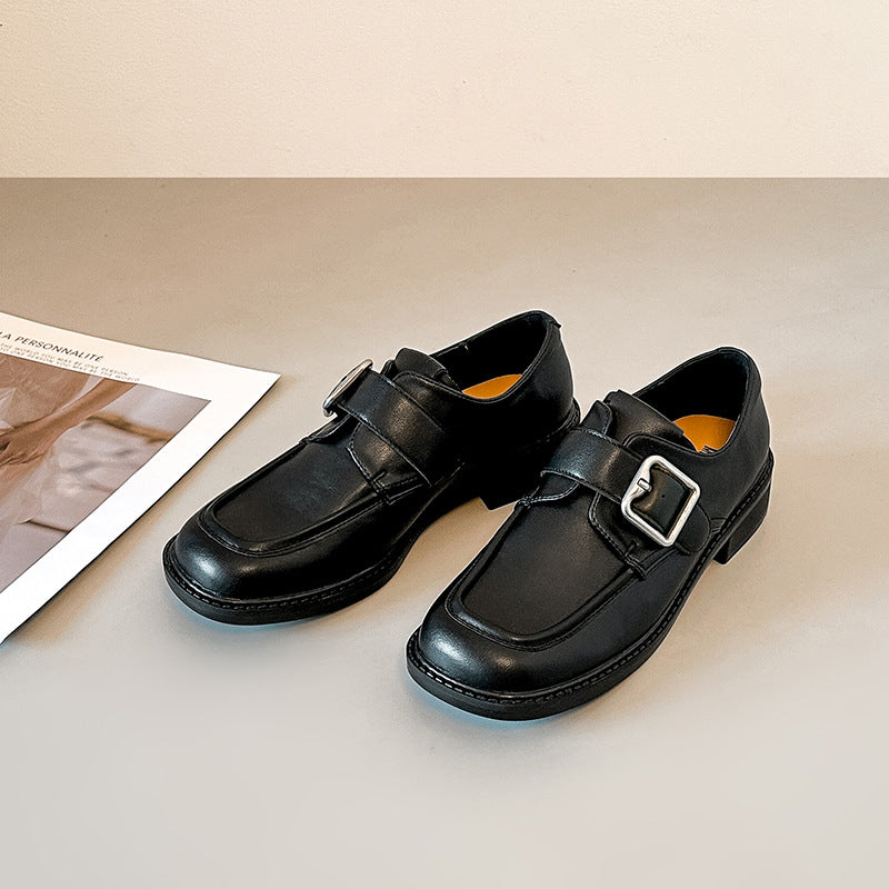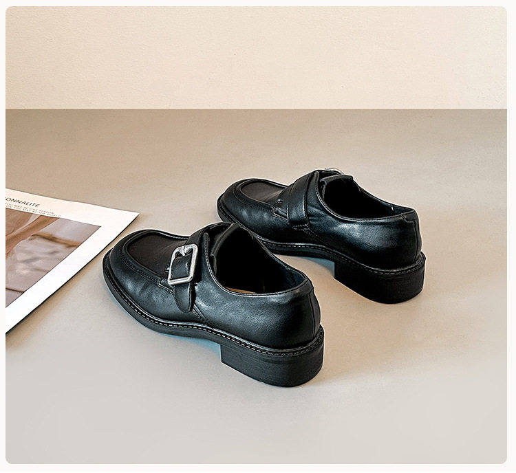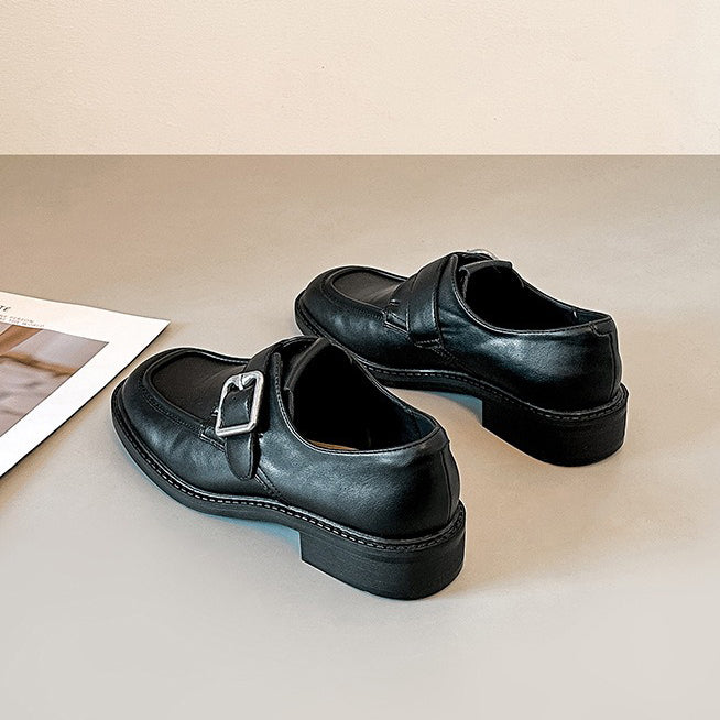 【シューズ】スクエアトゥ ベルトバックル 新作 太ヒール 学院風 ローファー ラクラク着用 シューズ お靴 パンプス