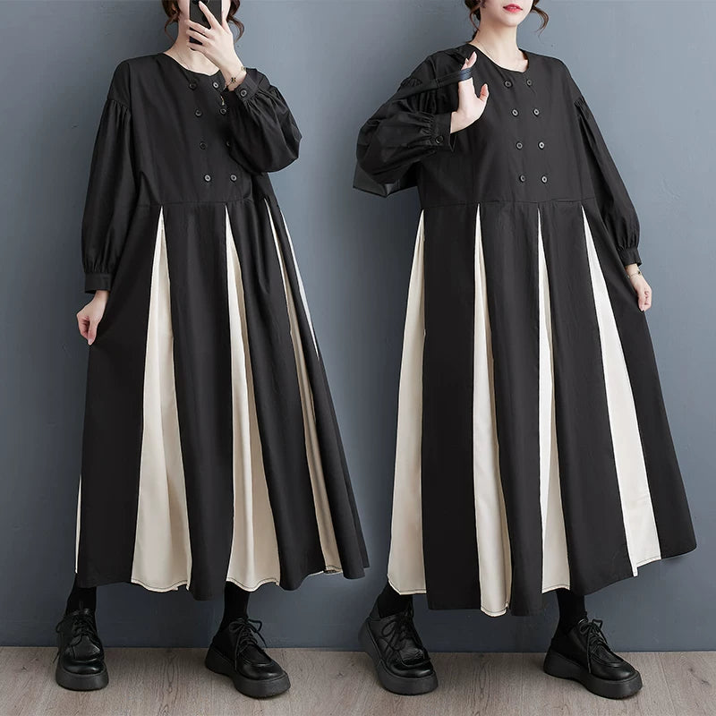 期間限定⭐️60%OFF【ワンピース】春秋新作 韓国風 ボリューム袖 モノトーン切り替え ダブルボタン 長袖ワンピース きれいめカジュアル【AHシリーズ】