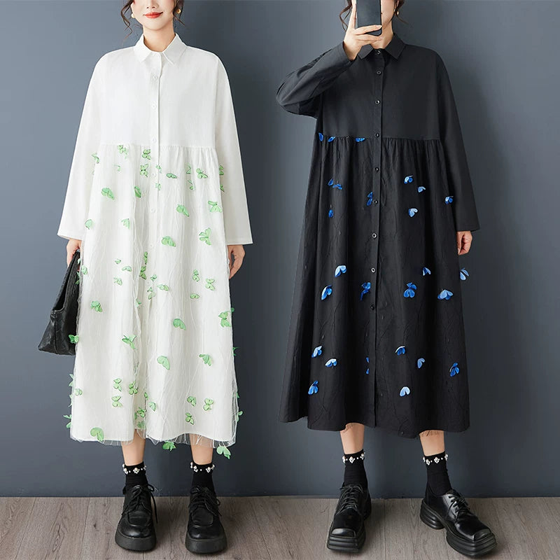期間限定⭐️60%OFF【ワンピース】春秋新作 ワイドシルエット 大きいサイズ 刺繍アクセント 切り替えシャツワンピース 長袖【AHシリーズ】