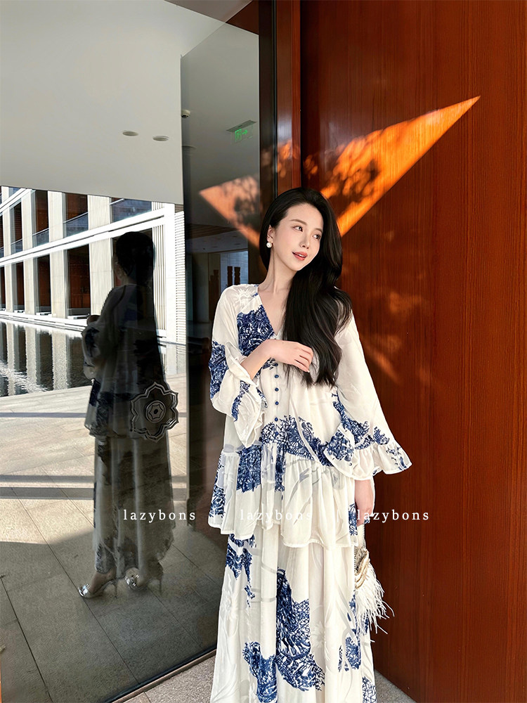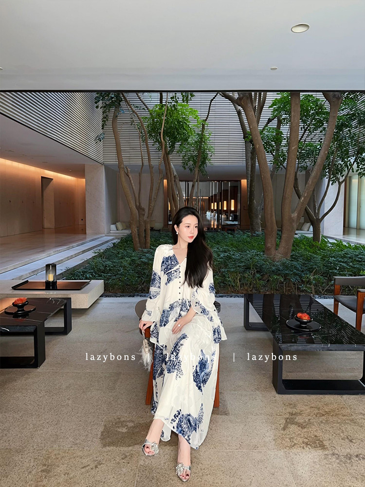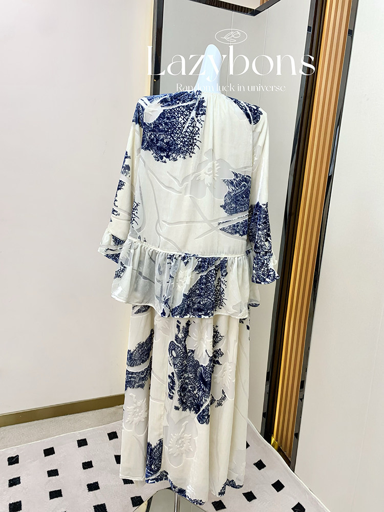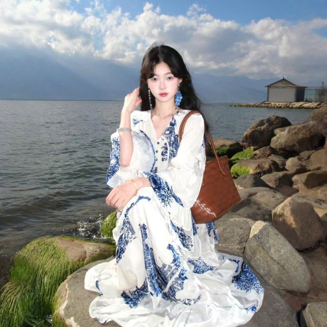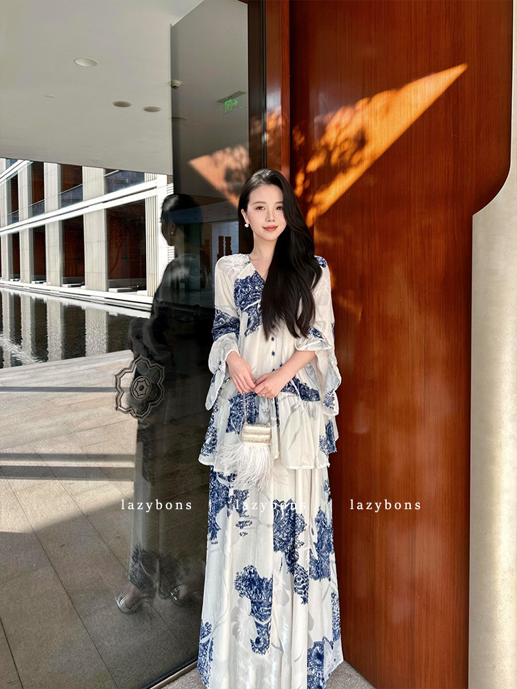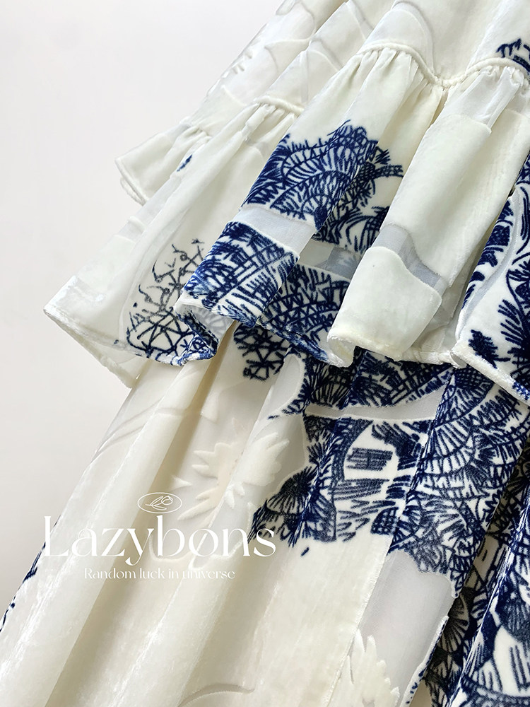 【ワンピース】チャイナテイスト ブルーホワイト柄 フリル フレア 長袖 ワンピース 【SHシリーズ】