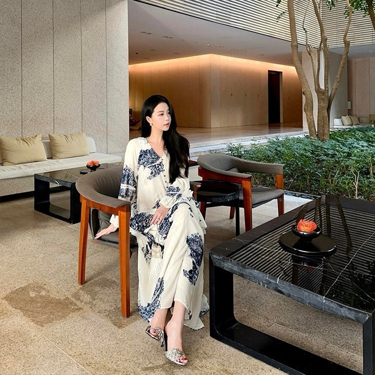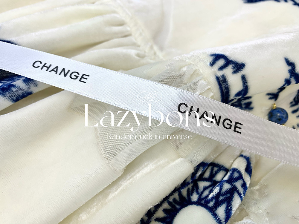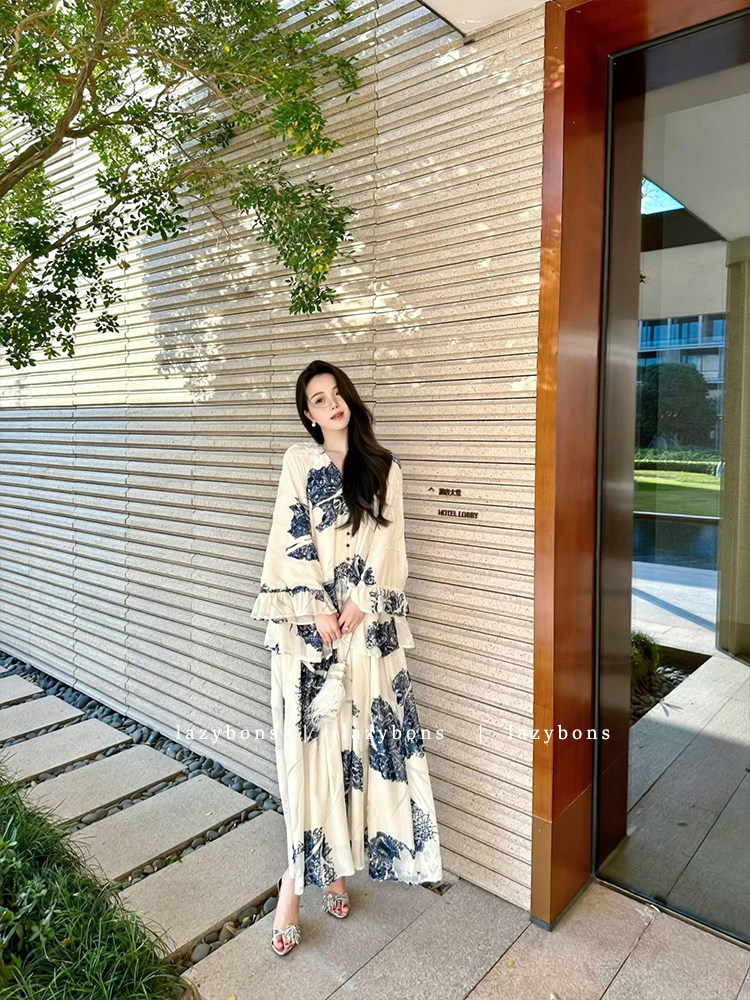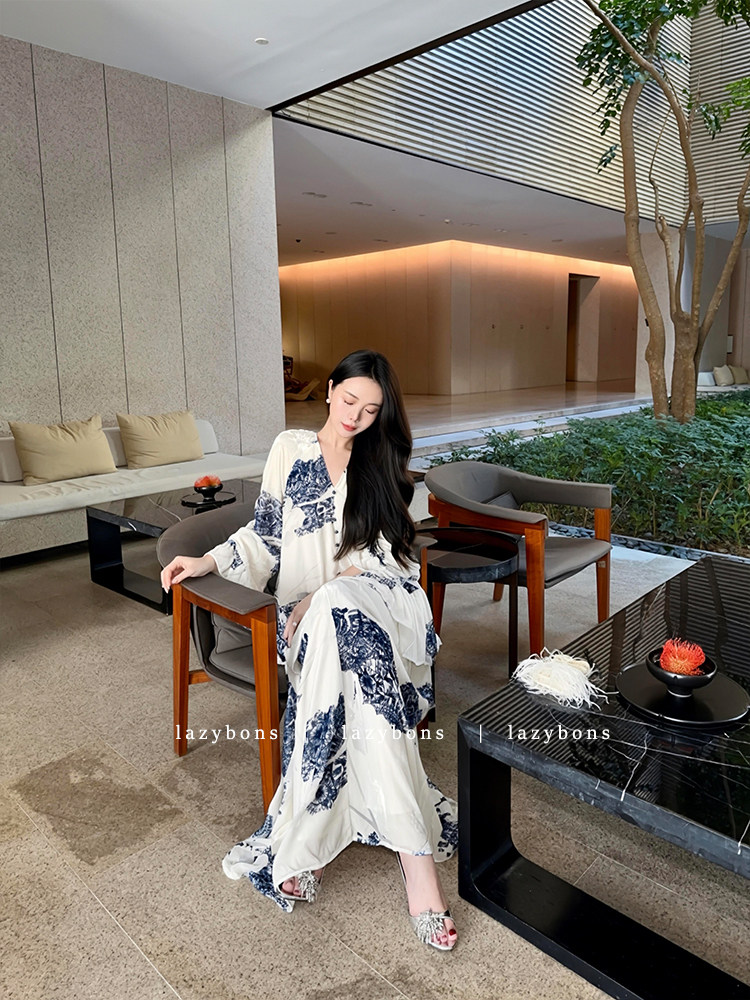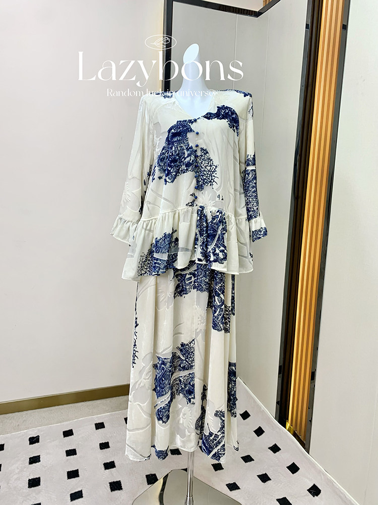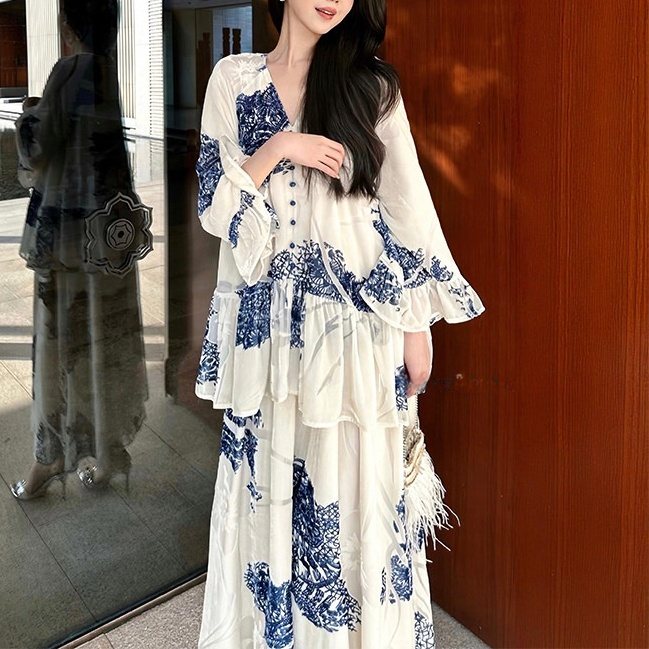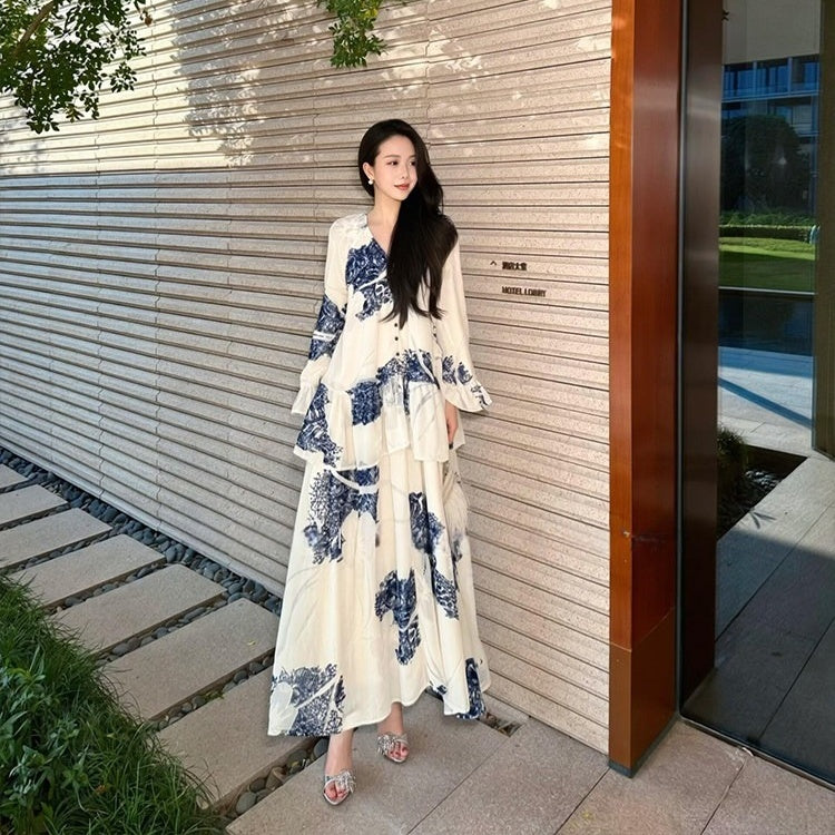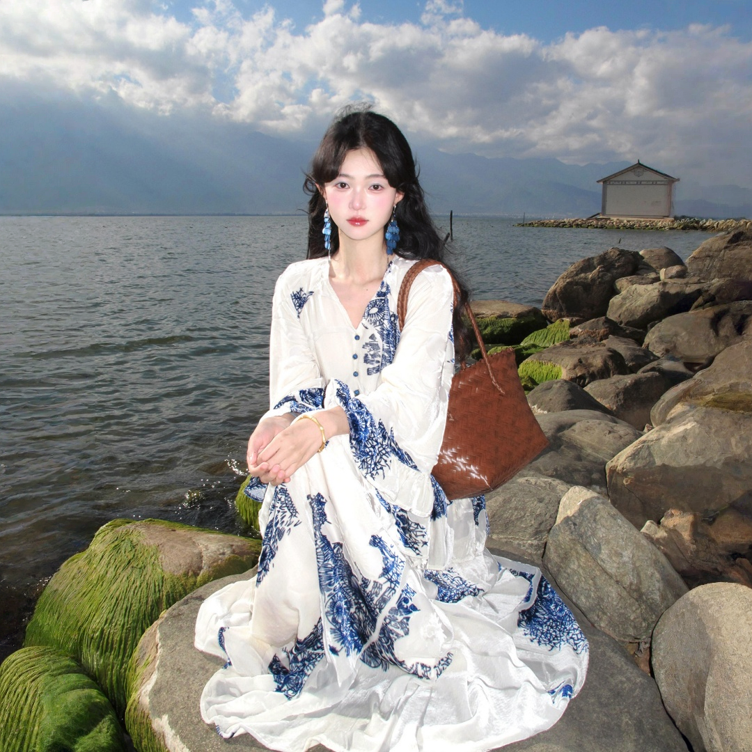 【ワンピース】チャイナテイスト ブルーホワイト柄 フリル フレア 長袖 ワンピース 【SHシリーズ】