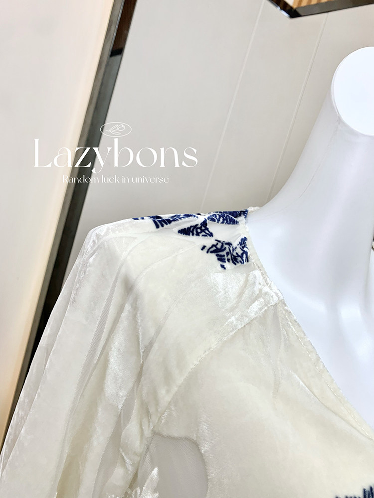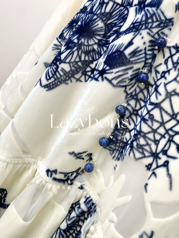 【商品名】【ワンピース】チャイナテイスト ブルーホワイト柄 フリル フレア 長袖 ワンピース 【SHシリーズ】