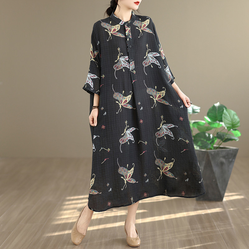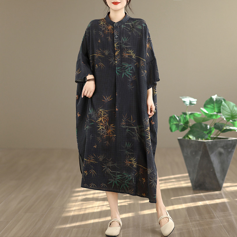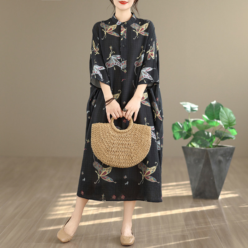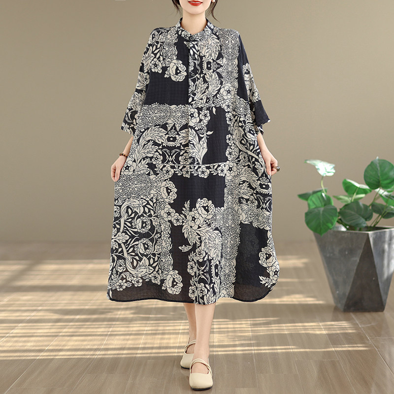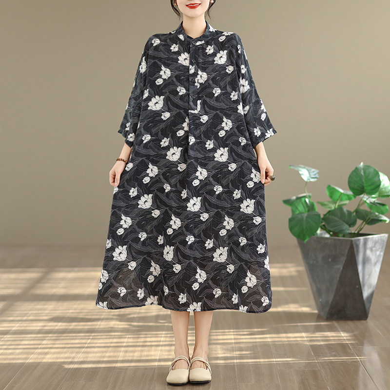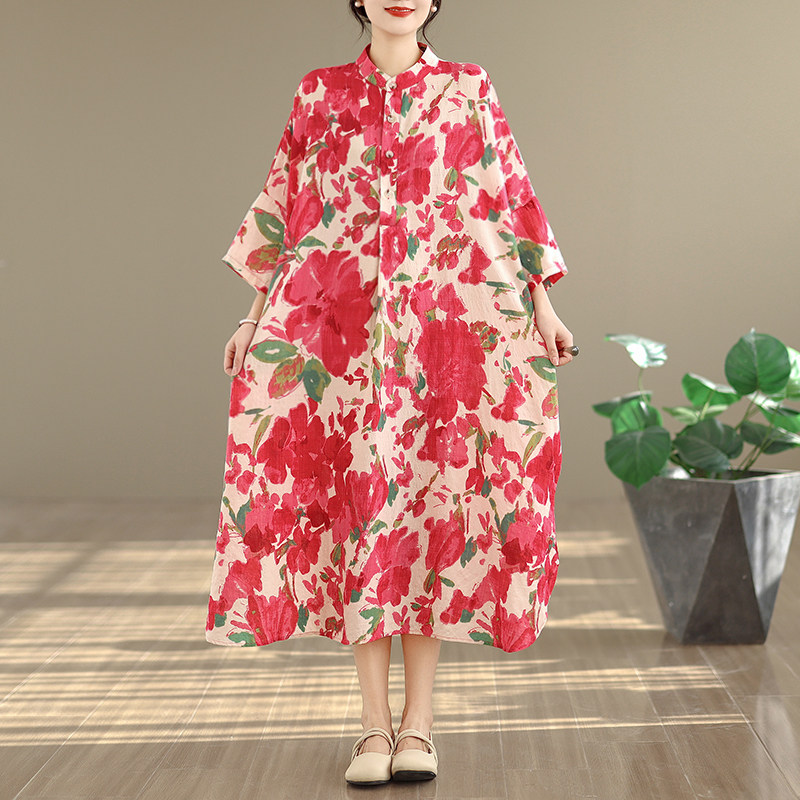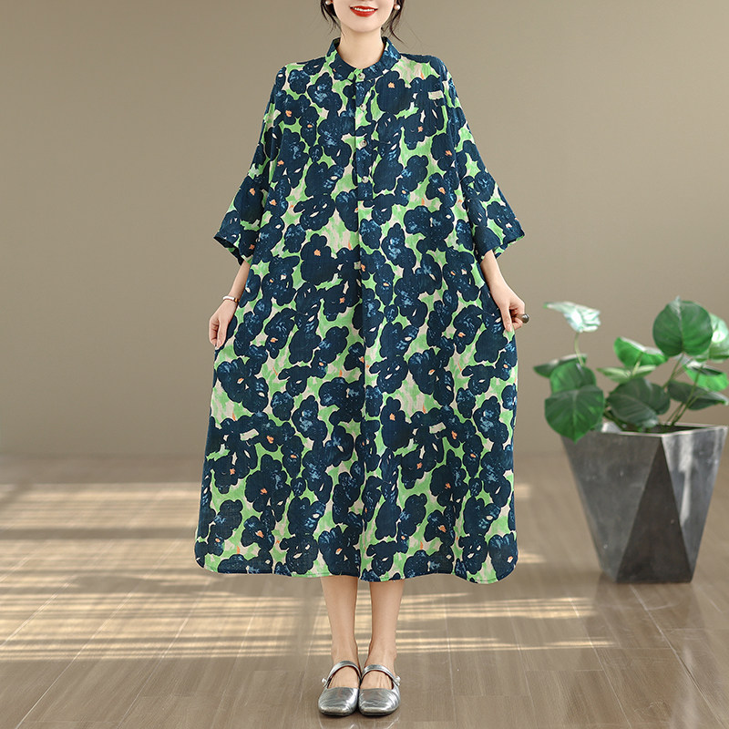 期間限定⭐️60%OFF【ワンピース】コットンリネン プリント 立ち襟 花柄 7分袖 ワンピース 【SHシリーズ】