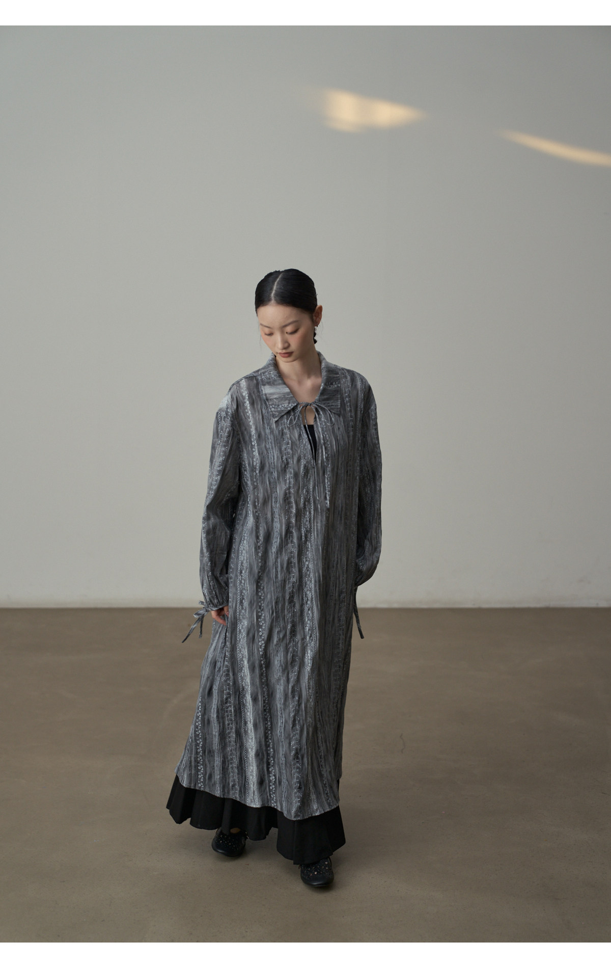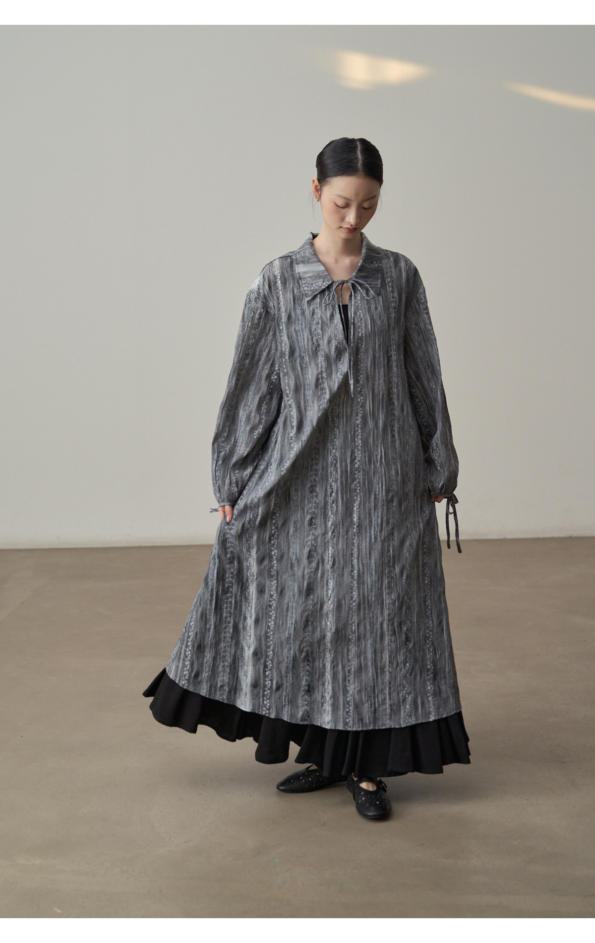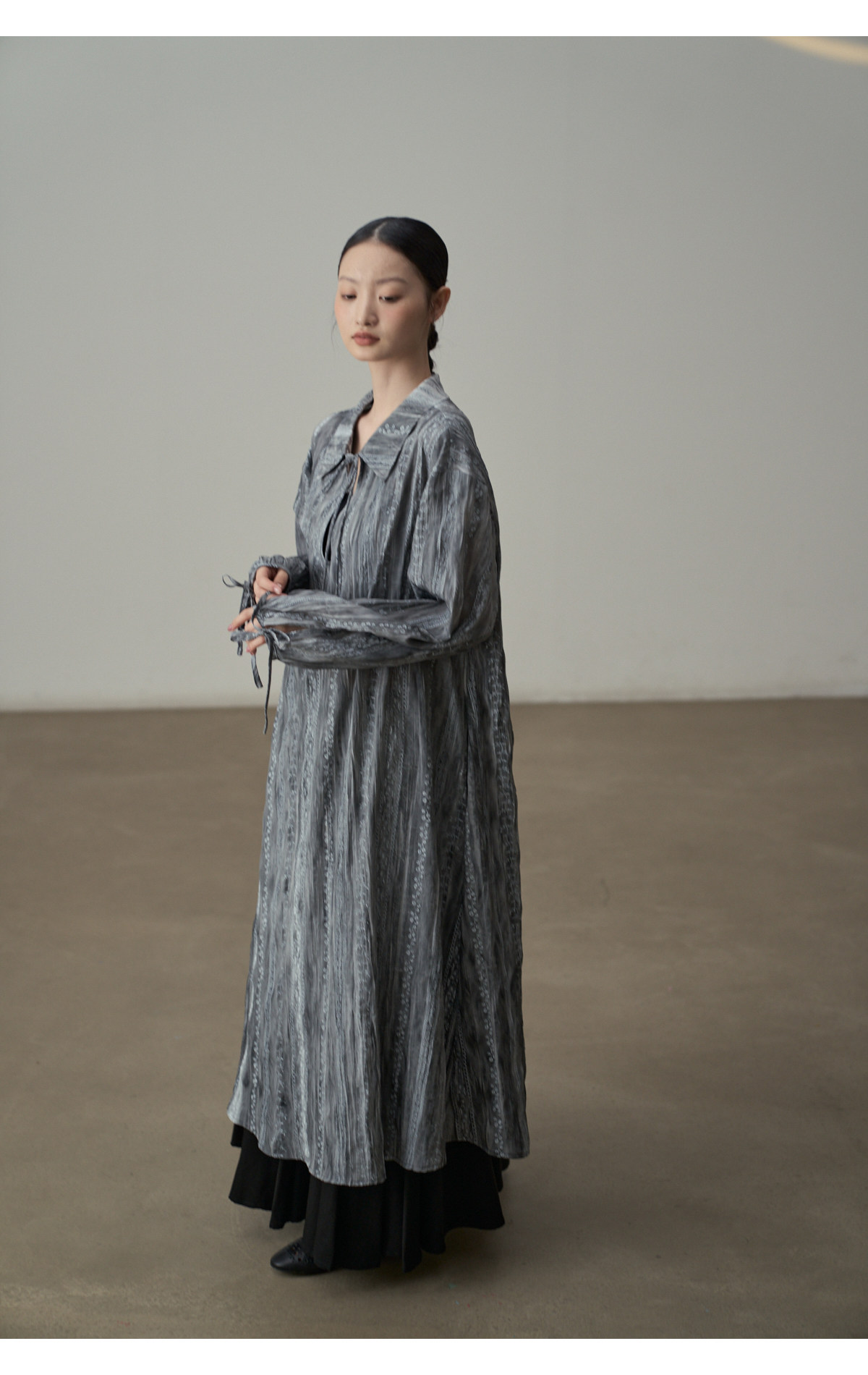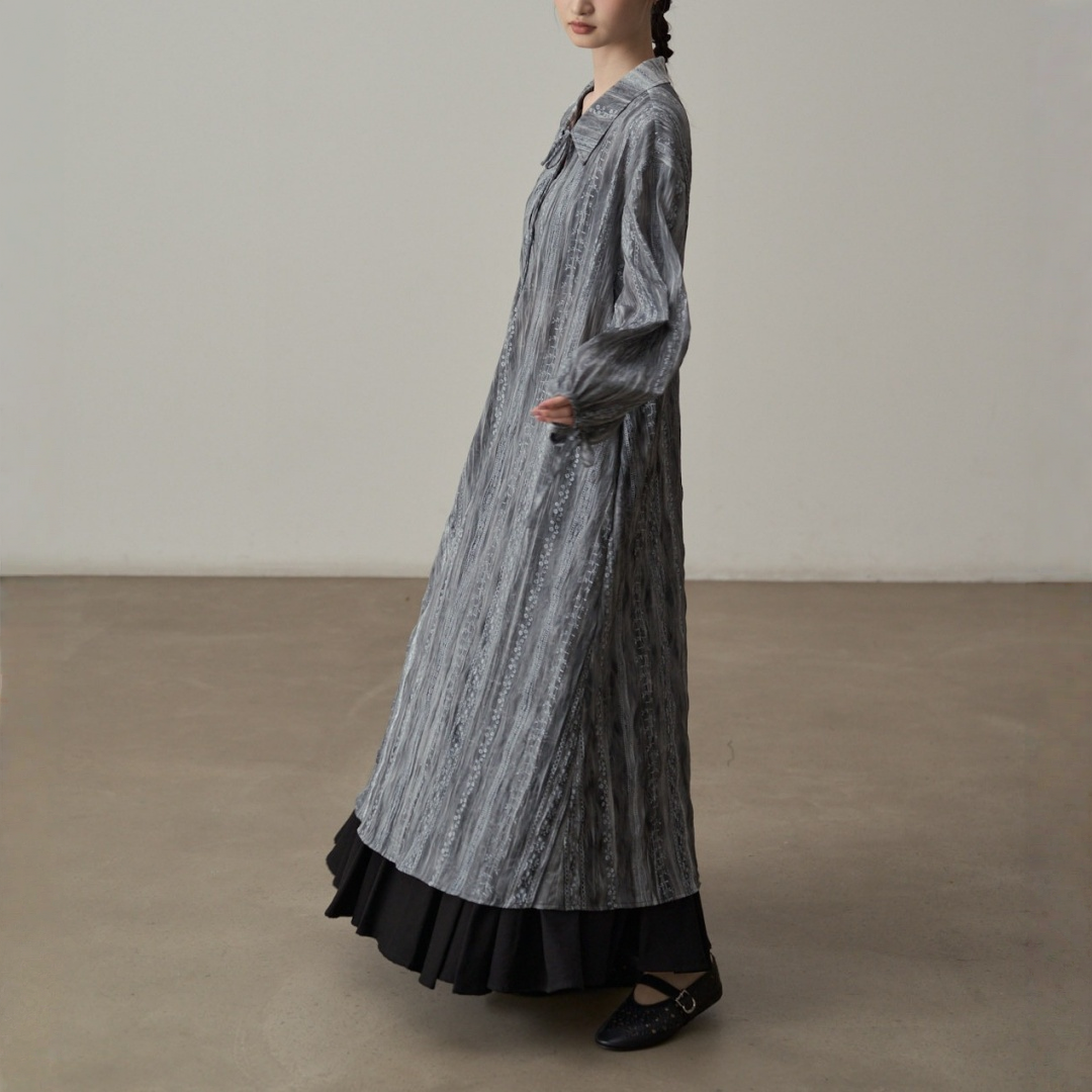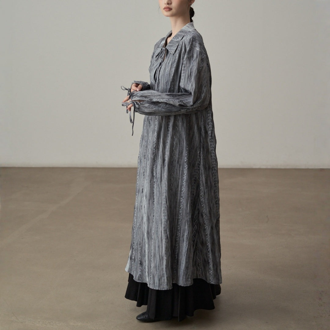 【ワンピース】春秋新作 ワイドシルエット ダークテイスト プリーツデザイン チュールレイヤード 長袖ワンピース トレンチ ロング丈 モード系【AHシリーズ】