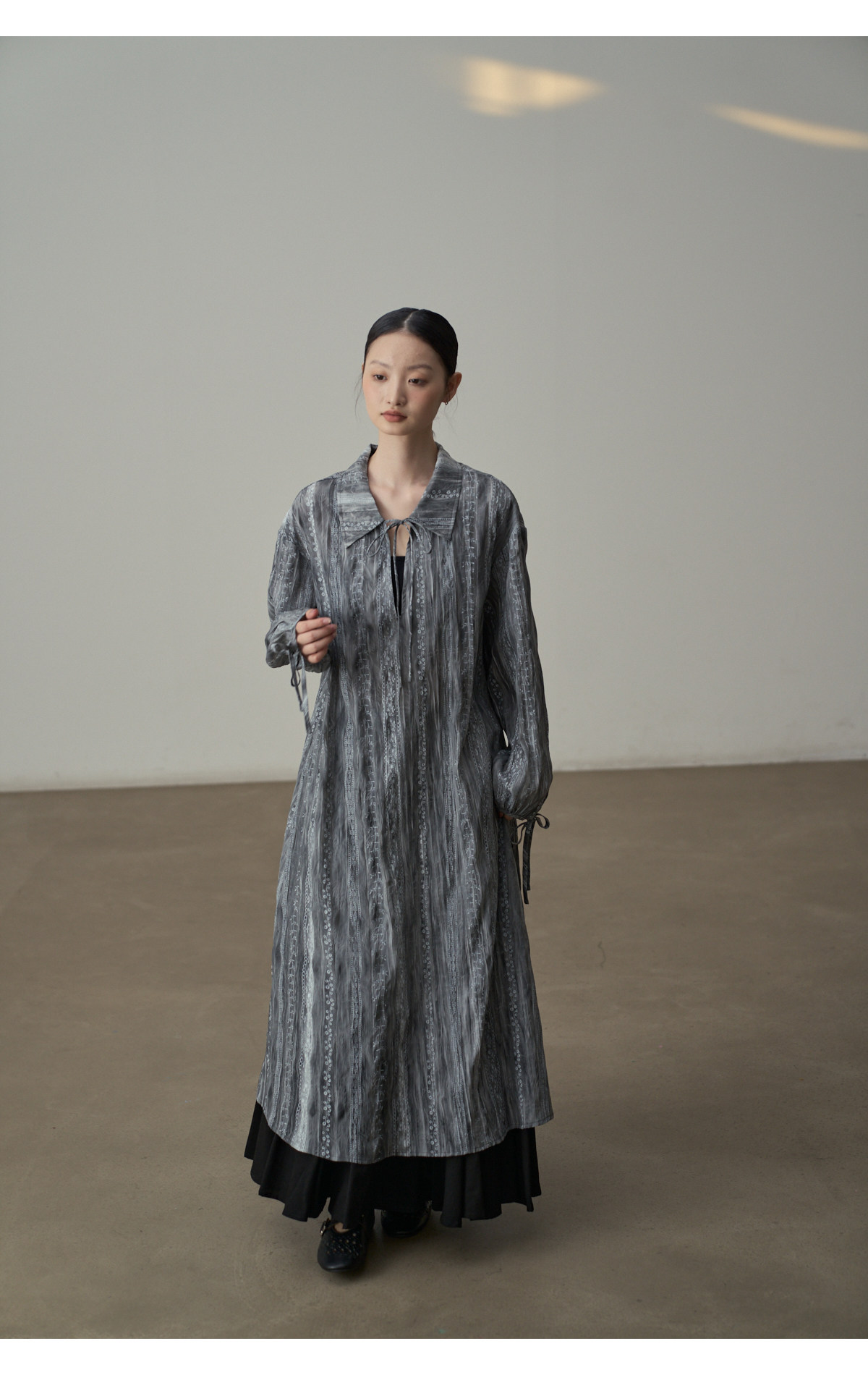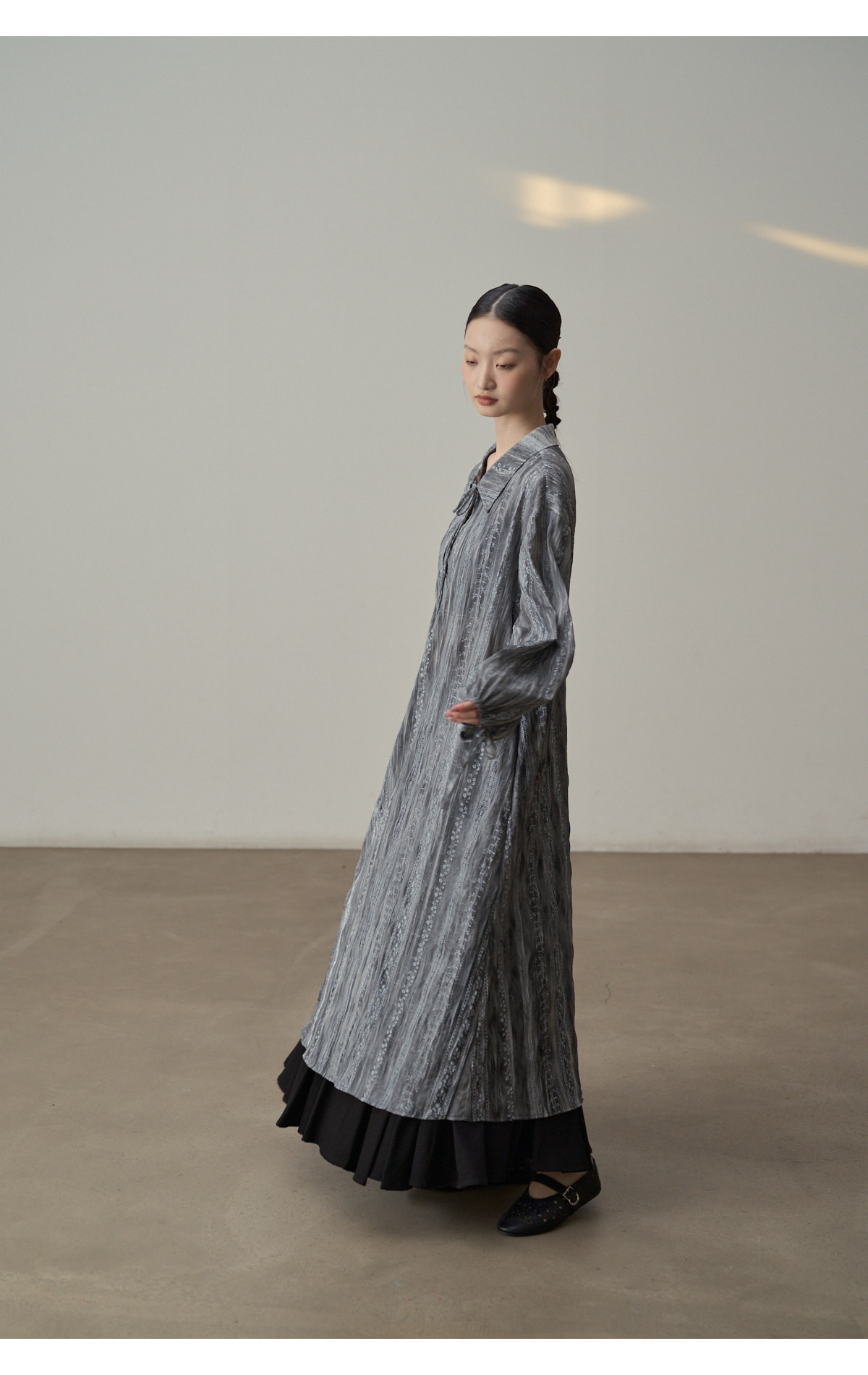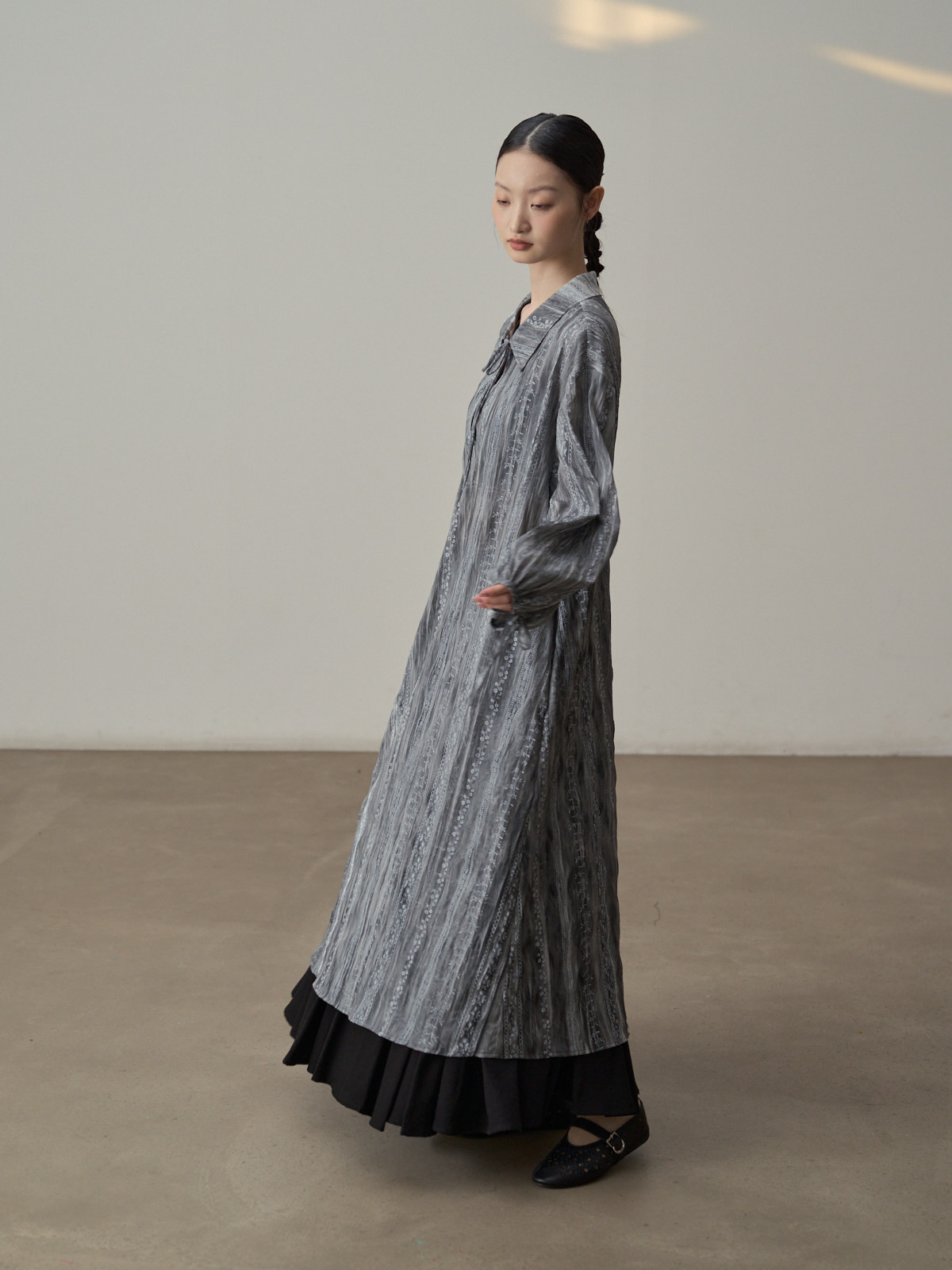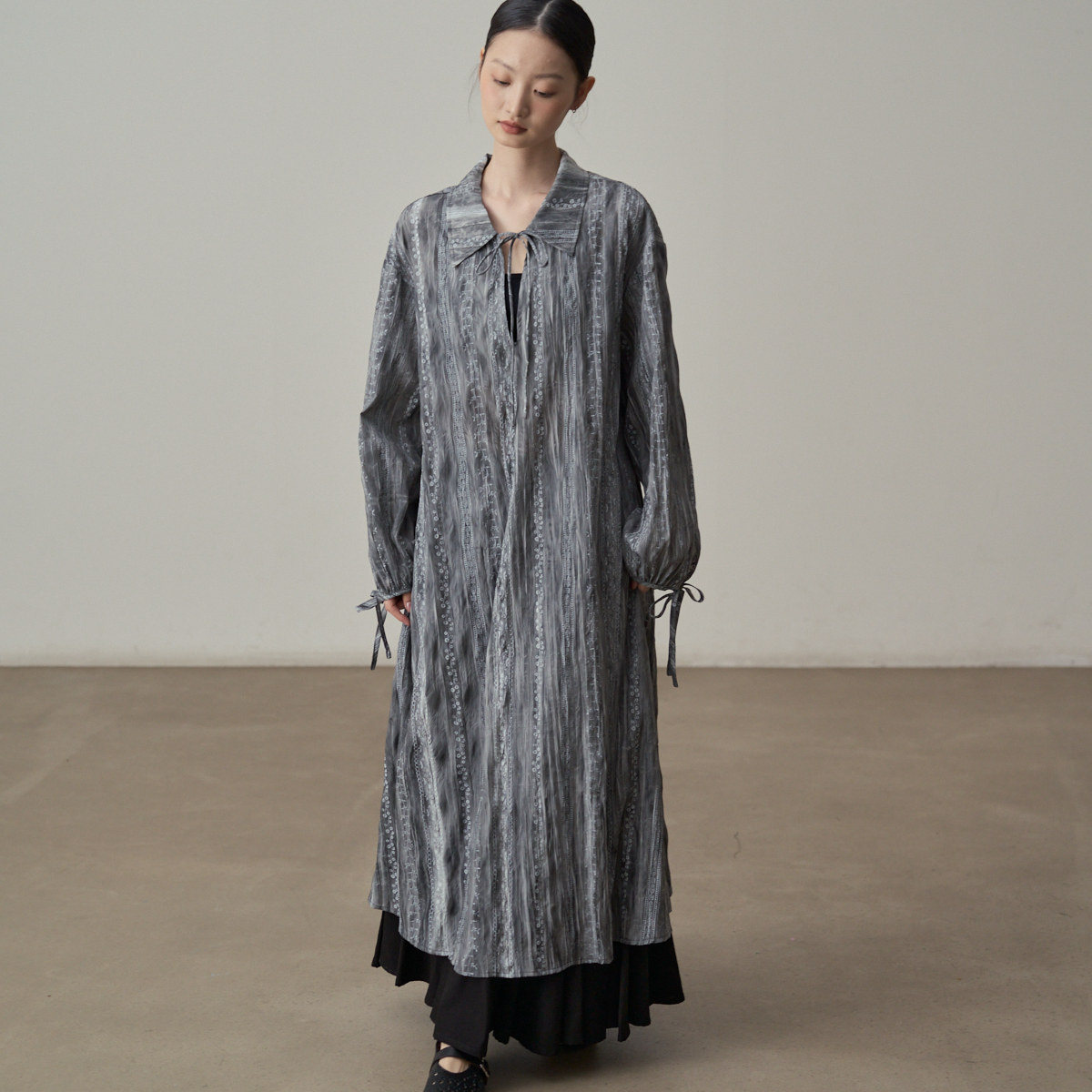 【ワンピース】春秋新作 ワイドシルエット ダークテイスト プリーツデザイン チュールレイヤード 長袖ワンピース トレンチ ロング丈 モード系【AHシリーズ】