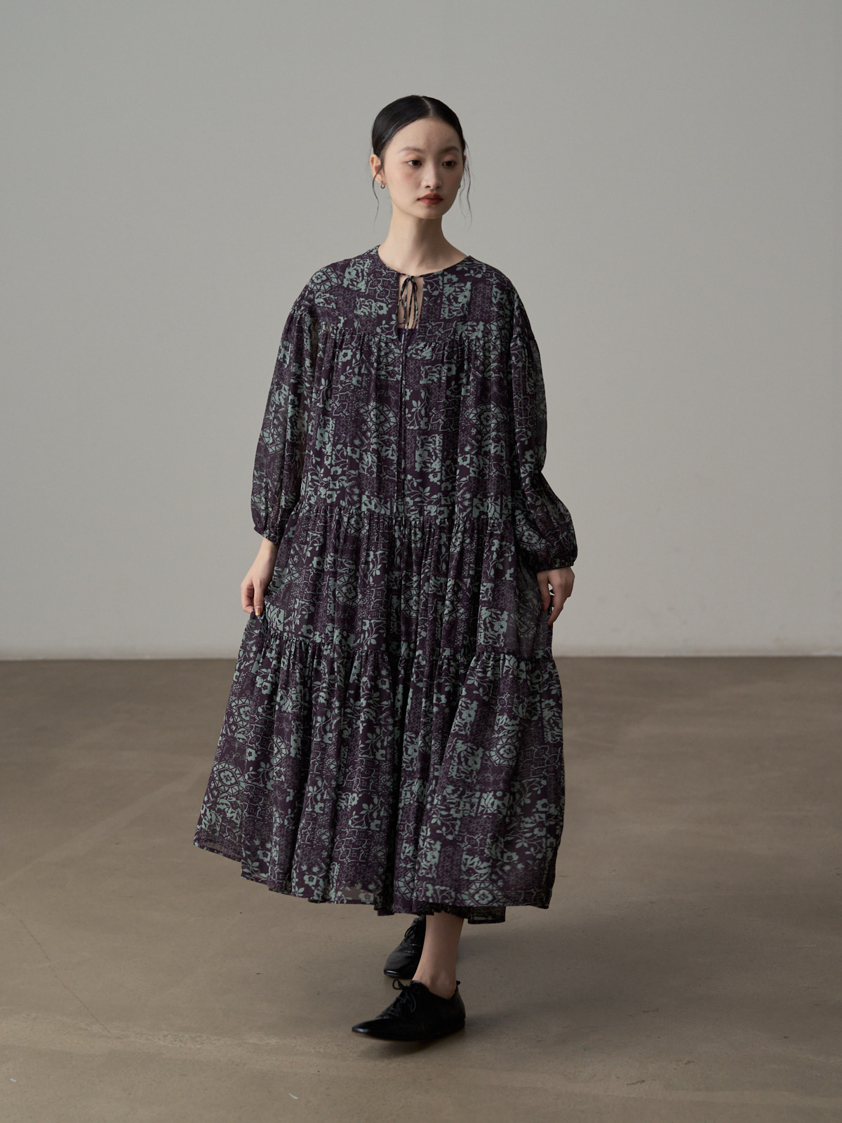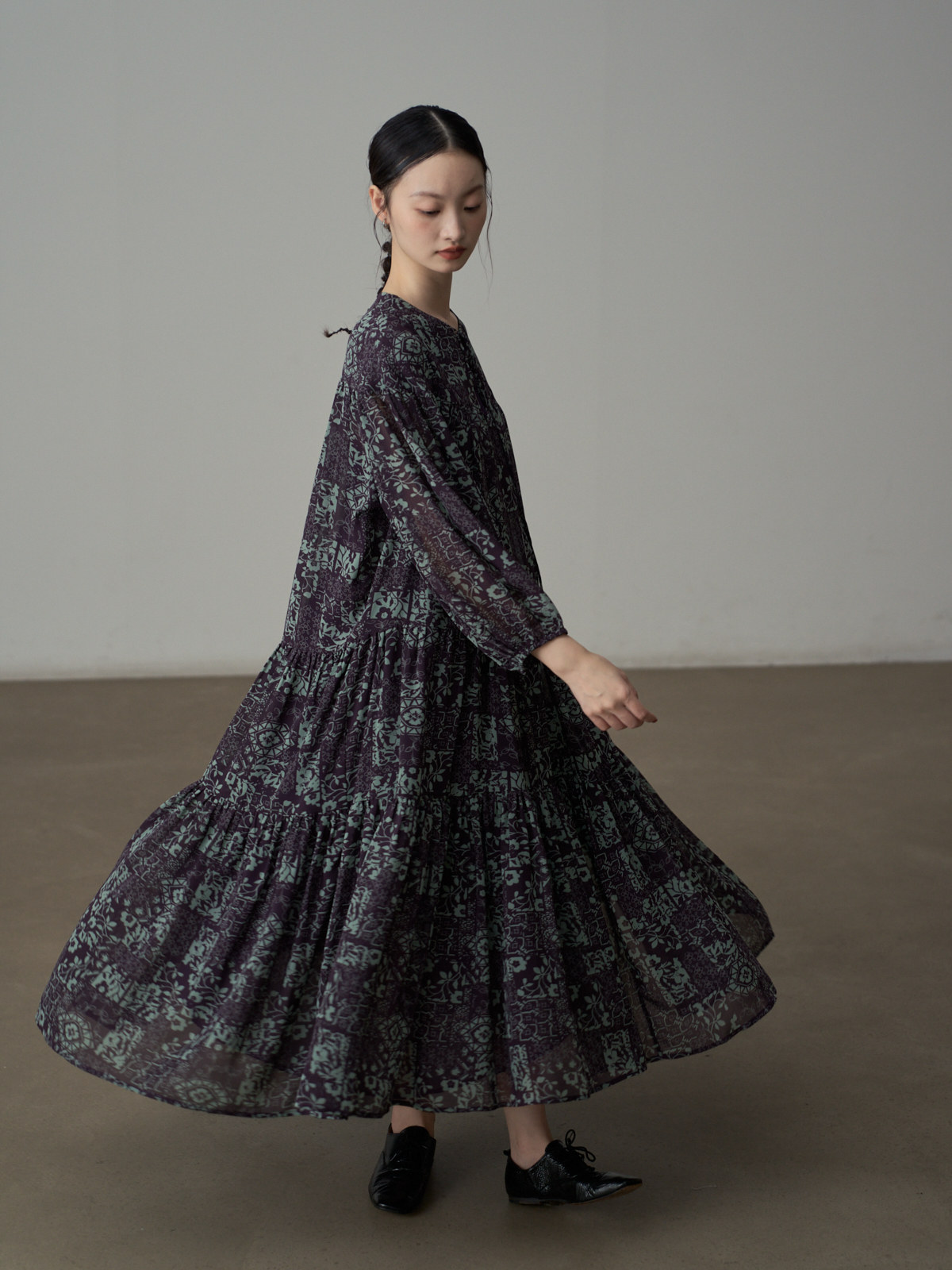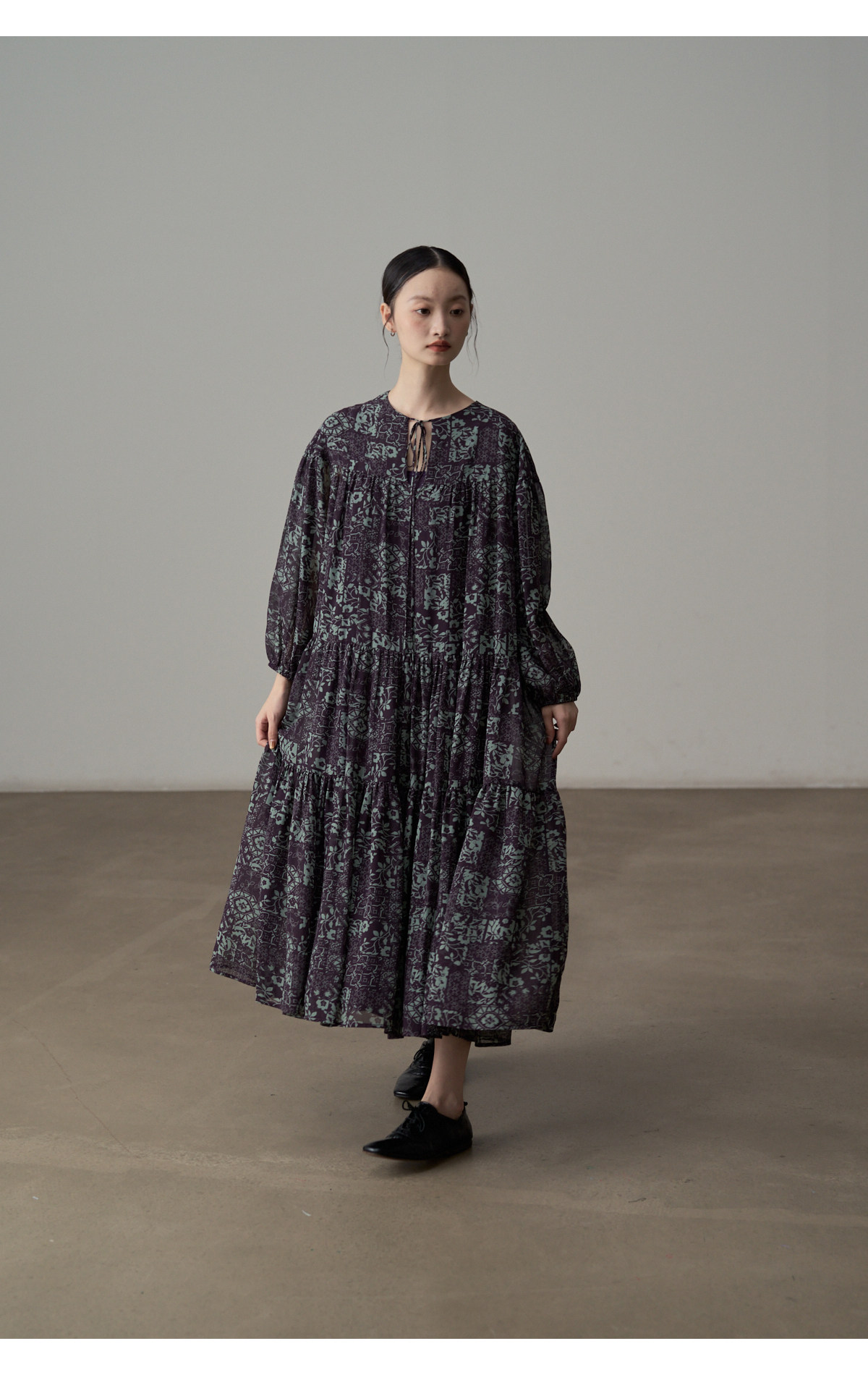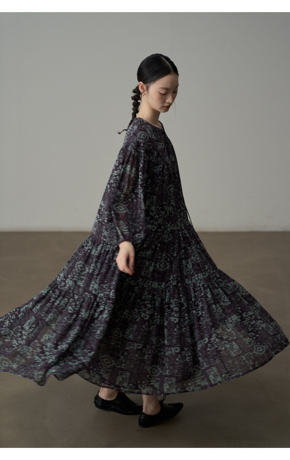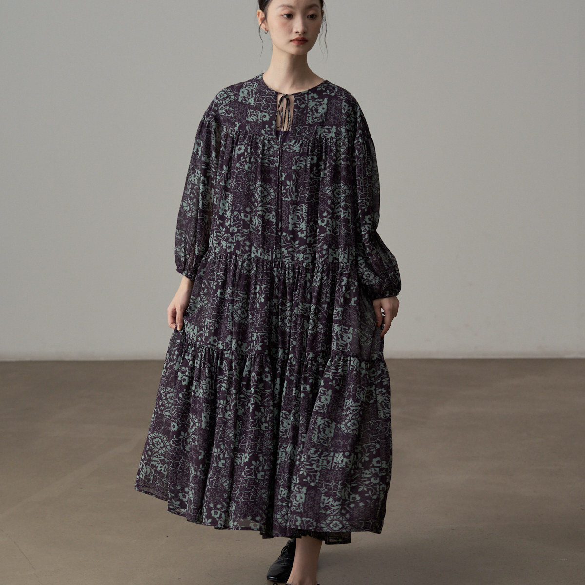 【ワンピース】チャイナテイスト ブルーホワイト柄 フリル フレア 長袖 ワンピース 【SHシリーズ】