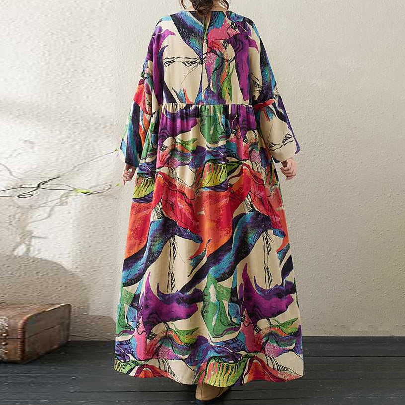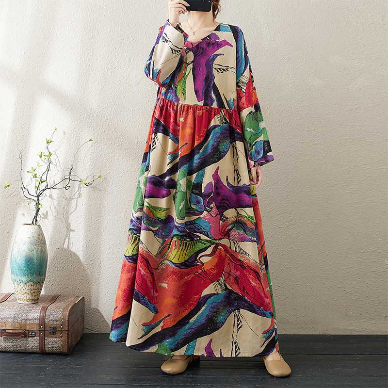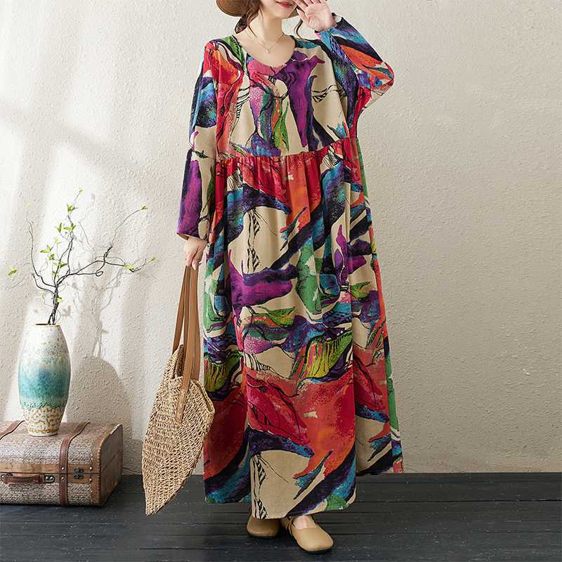 60%OFF⭐️期間限定【ワンピース】厚手 花柄 プリント 丸首 ゆったり 大きいサイズ 体型カバー 文芸風 リゾート 長袖 ロングワンピース【SHシリーズ】