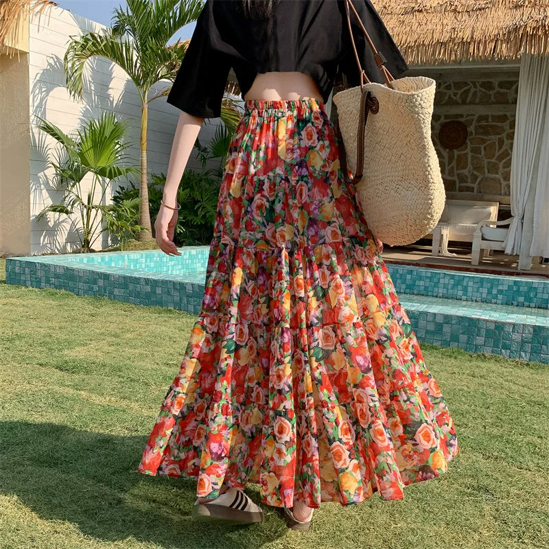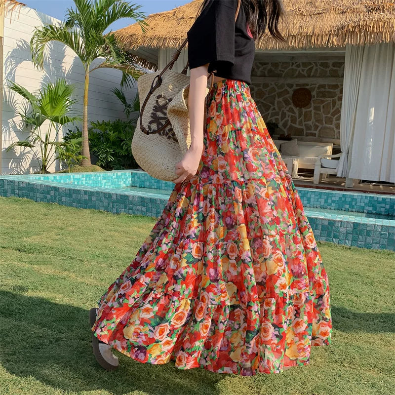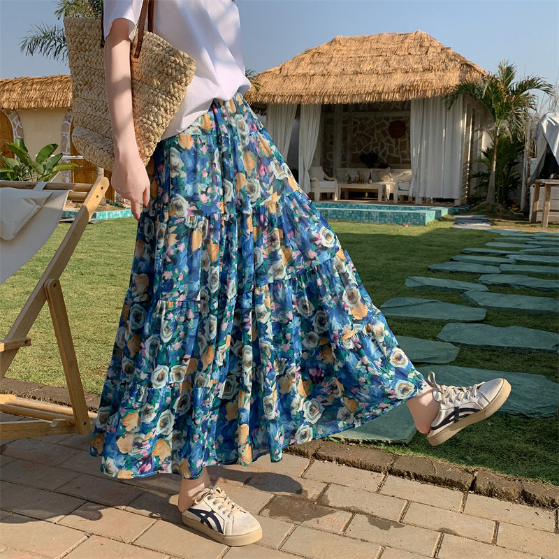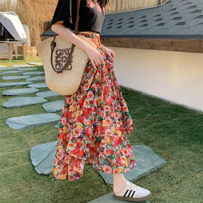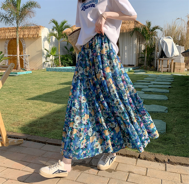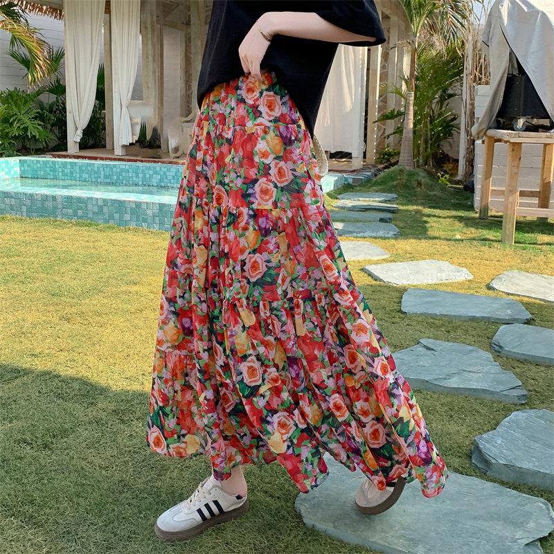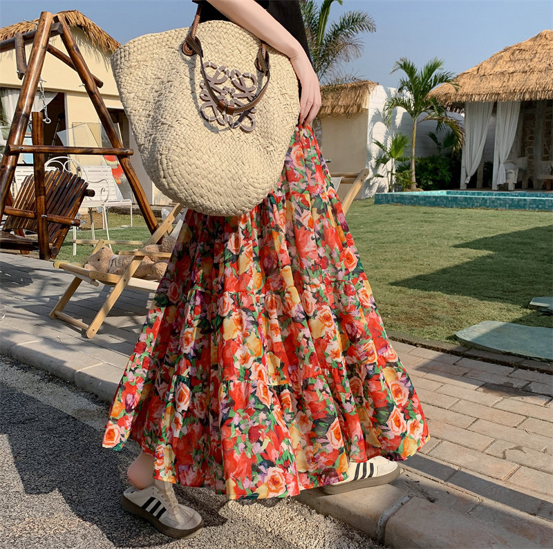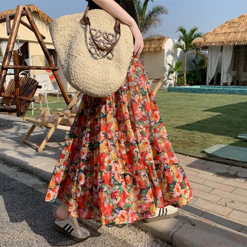 【ボトムス】レトロ花柄 フレアロング丈 ゆったりシルエット スカート【SHシリーズ】