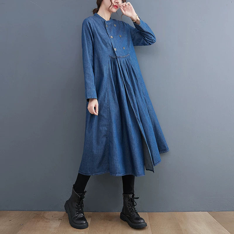 【商品名】【ワンピース】大きいサイズ 文芸風 Aライン 長袖 デニムワンピース ロング丈 ゆったり 春新作【JZシリーズ】