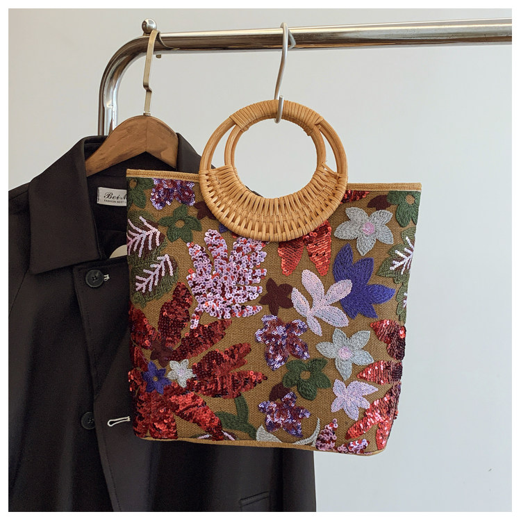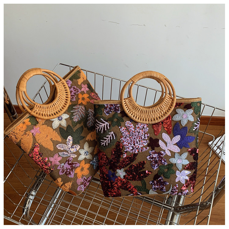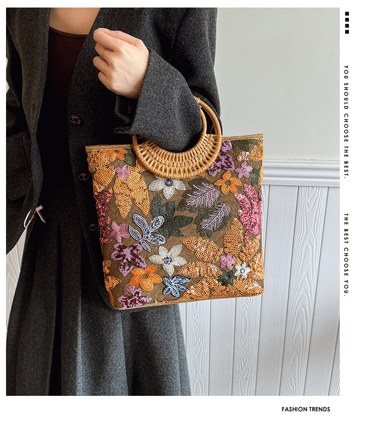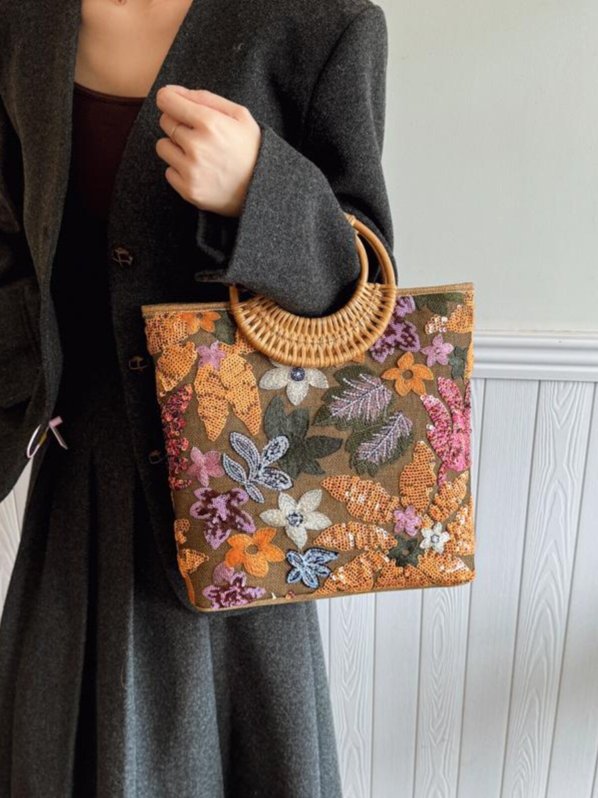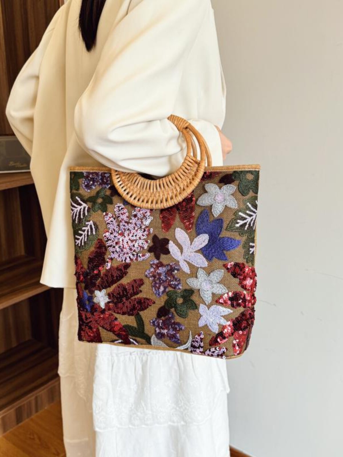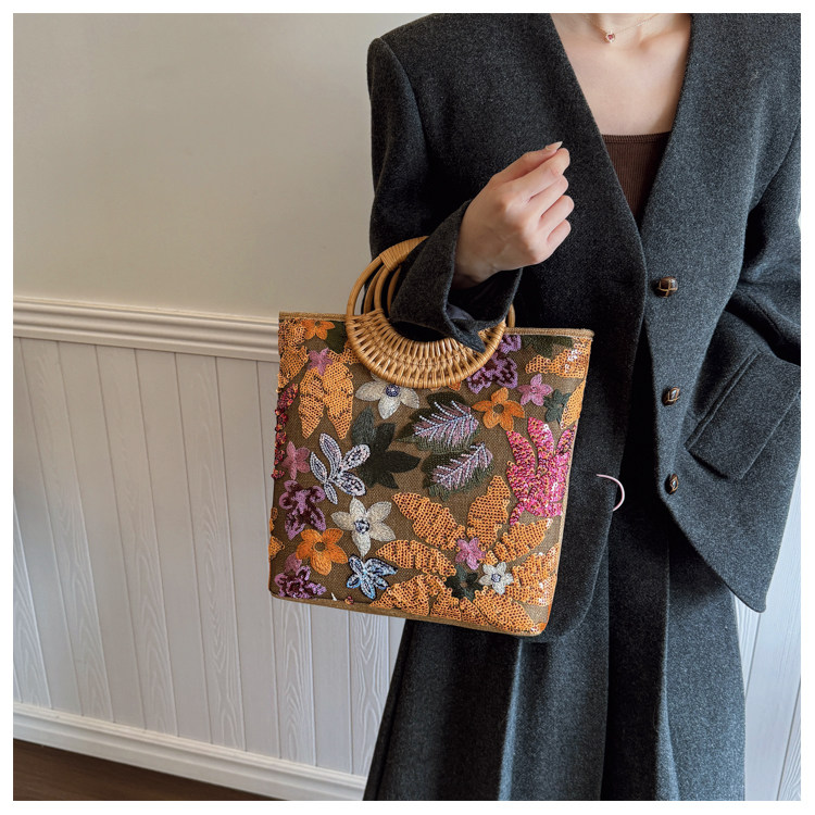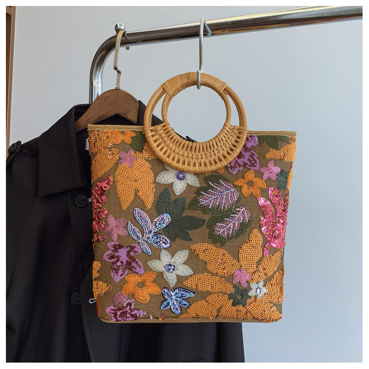 【バッグ】フラワー 竹ハンドル 刺繍 スパンコール バケットバッグ 【SHシリーズ】