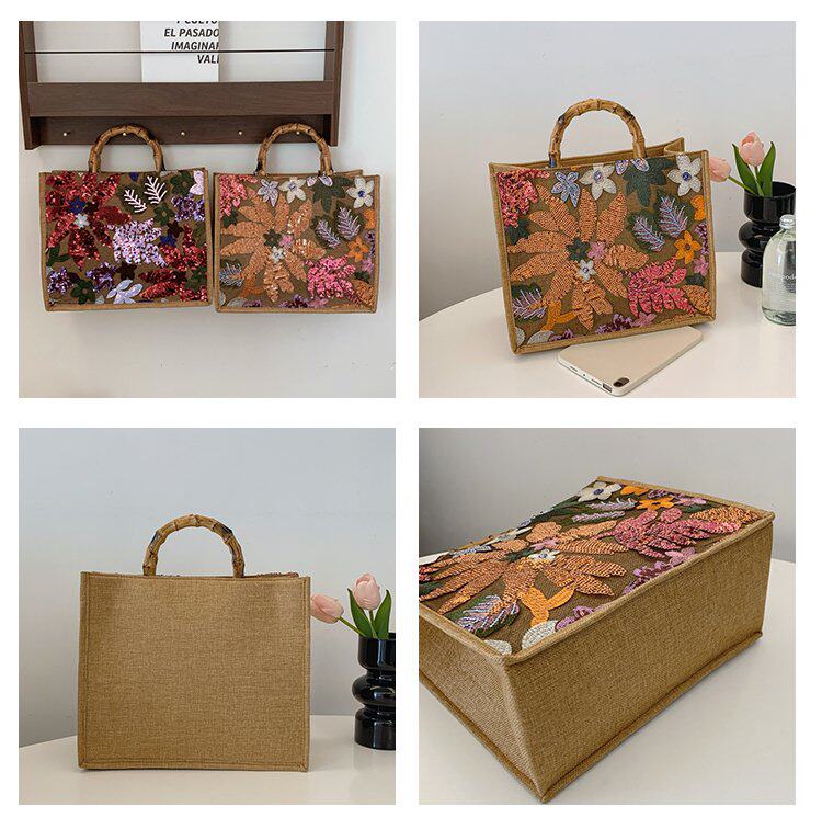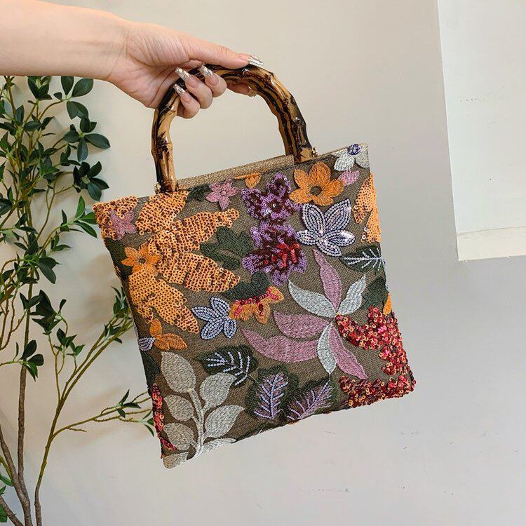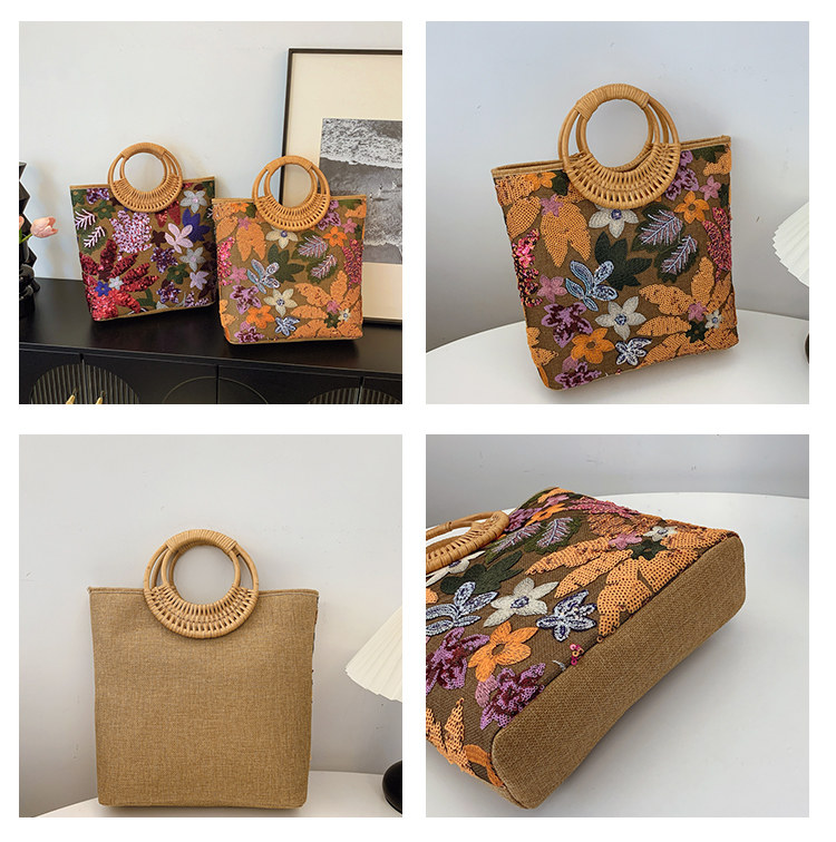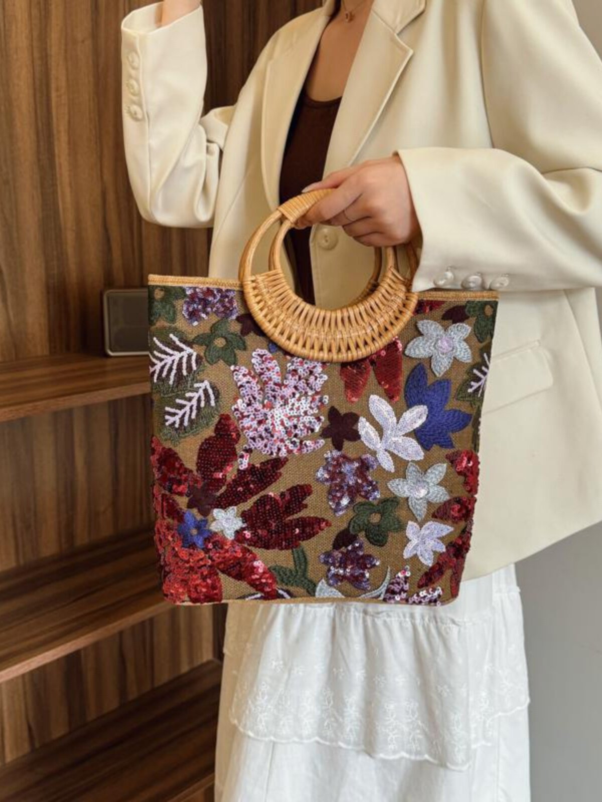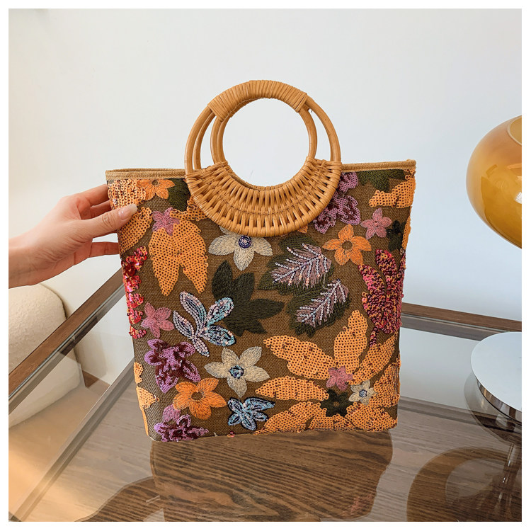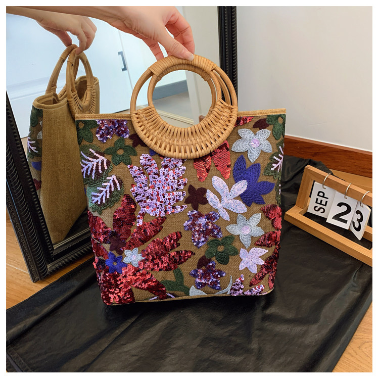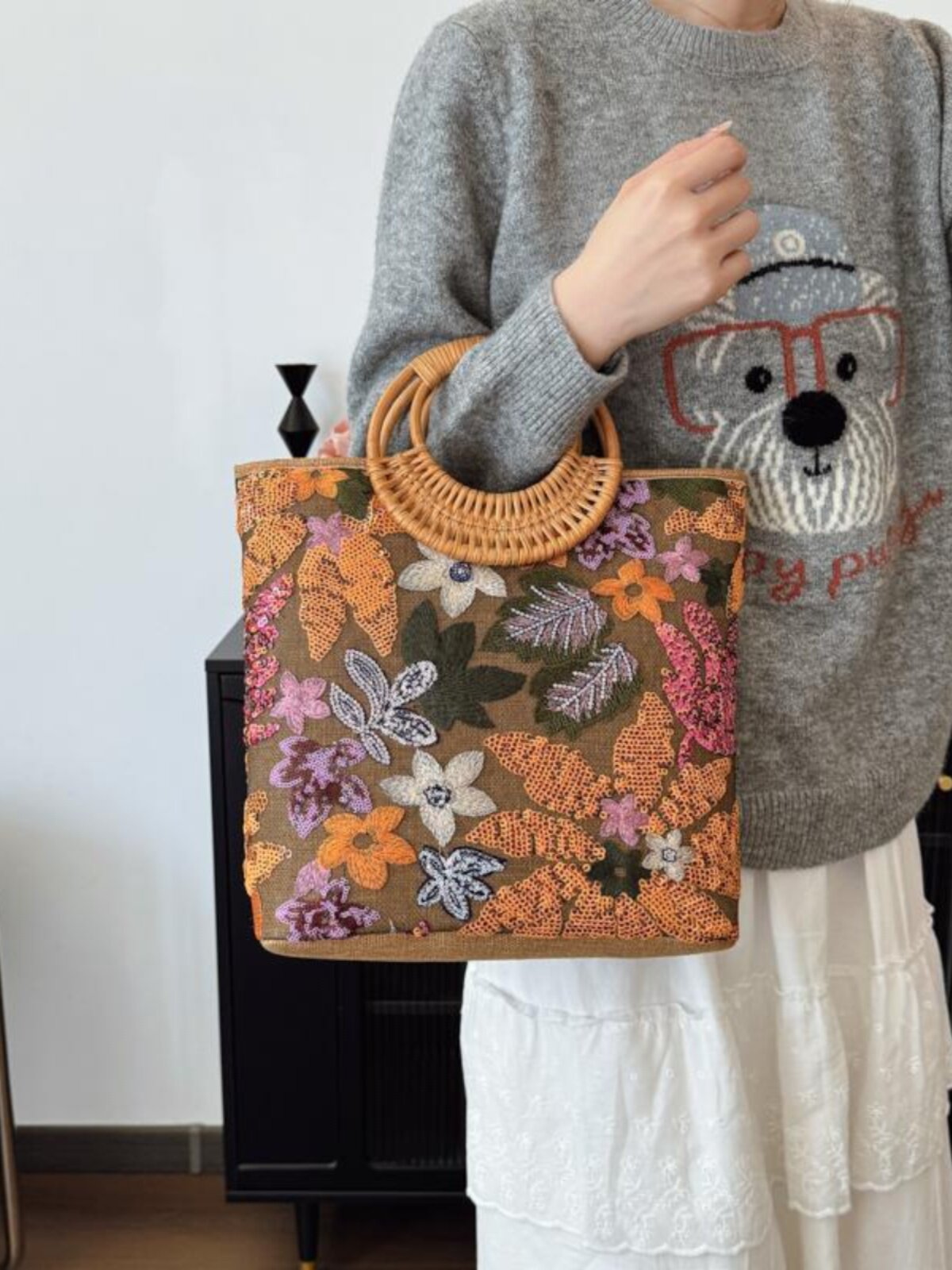 【バッグ】フラワー 竹ハンドル 刺繍 スパンコール バケットバッグ 【SHシリーズ】