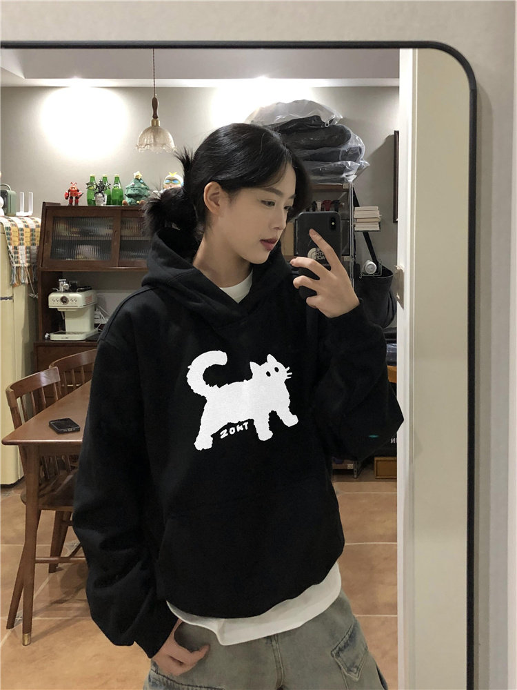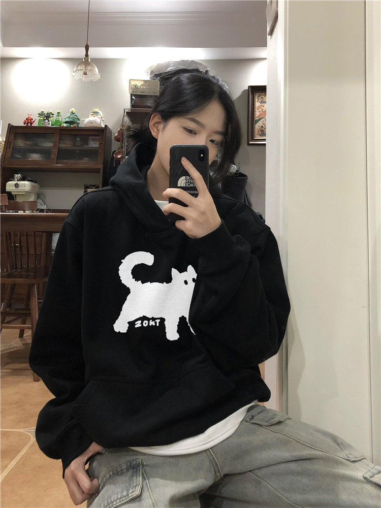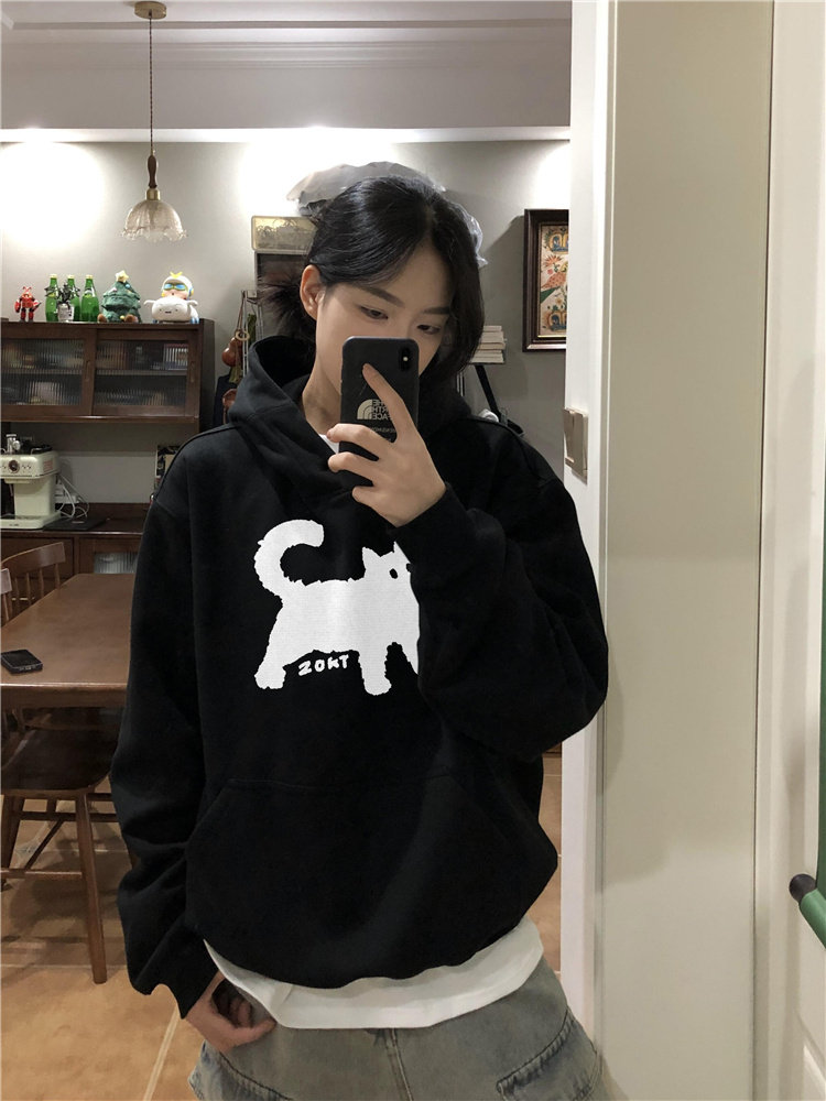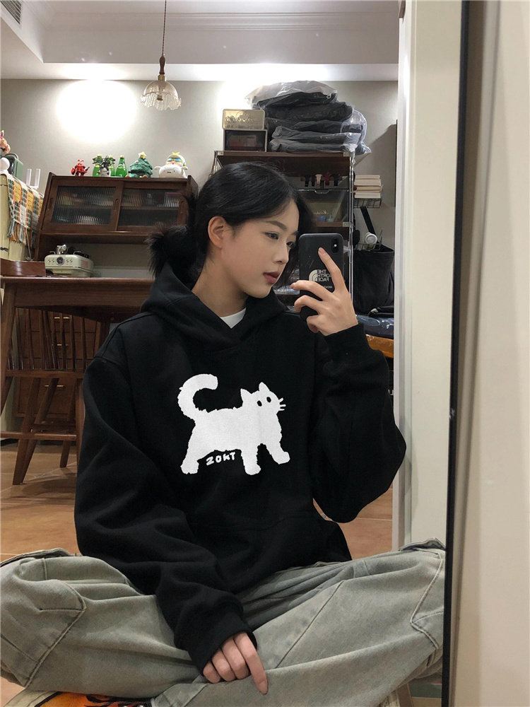 【トップス】オーバーサイズ フード付き 猫柄 レディース パーカー 小柄向け 韓国風 カジュアル 上質感 裏起毛 厚手 スウェット【FCシリーズ】