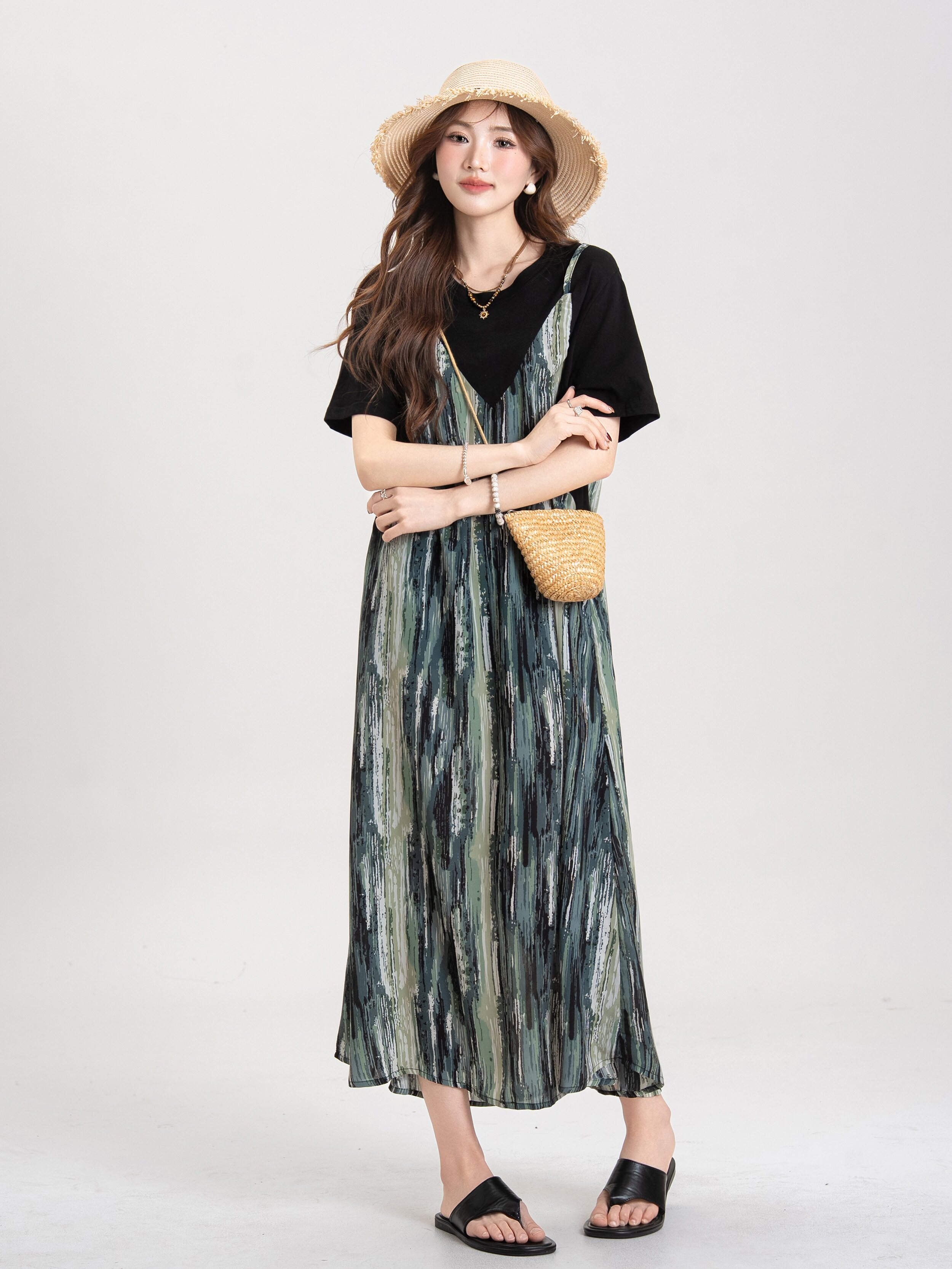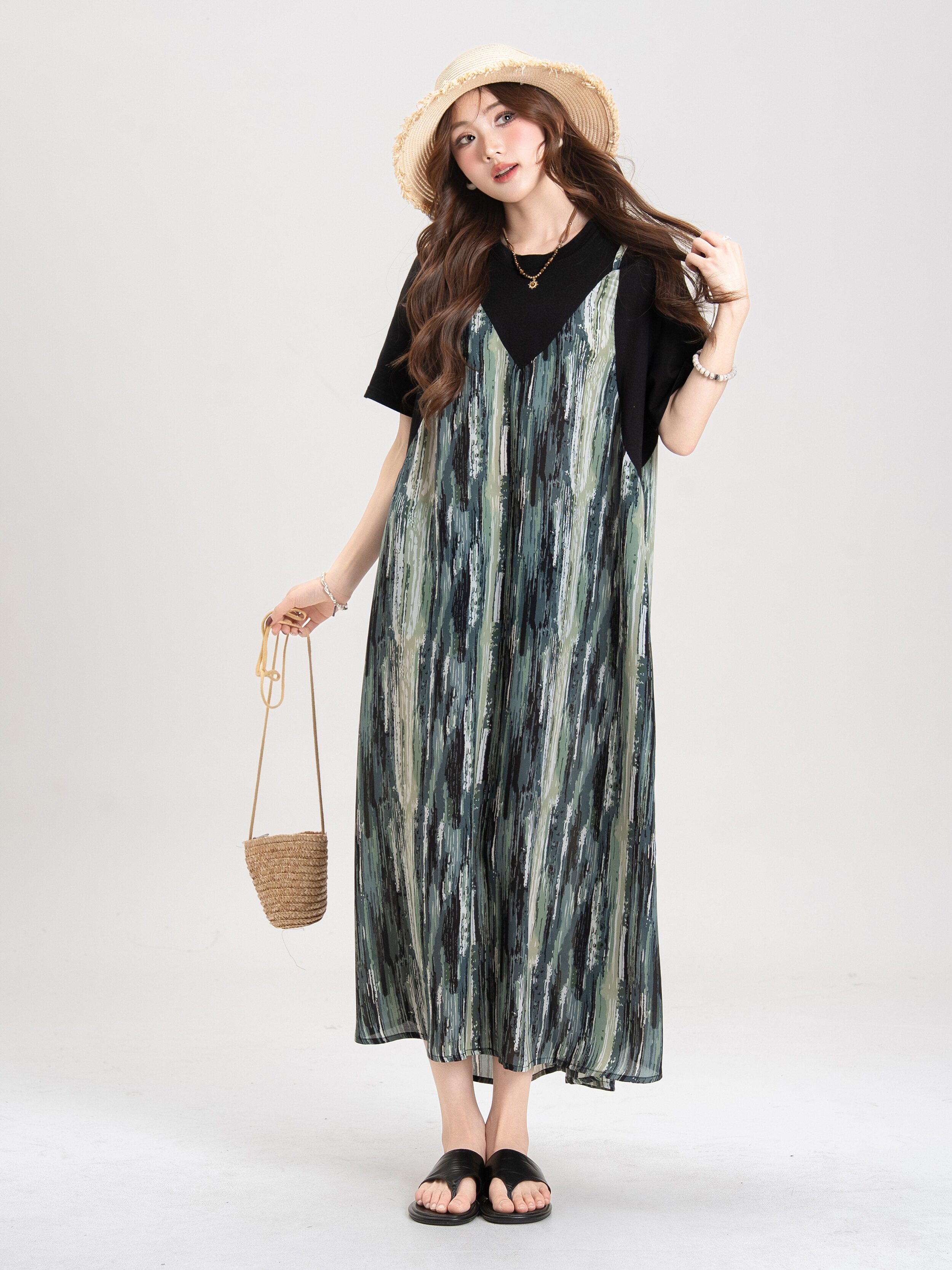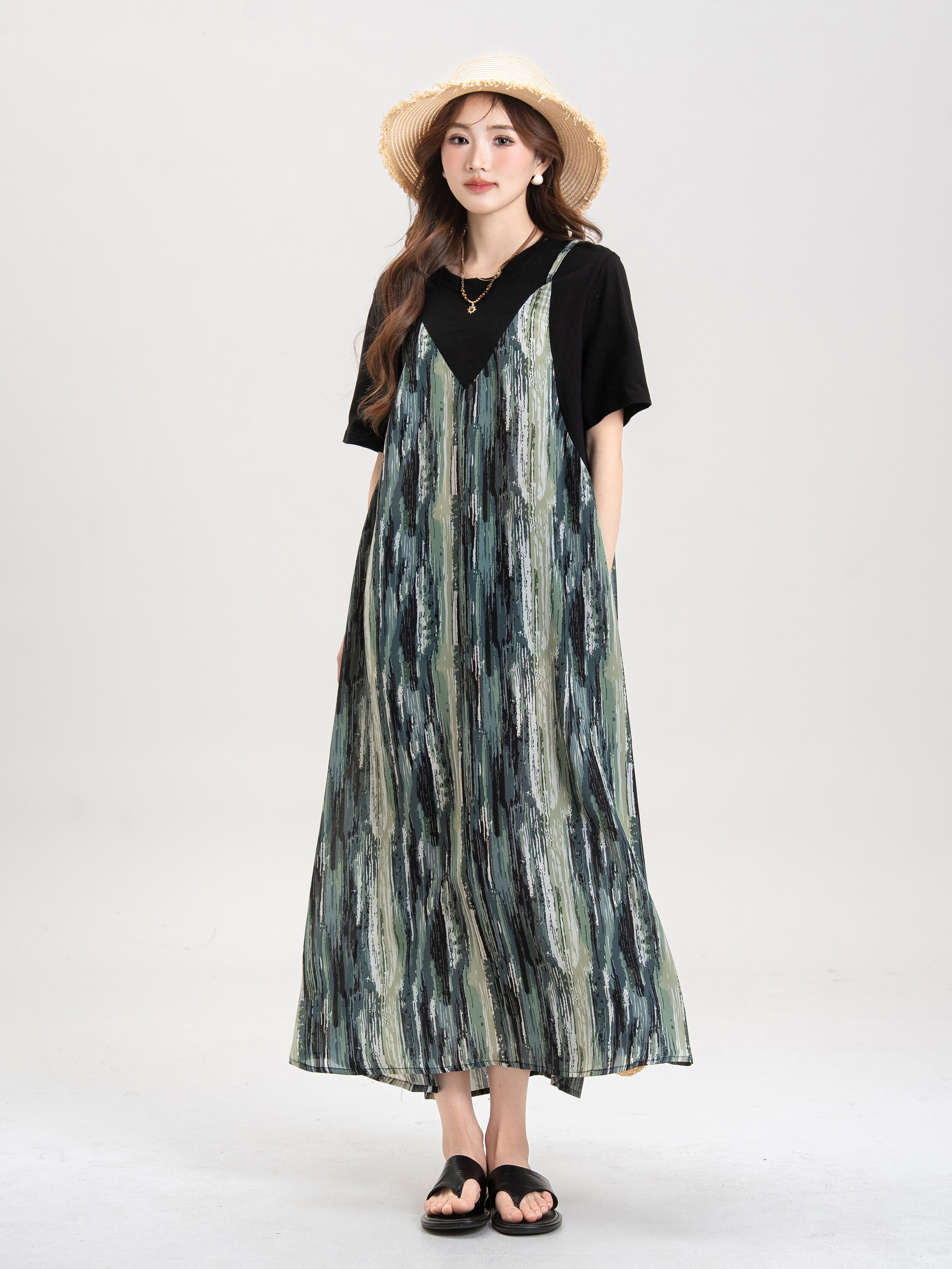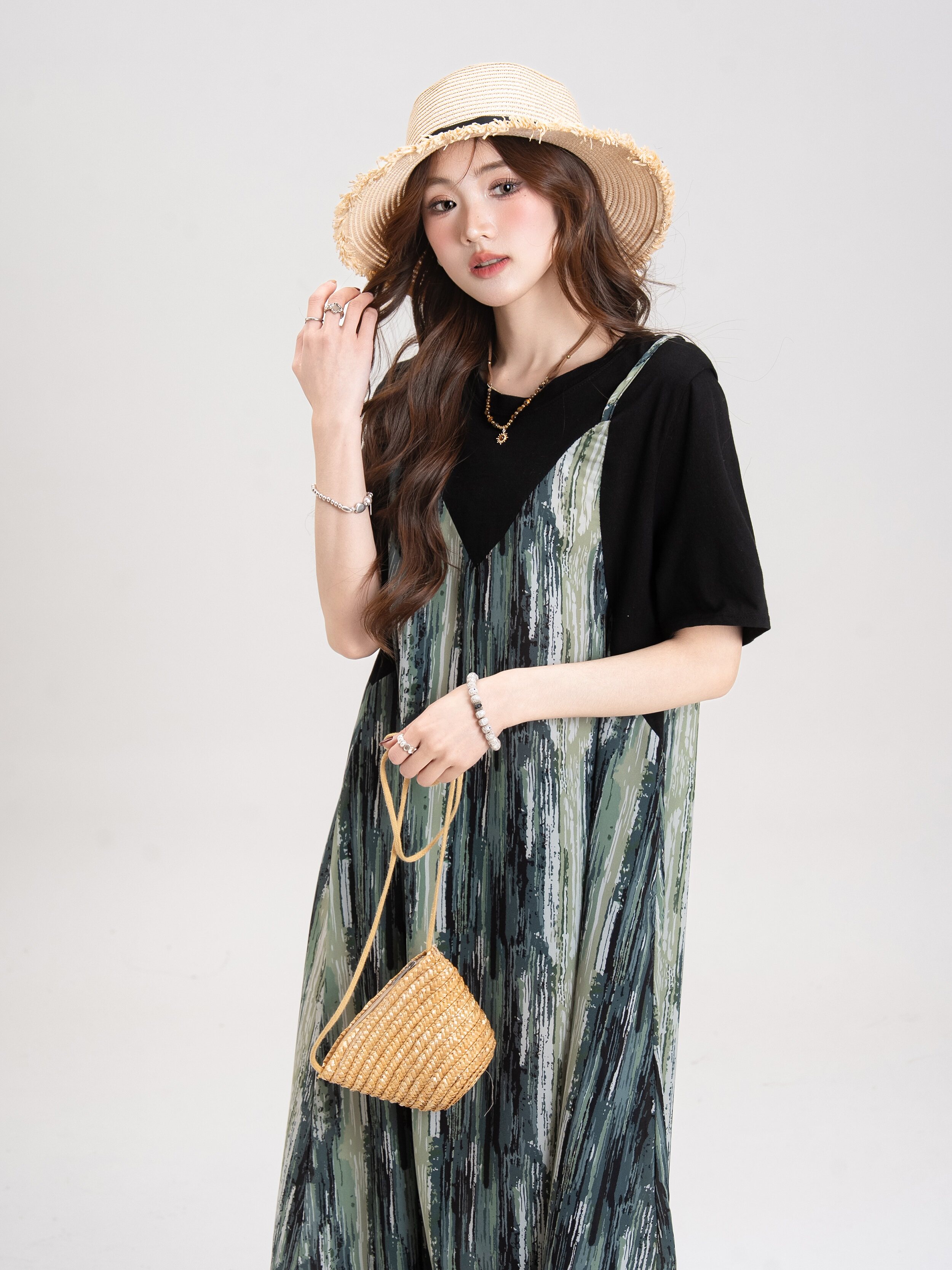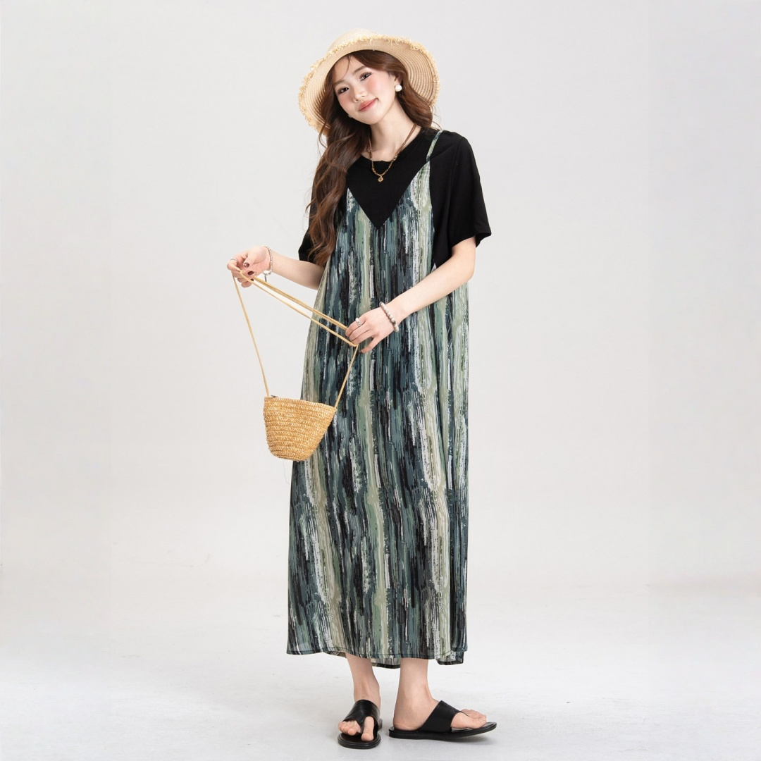 【セットアップ】ブルー キャミワンピース セットアップ レディース 夏 レイヤード 2点セット レトロ風 ゆったり ロングワンピース【JZシリーズ】