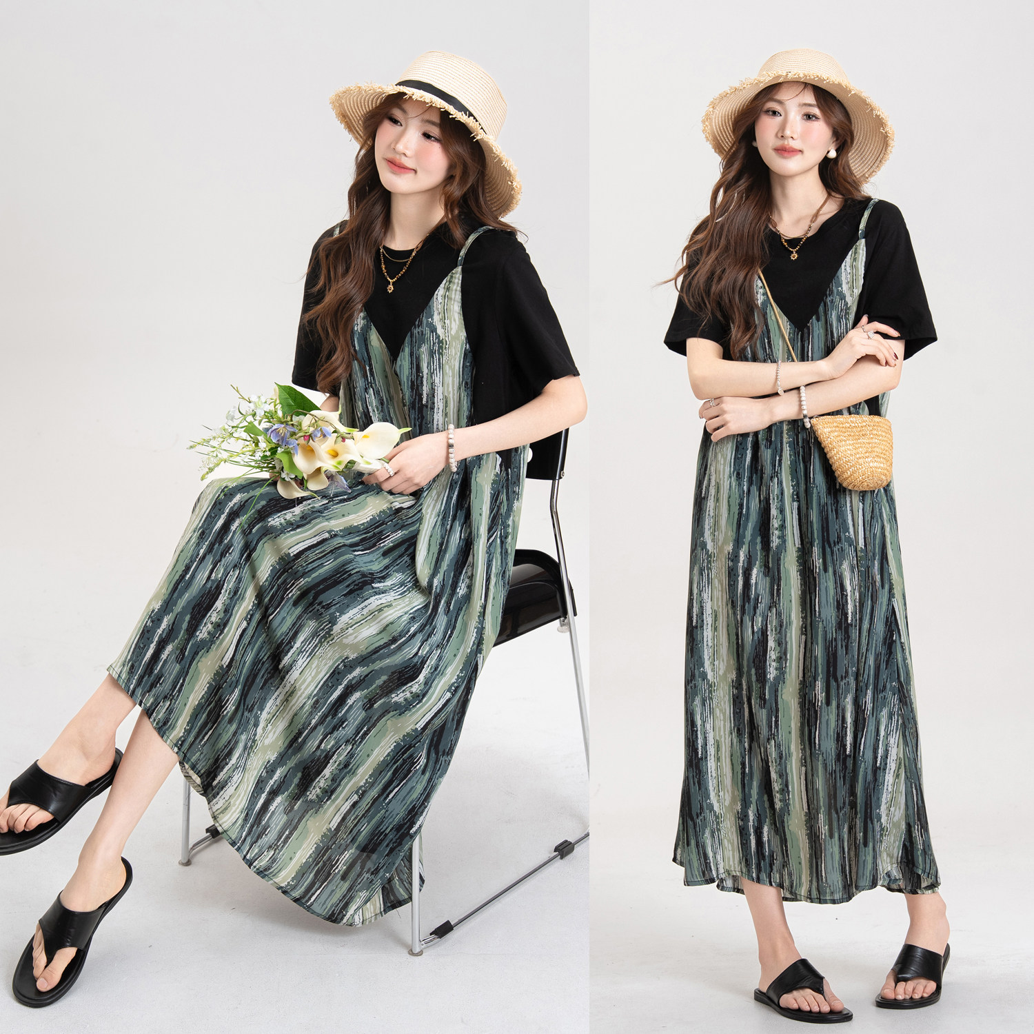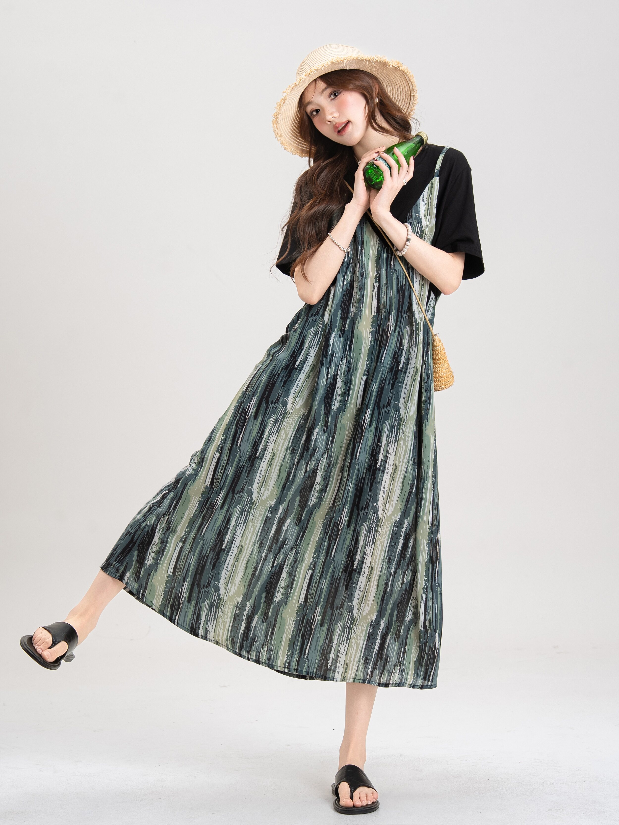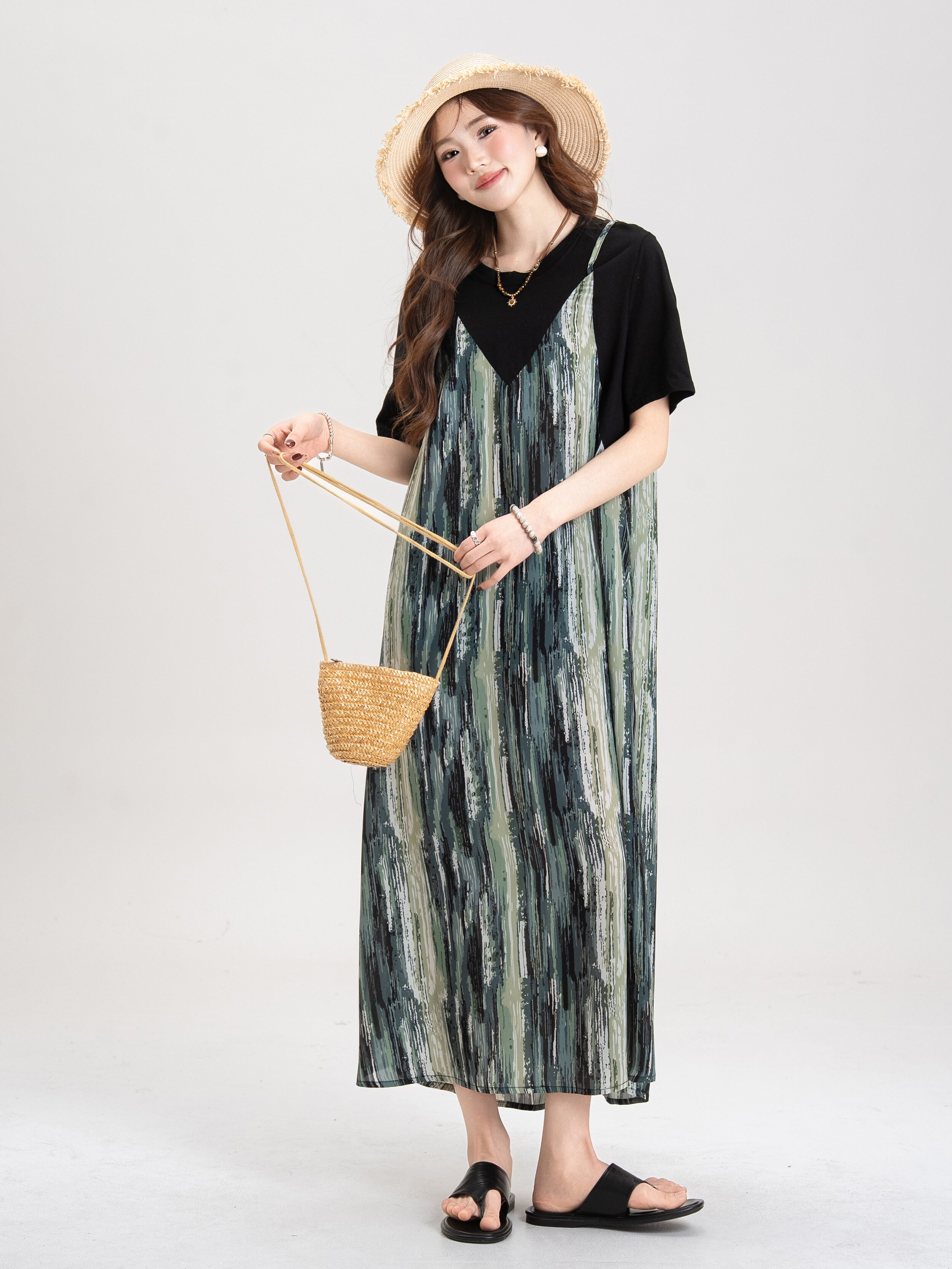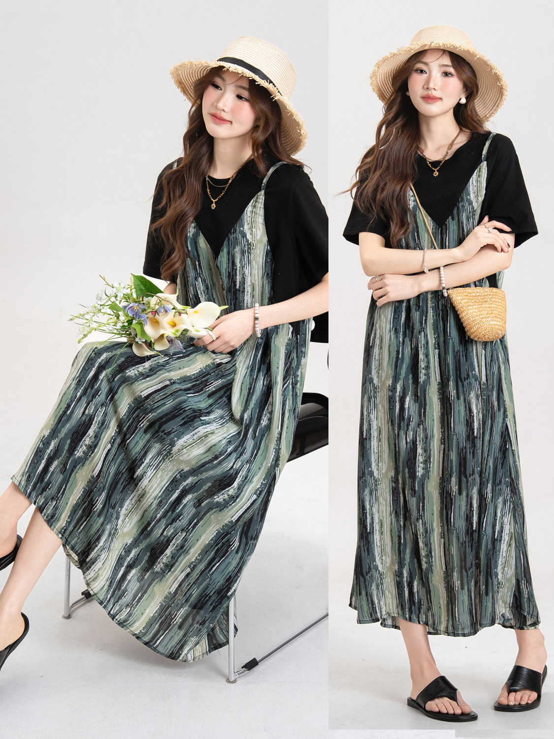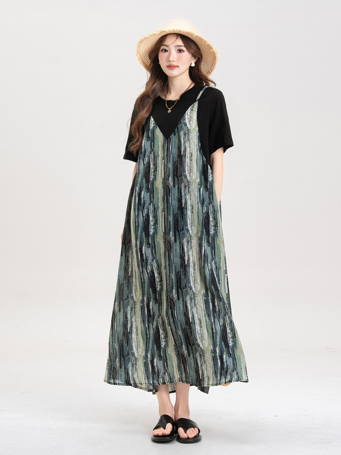 【セットアップ】ブルー キャミワンピース セットアップ レディース 夏 レイヤード 2点セット レトロ風 ゆったり ロングワンピース【JZシリーズ】