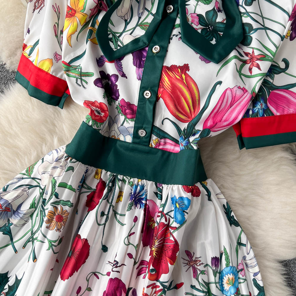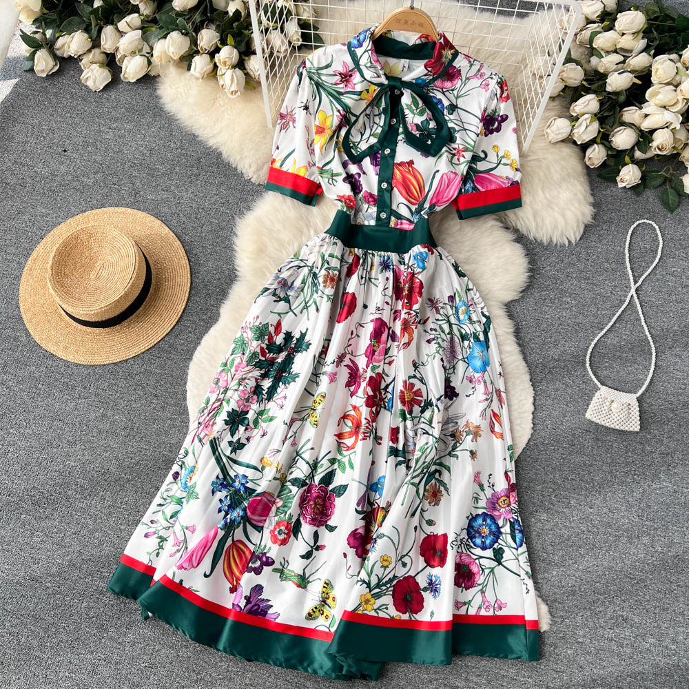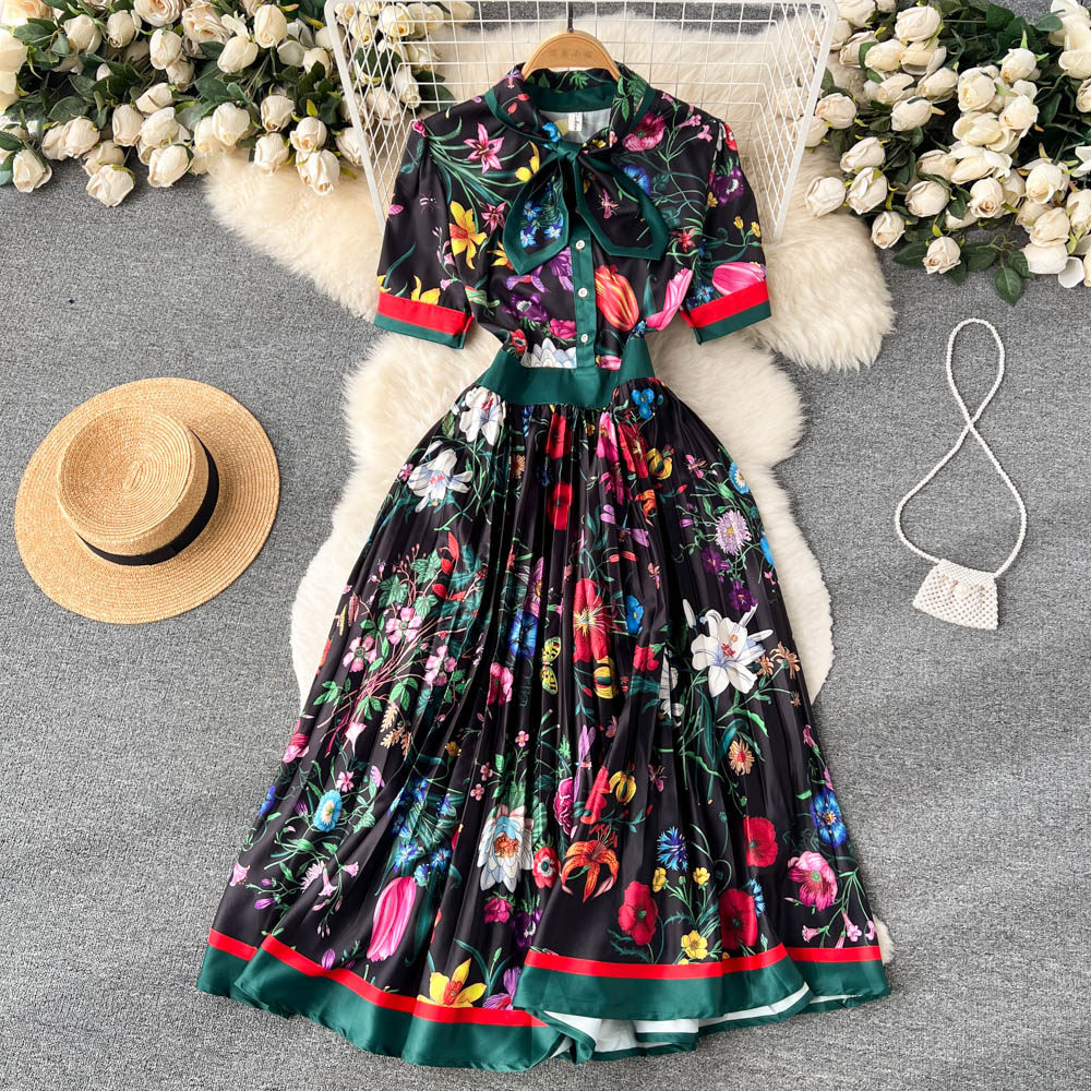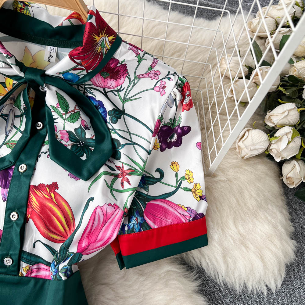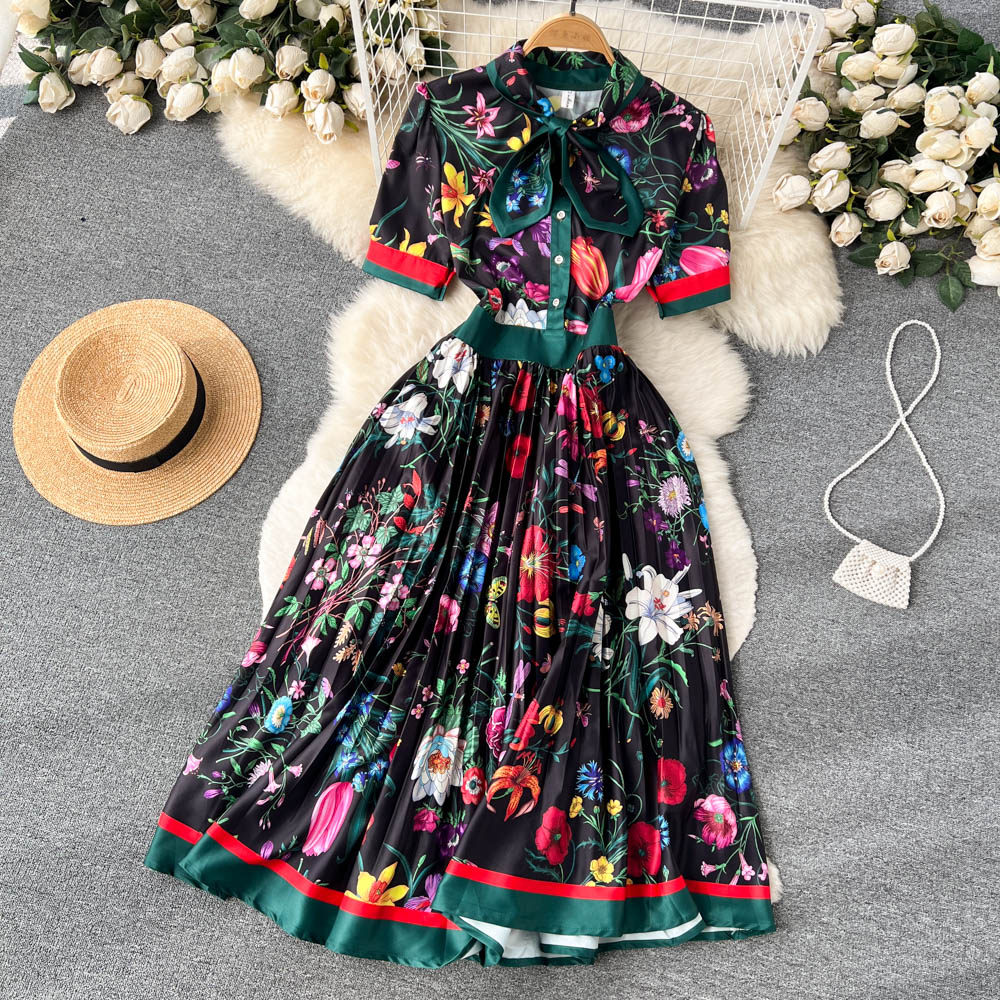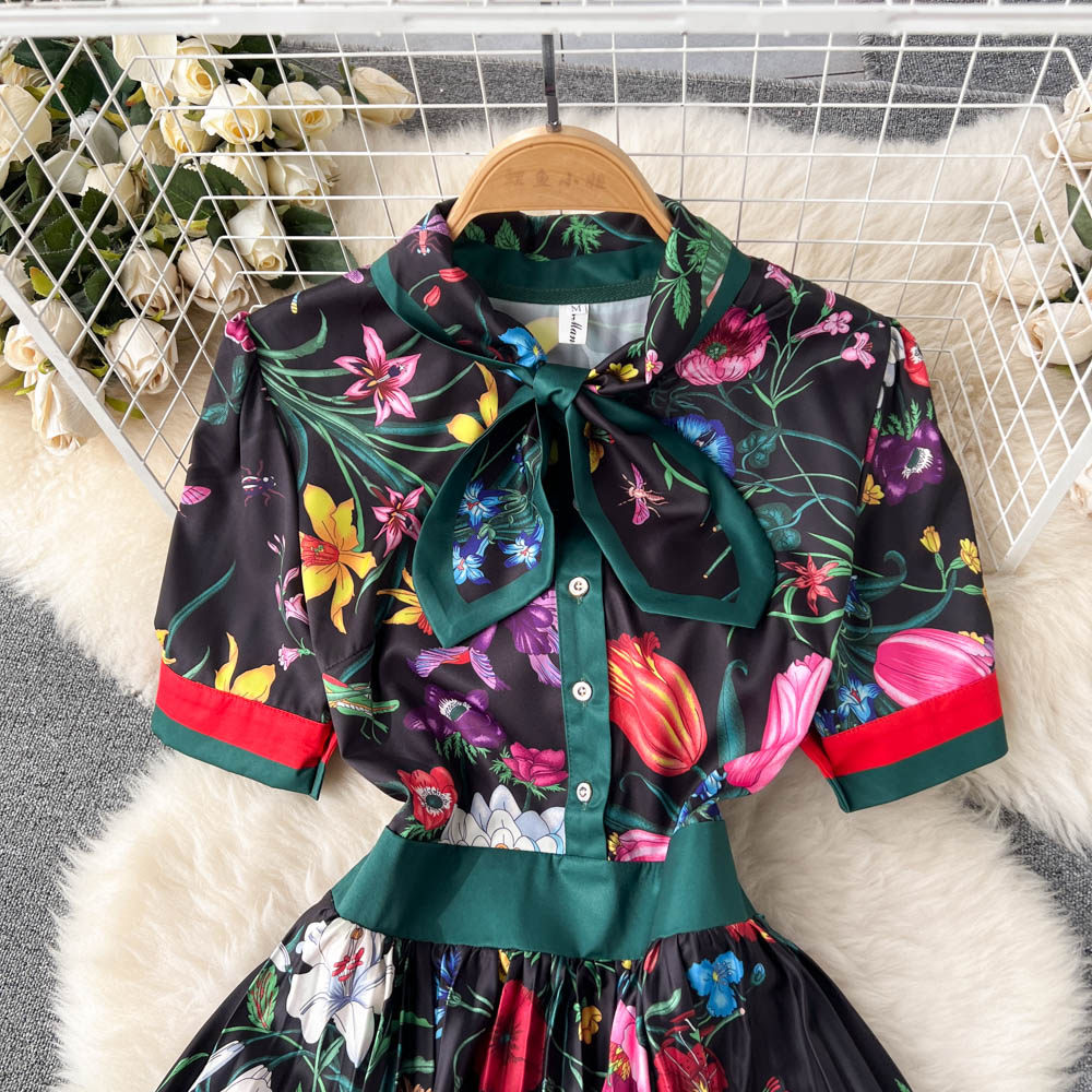 【商品名】【ワンピース】夏新作 フレンチレトロ 人気半袖モデル リボン付き ウエストマーク 百褶 花柄 シフォン ワンピース レディース【SHシリーズ】