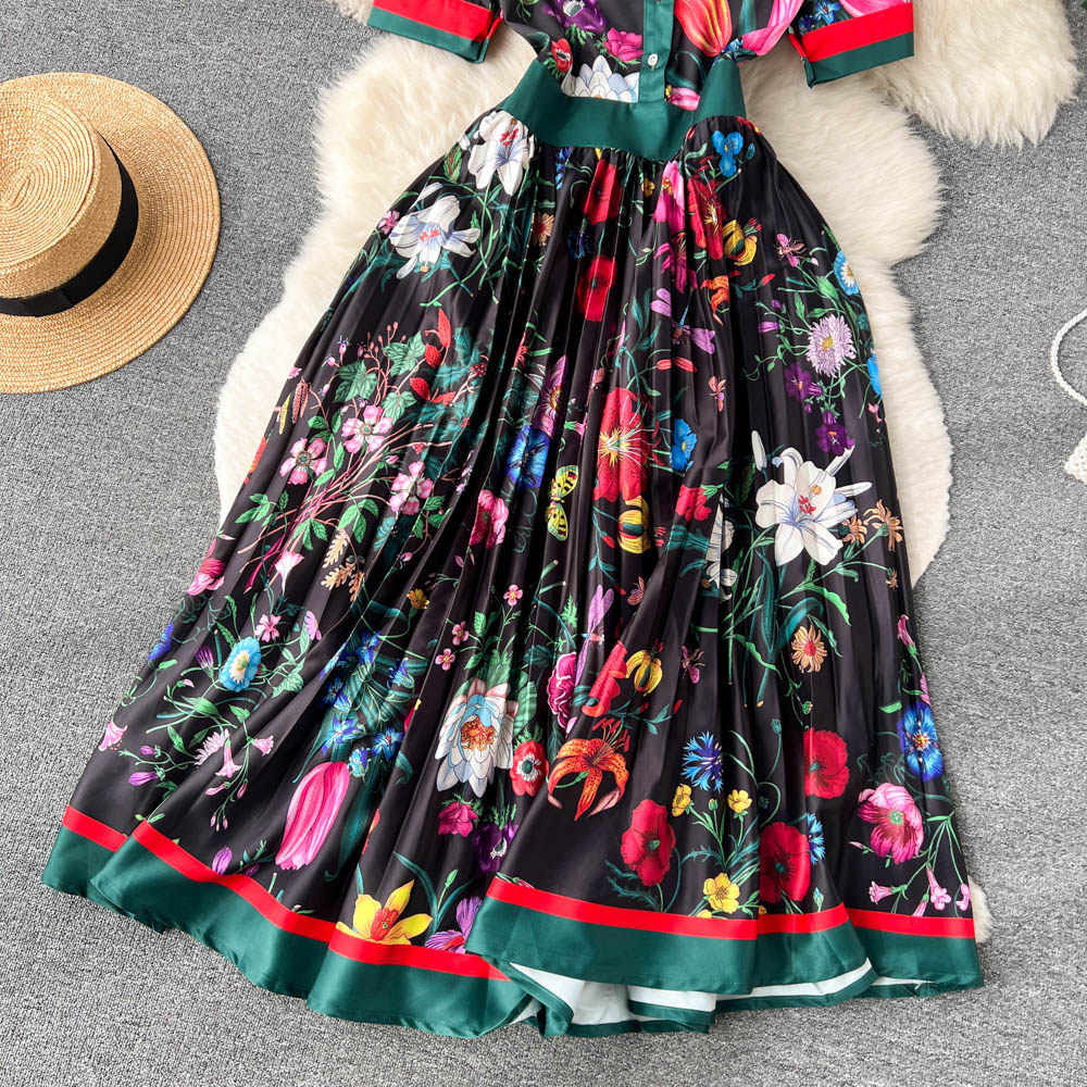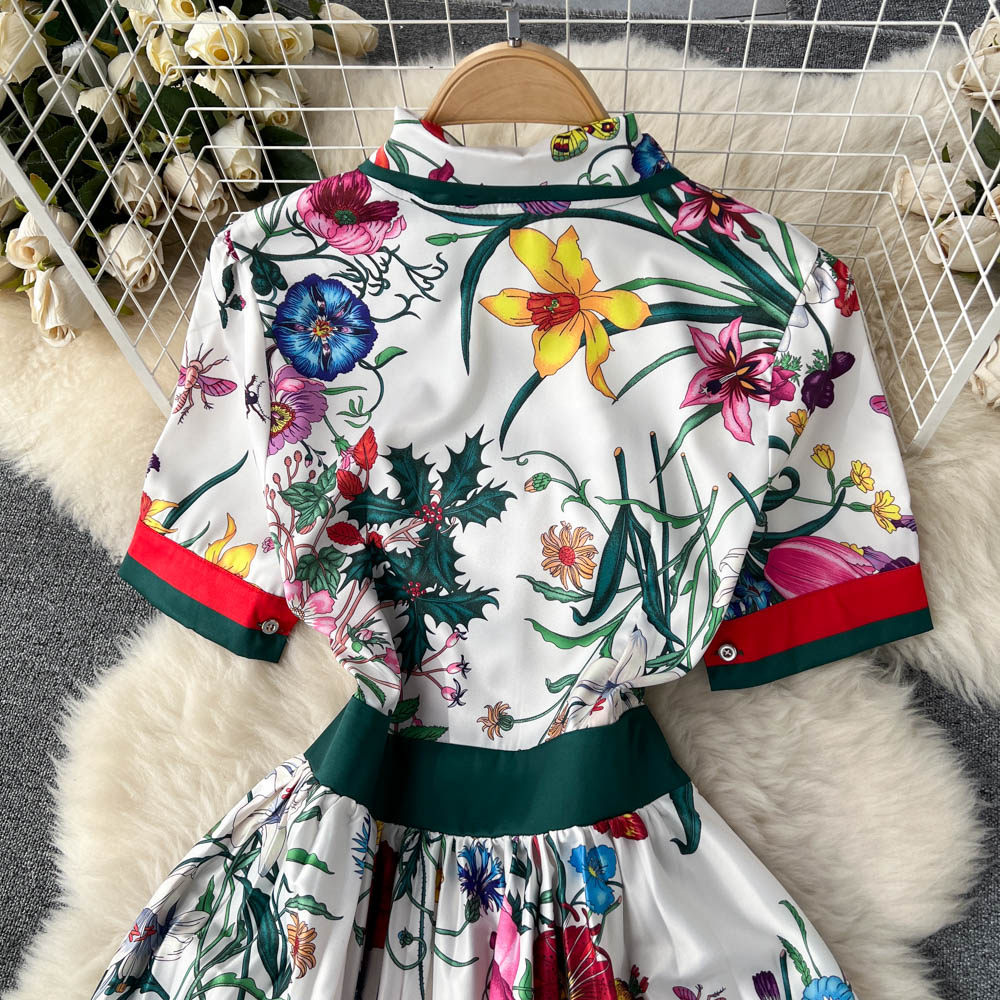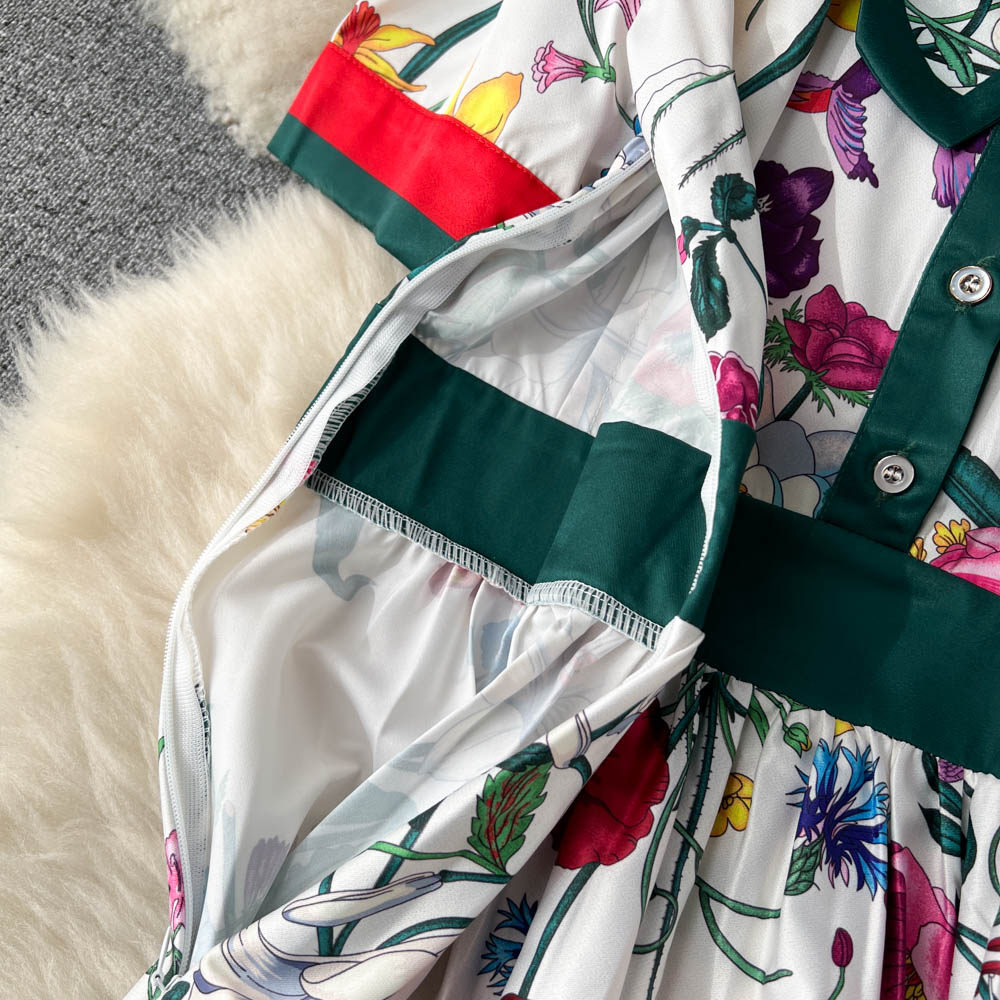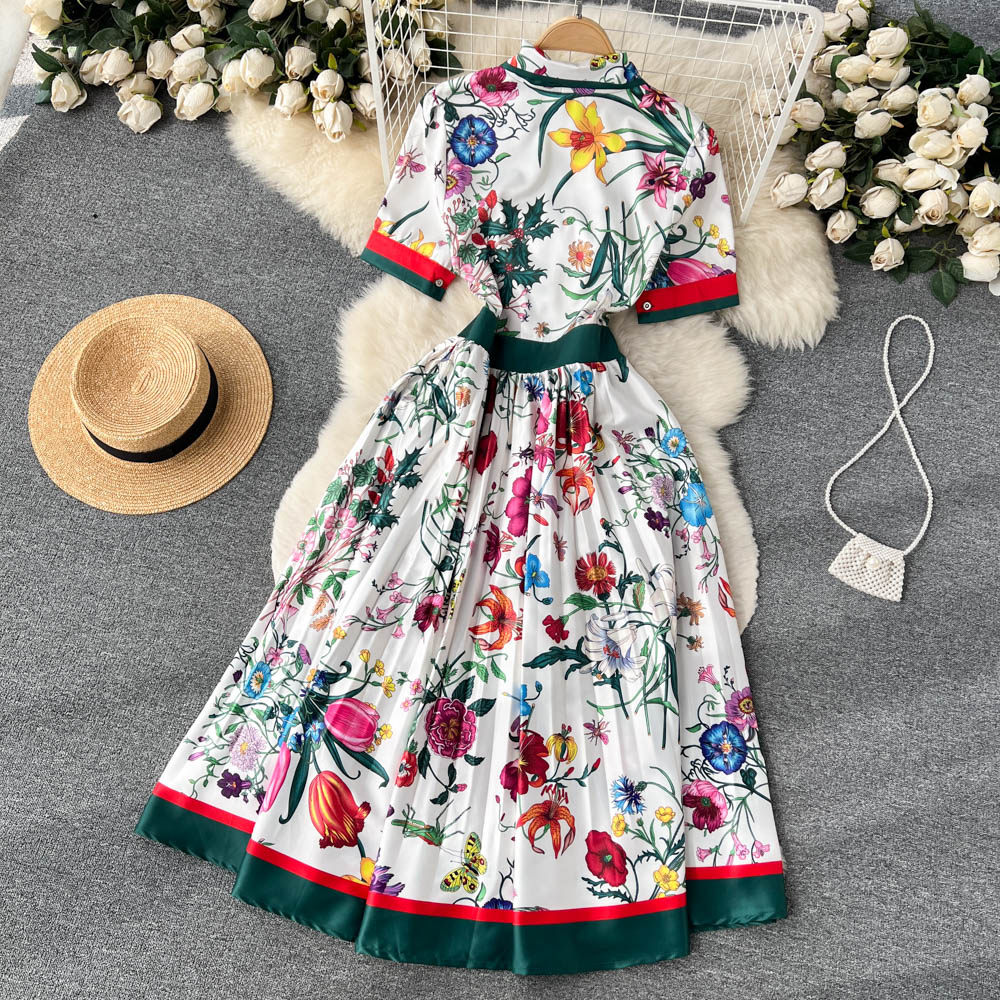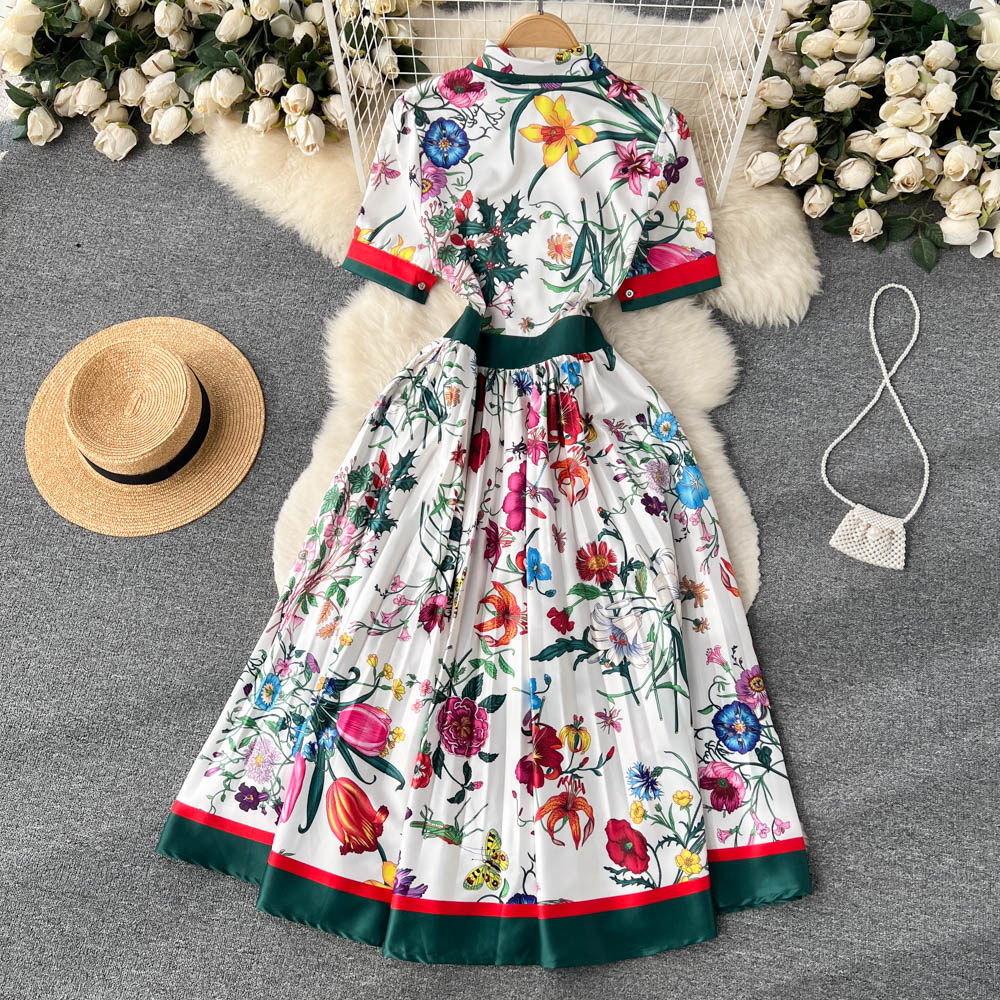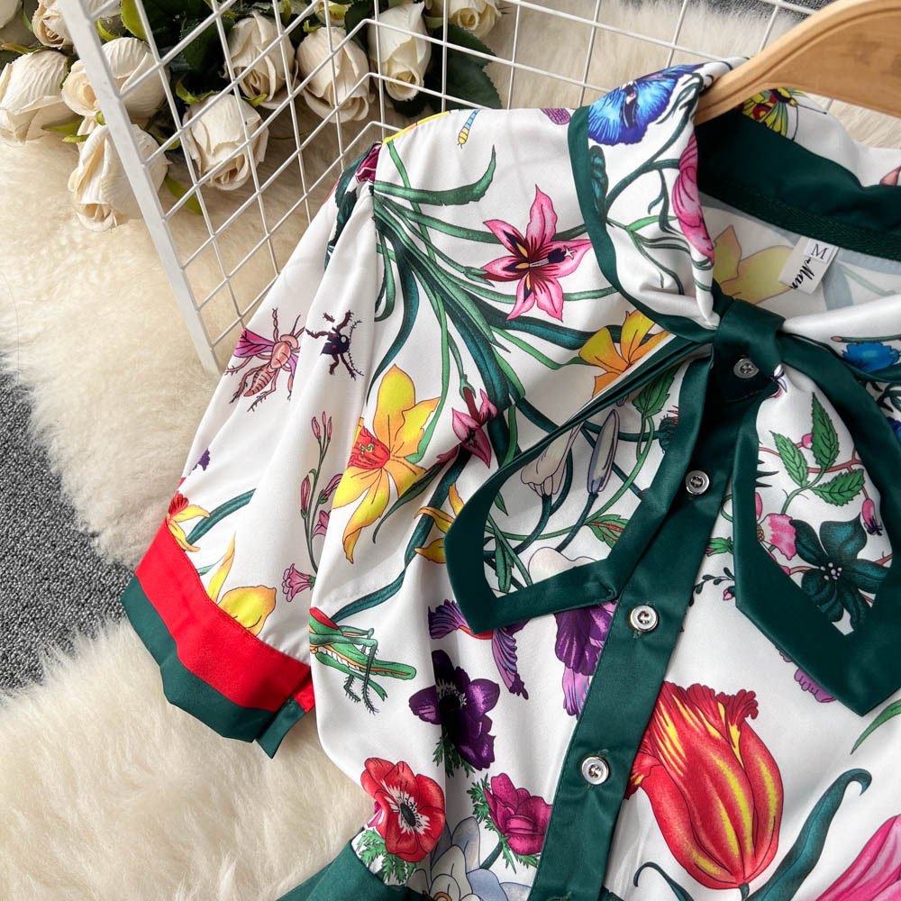【商品名】【ワンピース】夏新作 フレンチレトロ 人気半袖モデル リボン付き ウエストマーク 百褶 花柄 シフォン ワンピース レディース【SHシリーズ】
