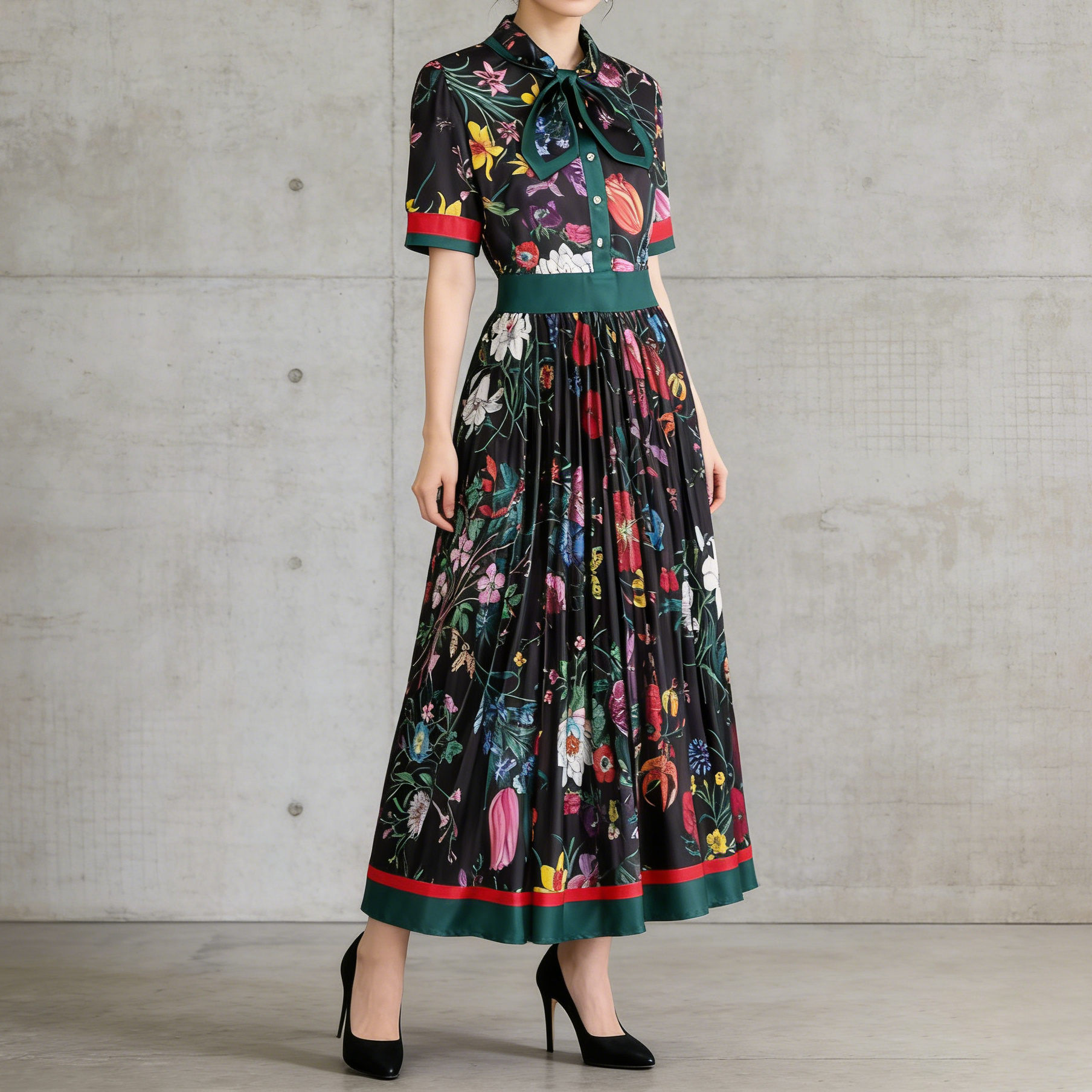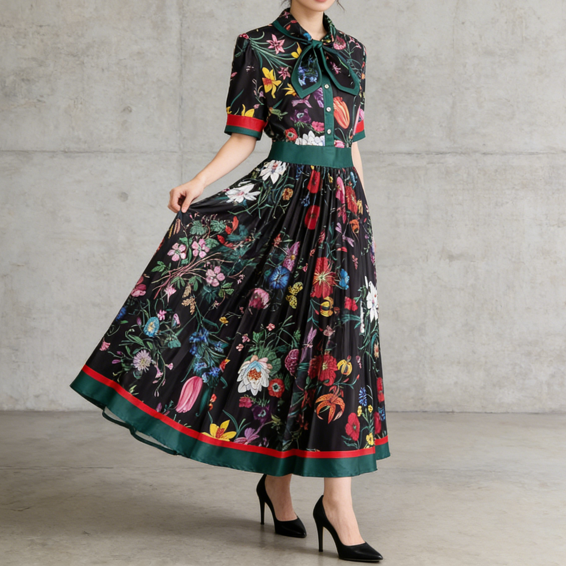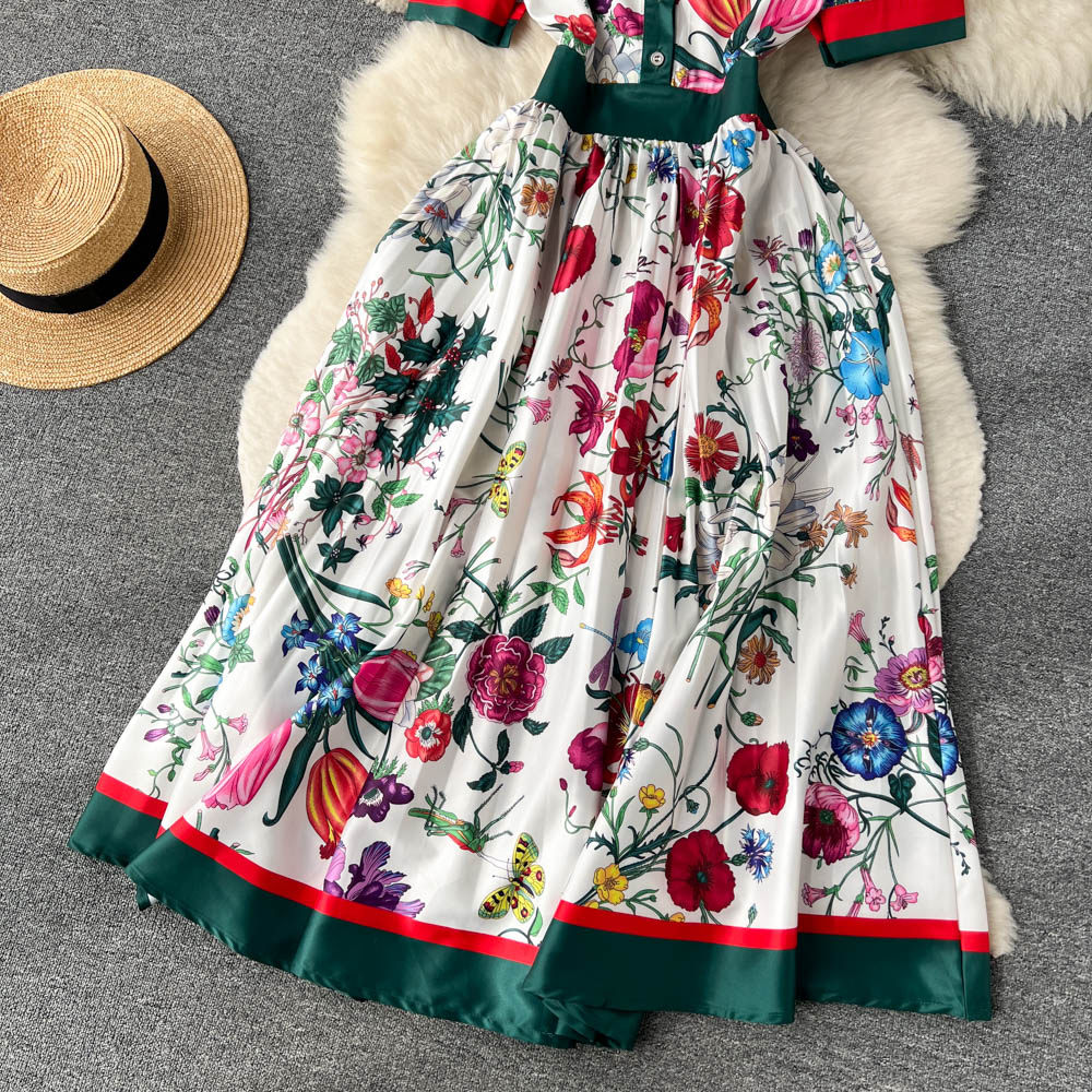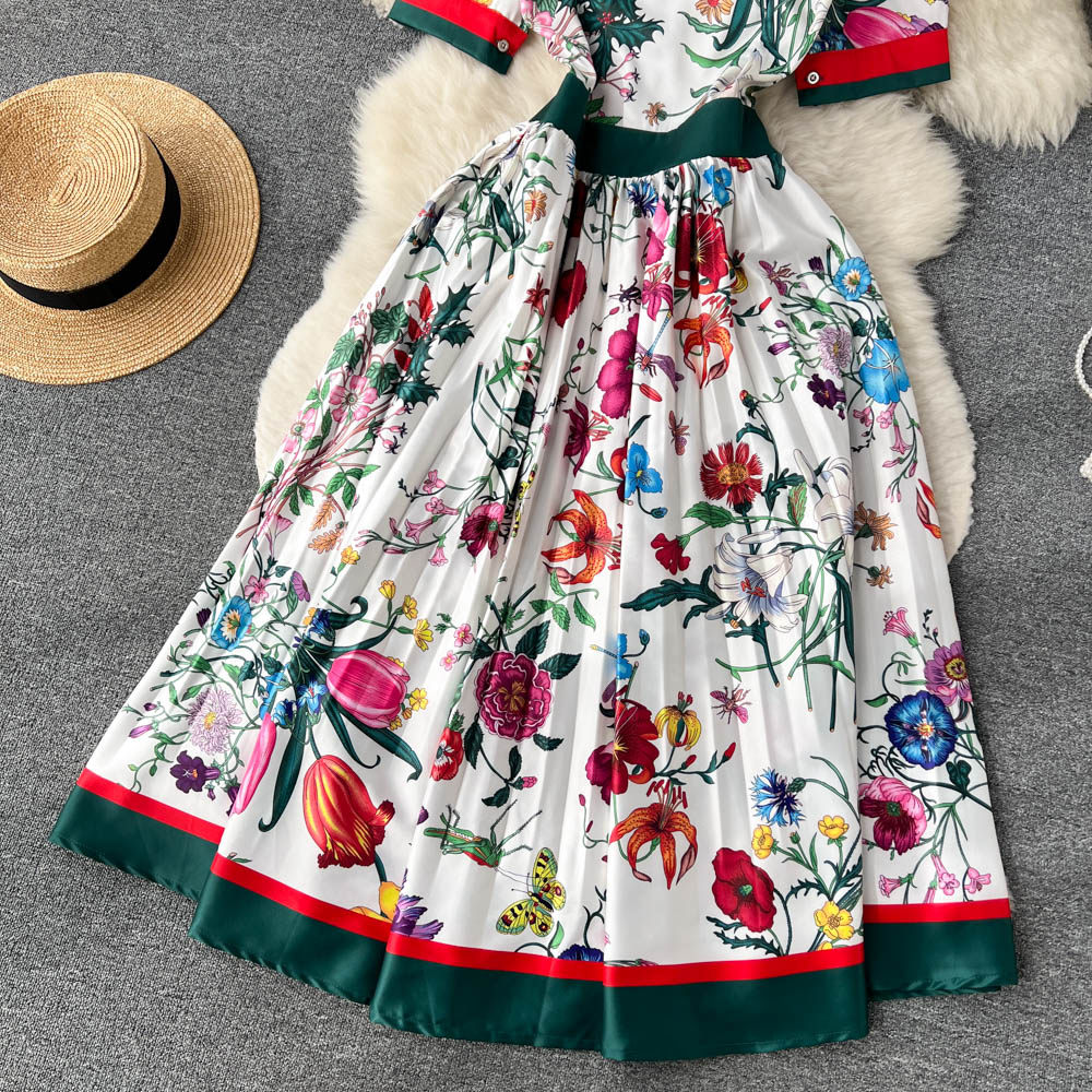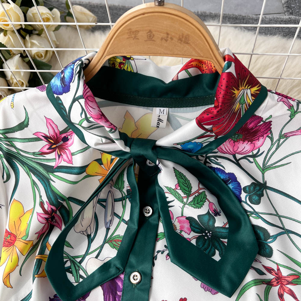 【商品名】【ワンピース】夏新作 フレンチレトロ 人気半袖モデル リボン付き ウエストマーク 百褶 花柄 シフォン ワンピース レディース【SHシリーズ】