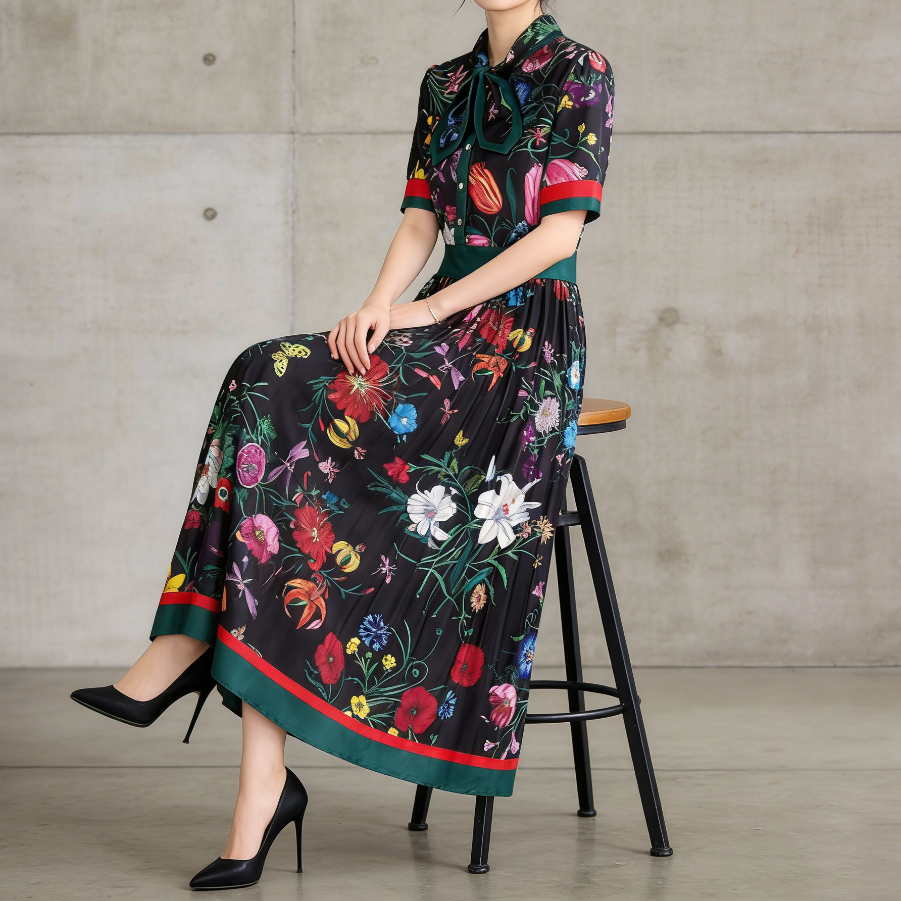 【ワンピース】夏新作 フレンチレトロ 人気半袖モデル リボン付き ウエストマーク 百褶 花柄 シフォン ワンピース レディース 【SHシリーズ】