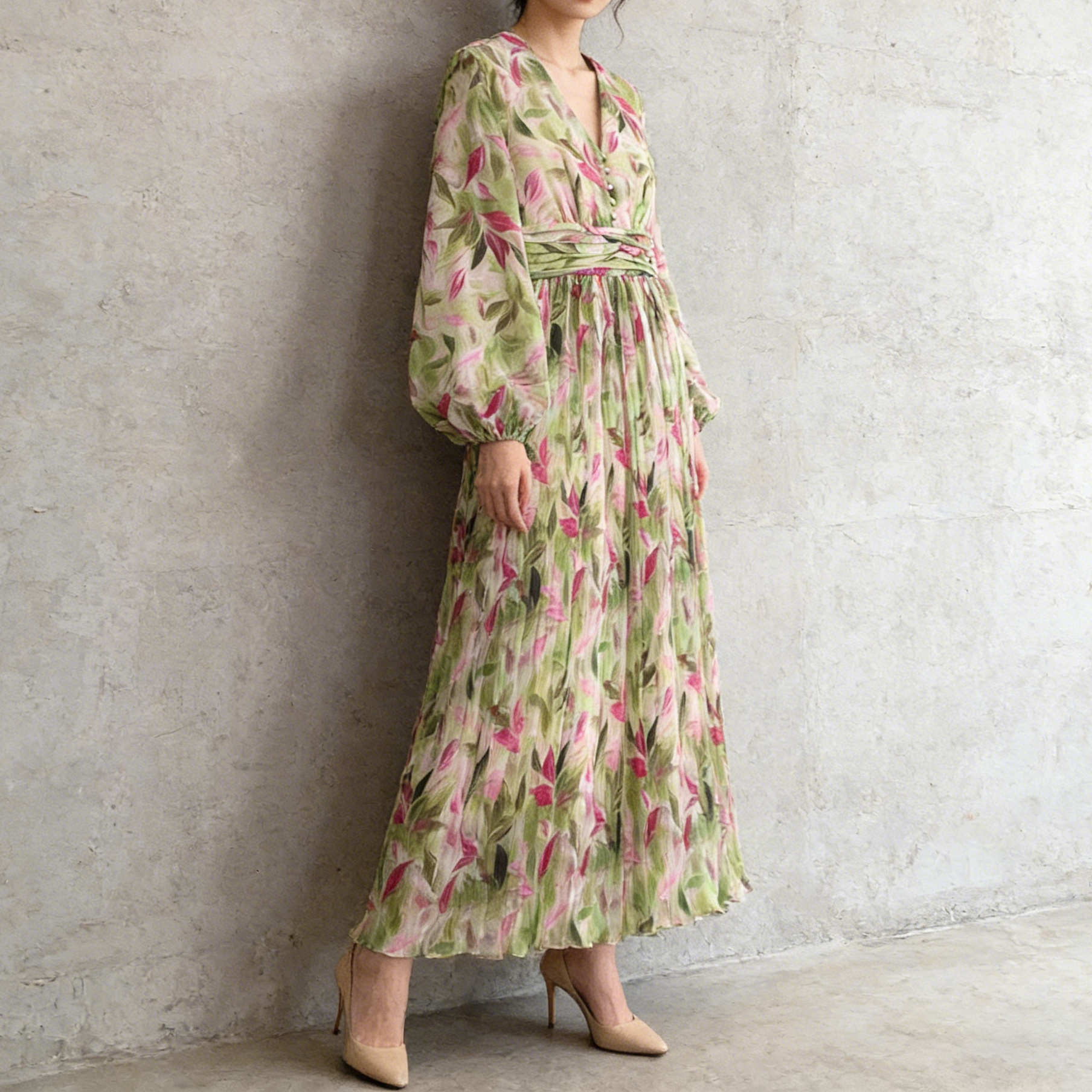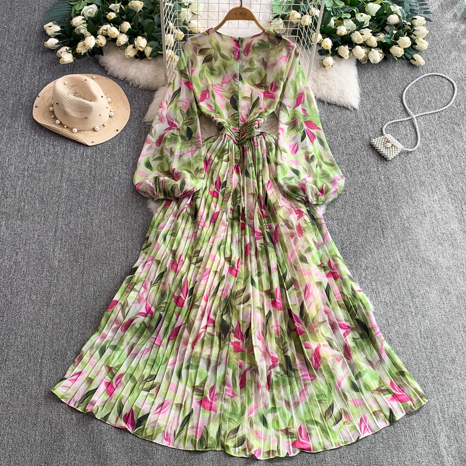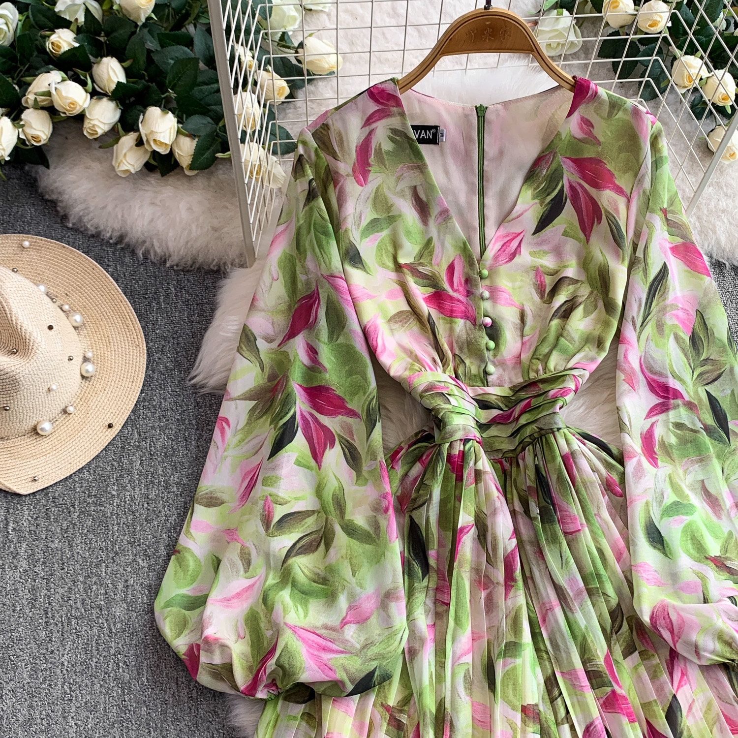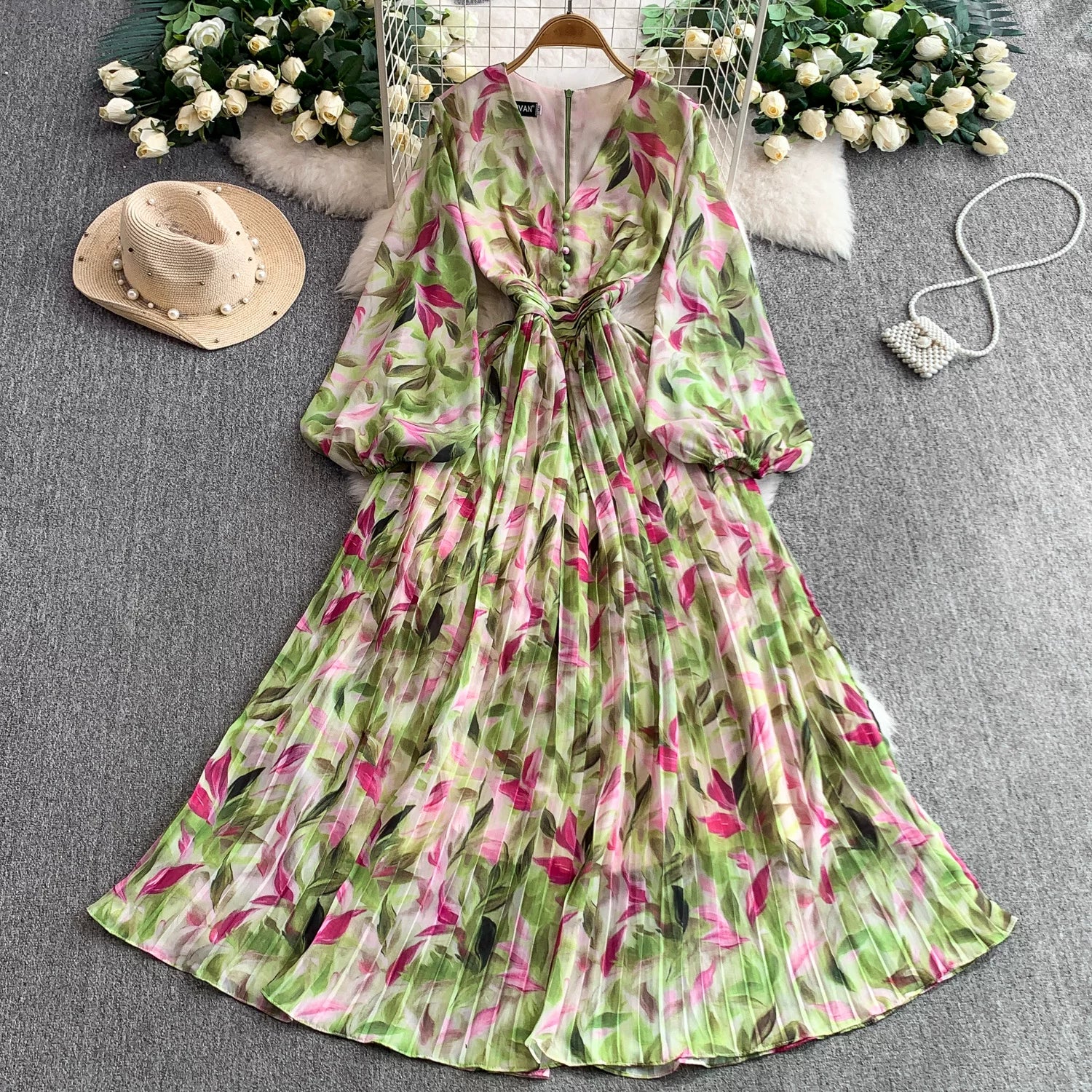 【ワンピース】Vネック ランタンスリーブ ウエストマーク プリーツ加工 花柄 フレア ロングワンピース レディース【SHシリーズ】