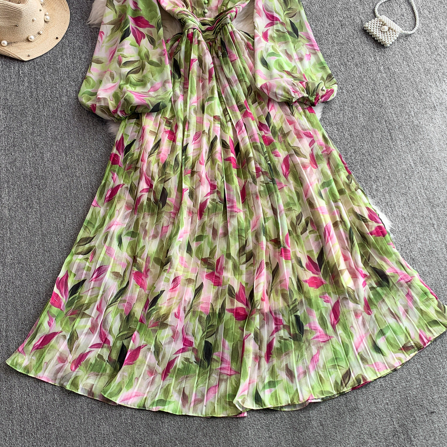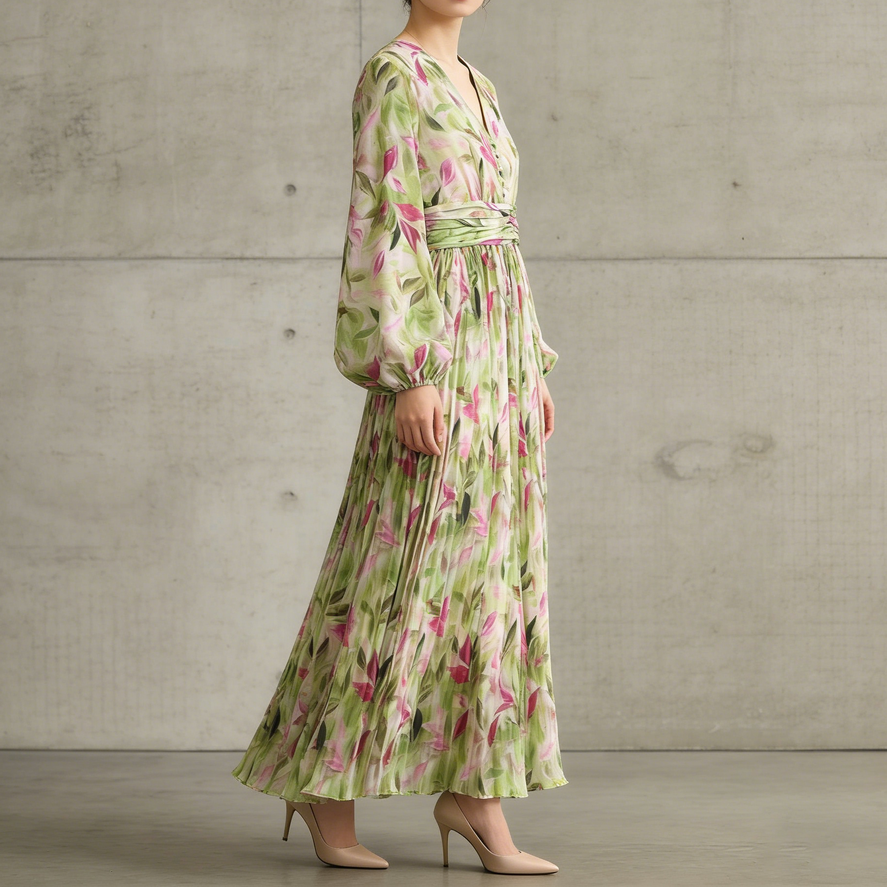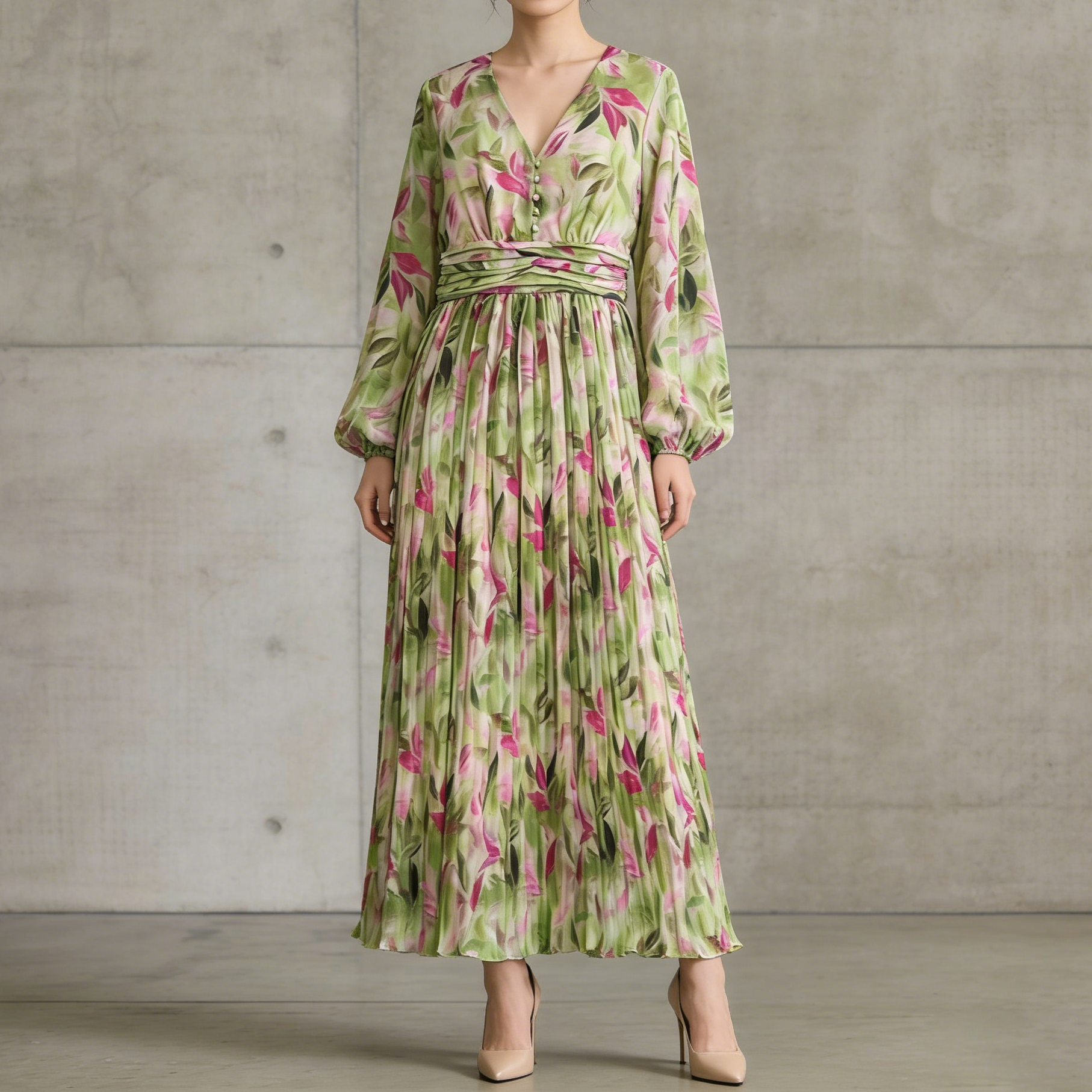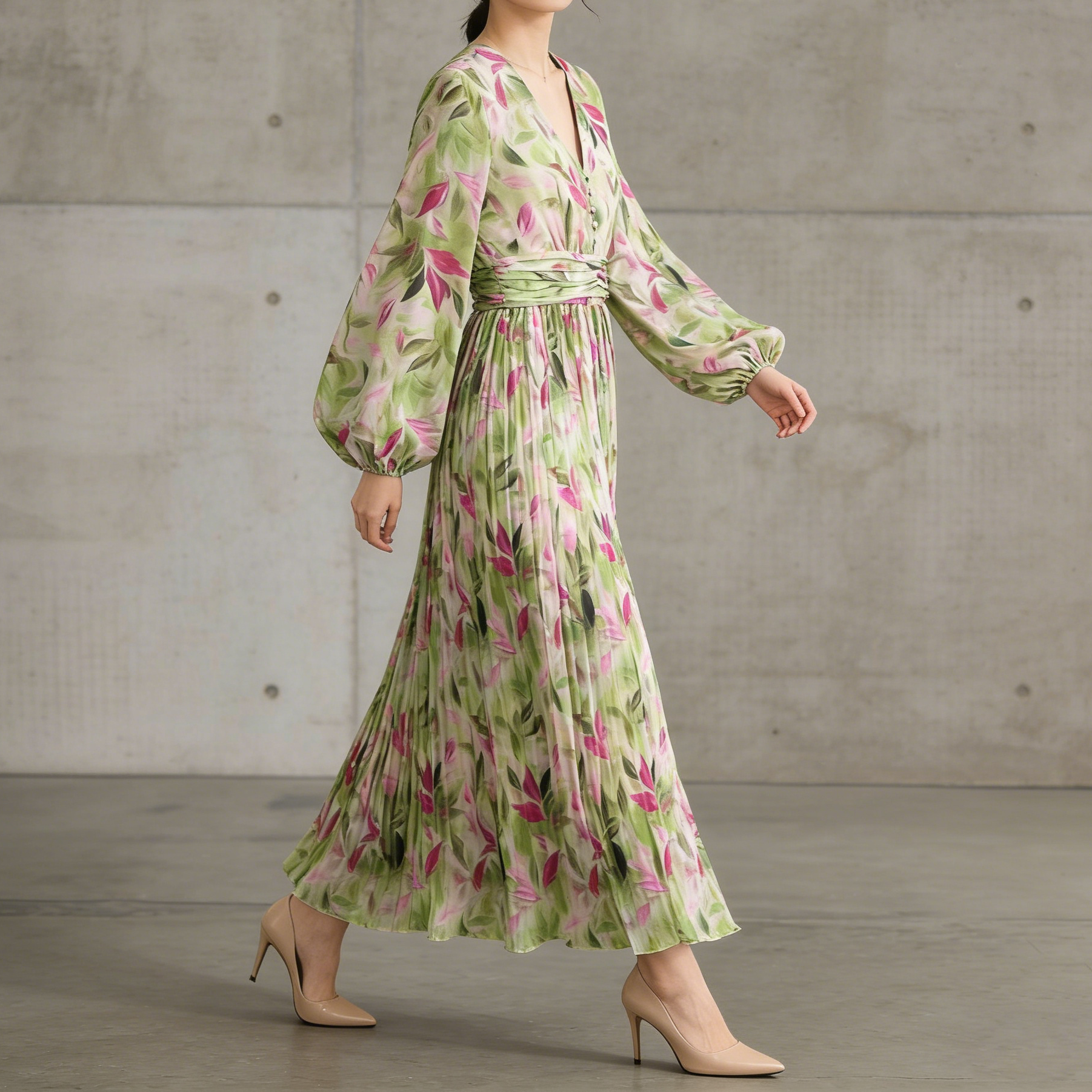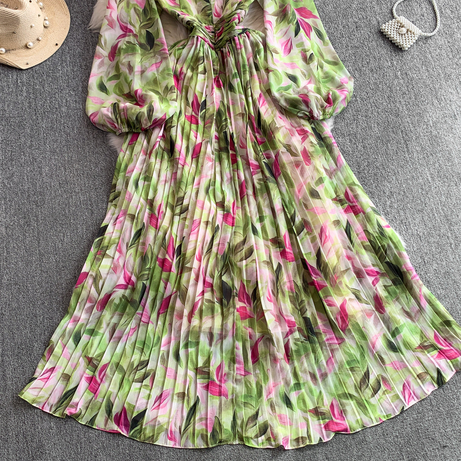 【ワンピース】Vネック ランタンスリーブ ウエストマーク プリーツ加工 花柄 フレア ロングワンピース レディース【SHシリーズ】