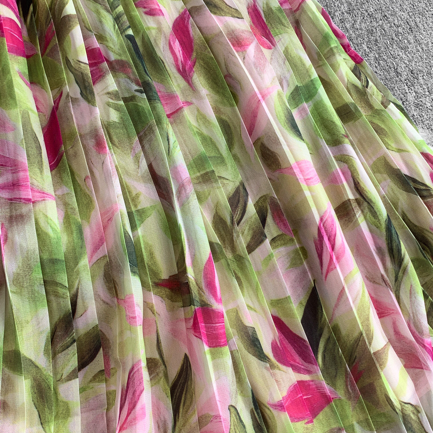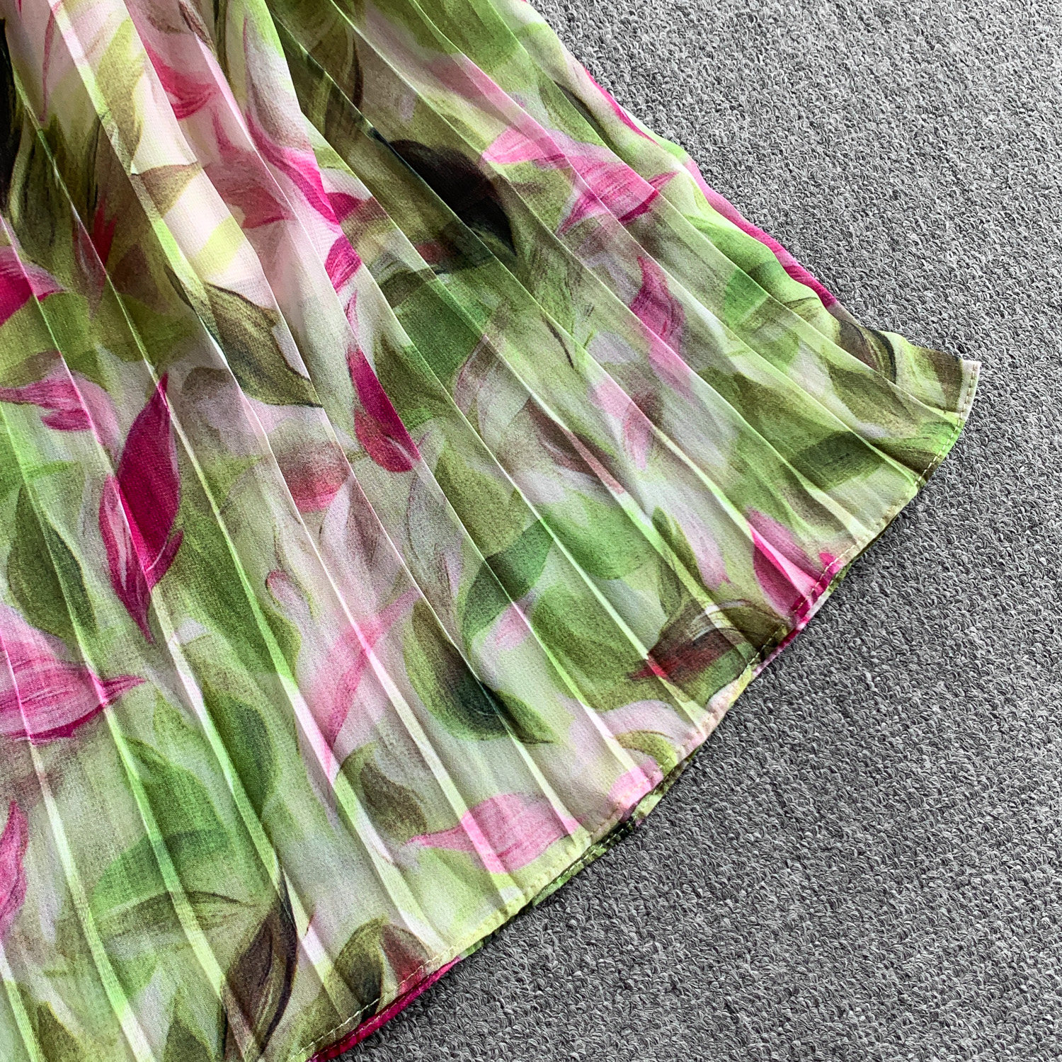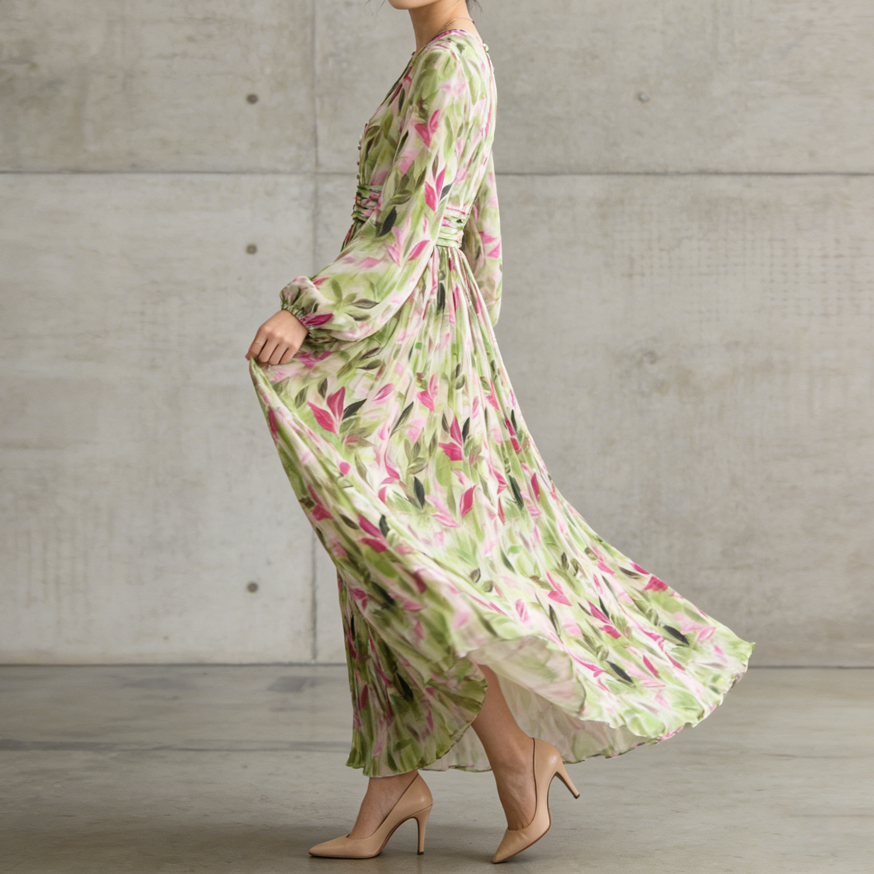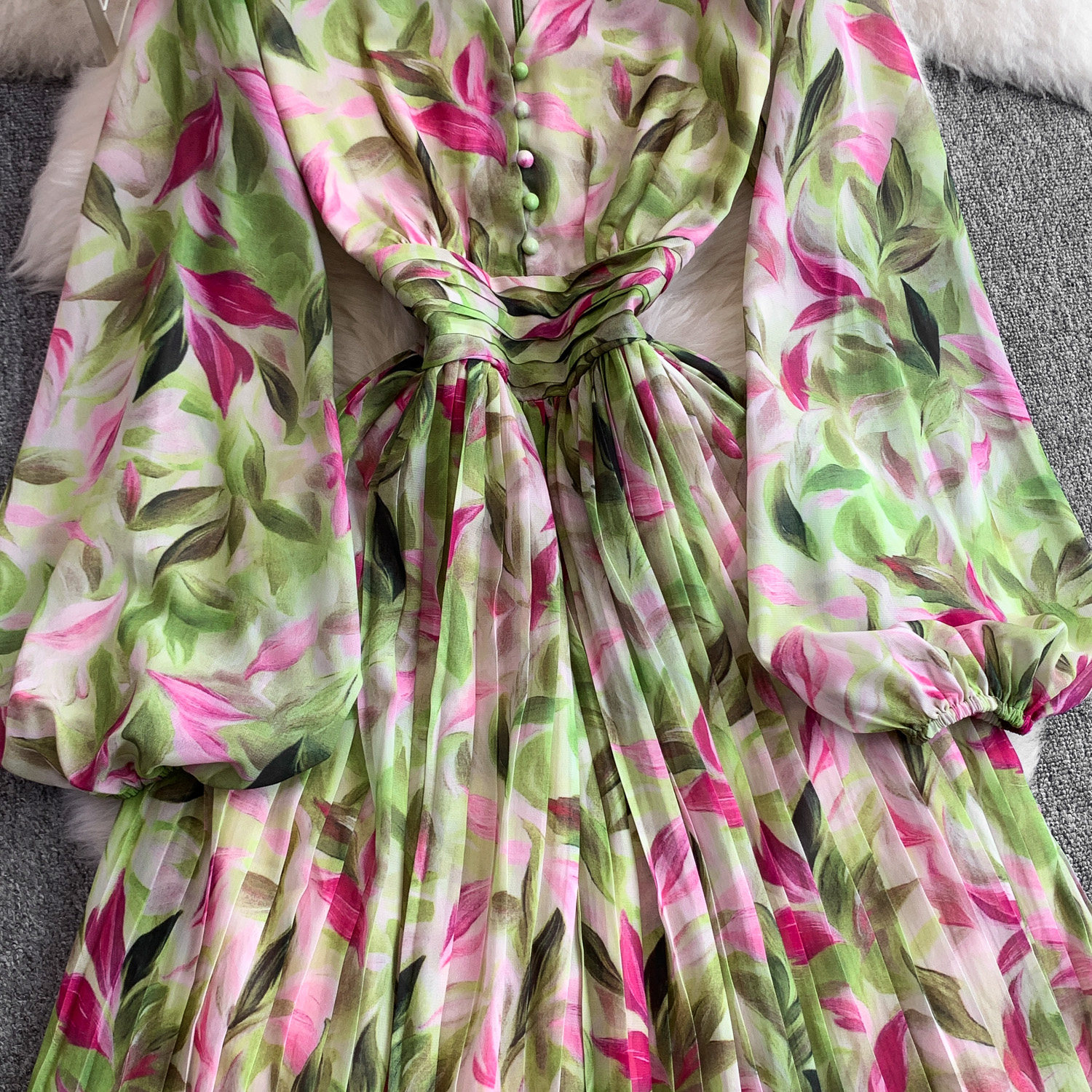 【ワンピース】Vネック ランタンスリーブ ウエストマーク プリーツ加工 花柄 フレア ロングワンピース レディース【SHシリーズ】