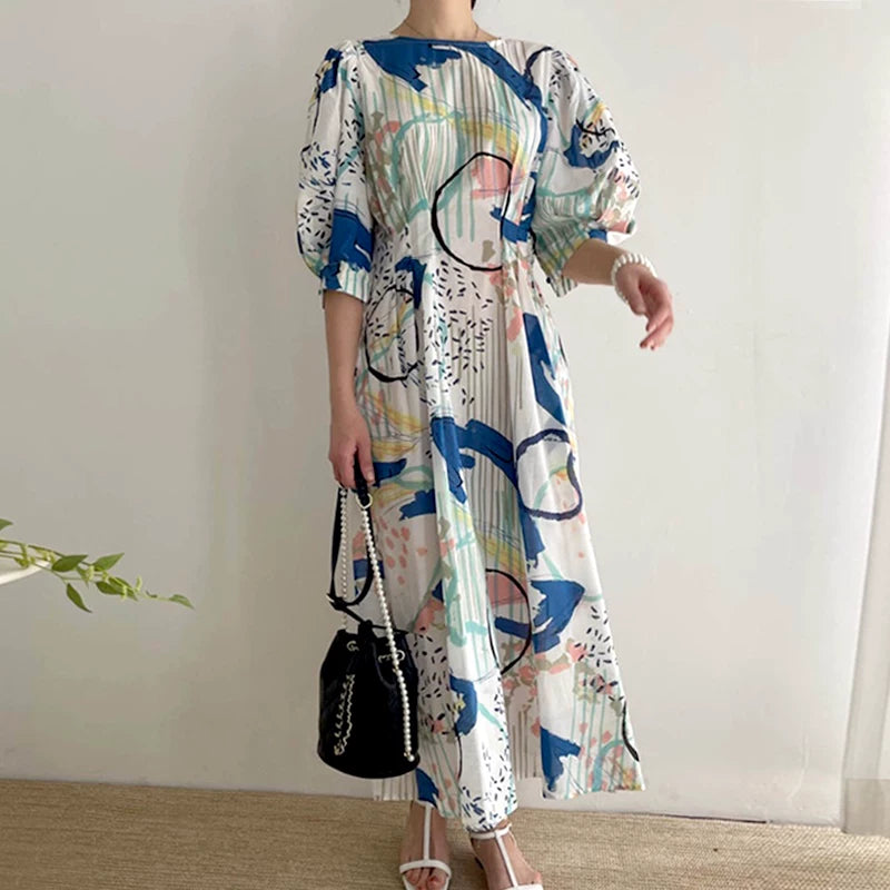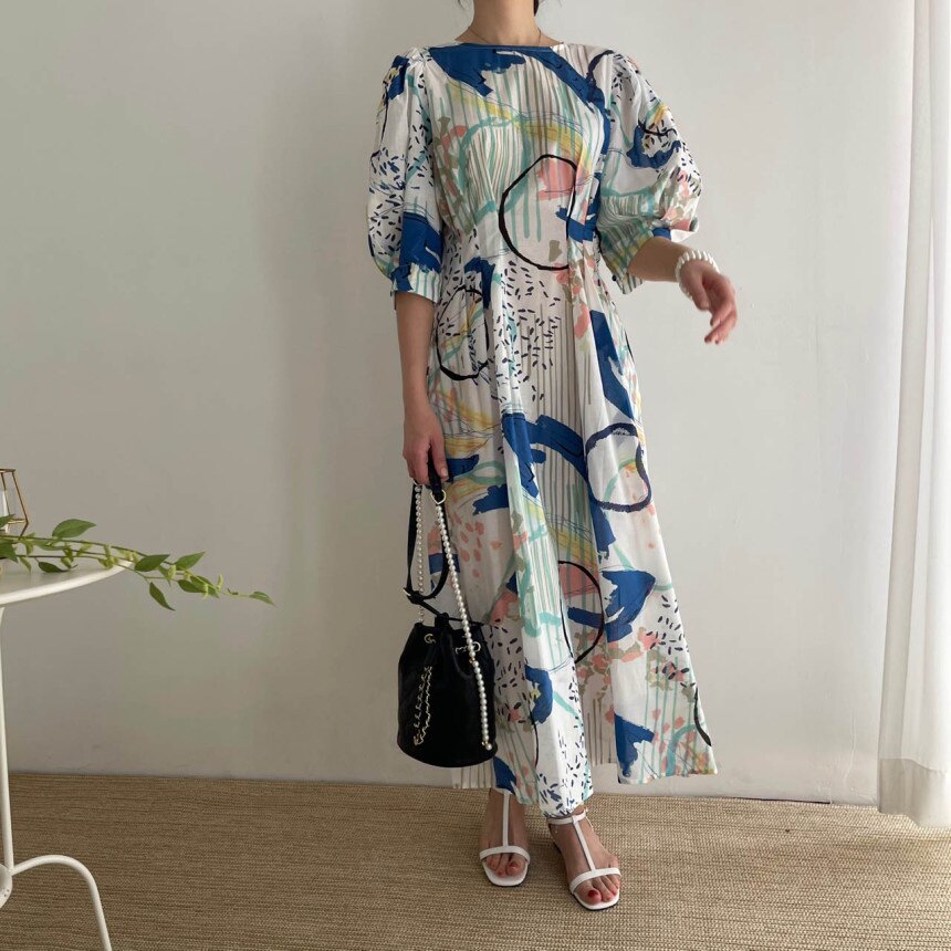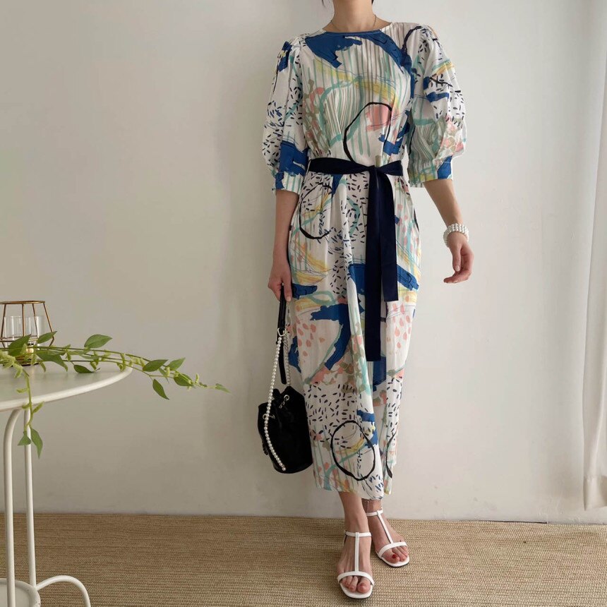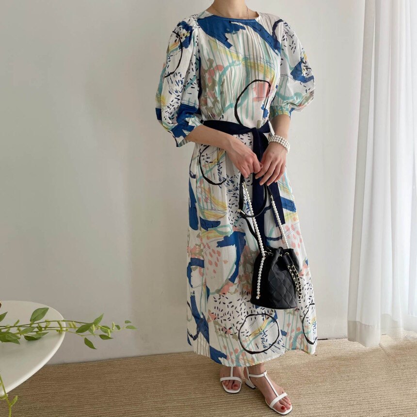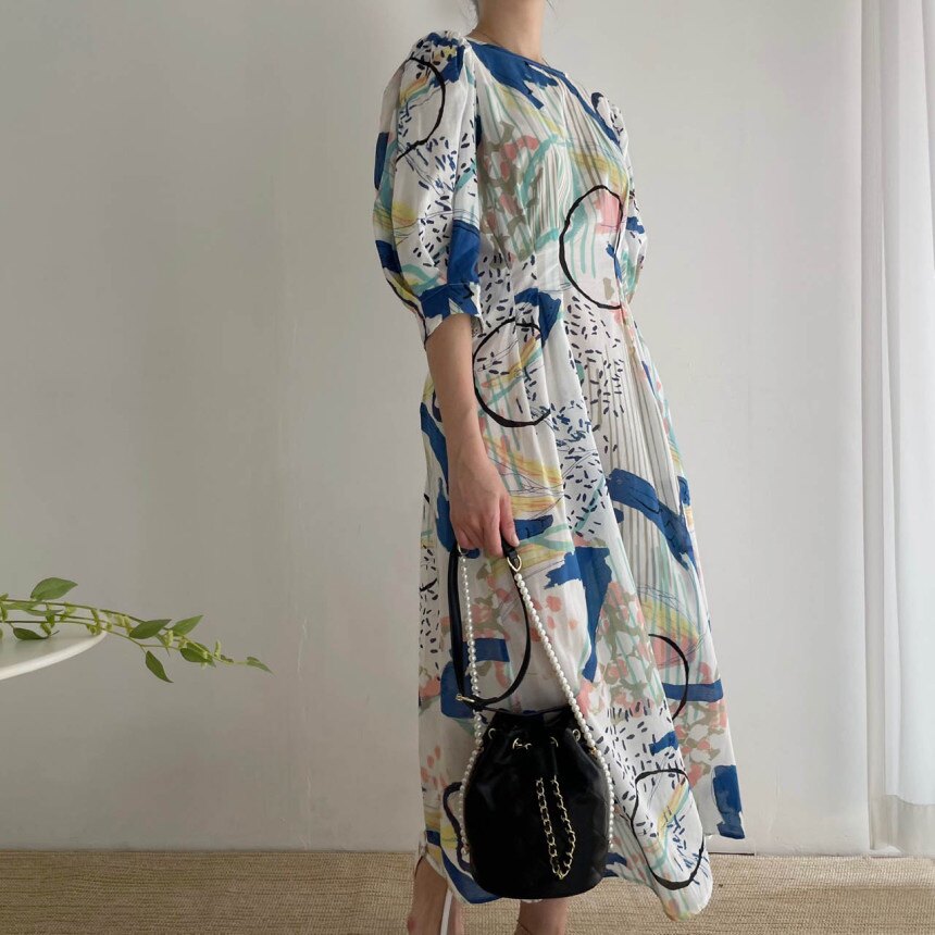 【ワンピース】夏新作 ラウンドネック プリント プリーツ 半袖ワンピース レディース ロング丈 【SHシリーズ】