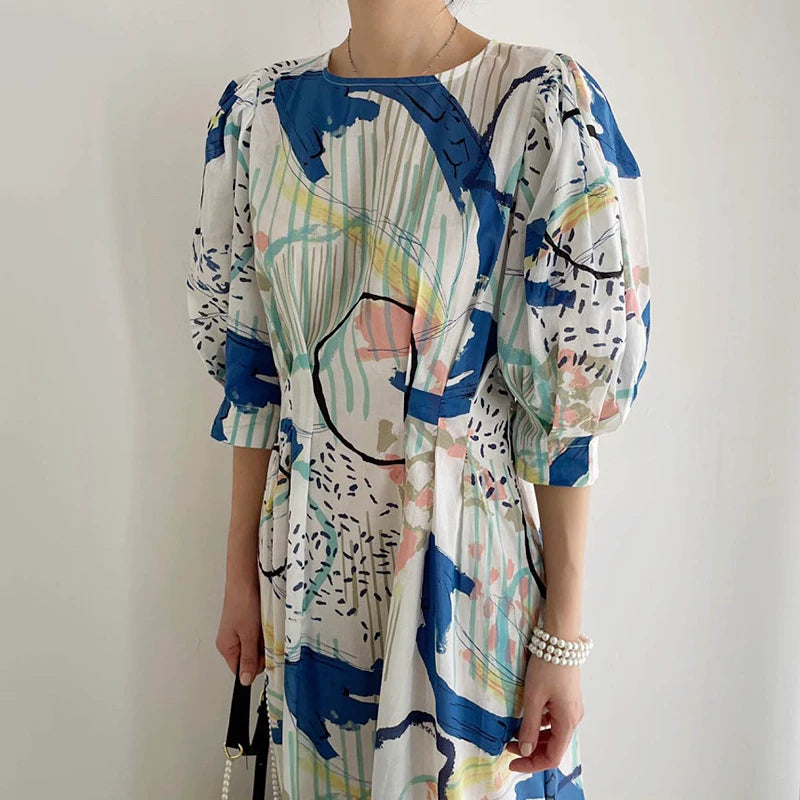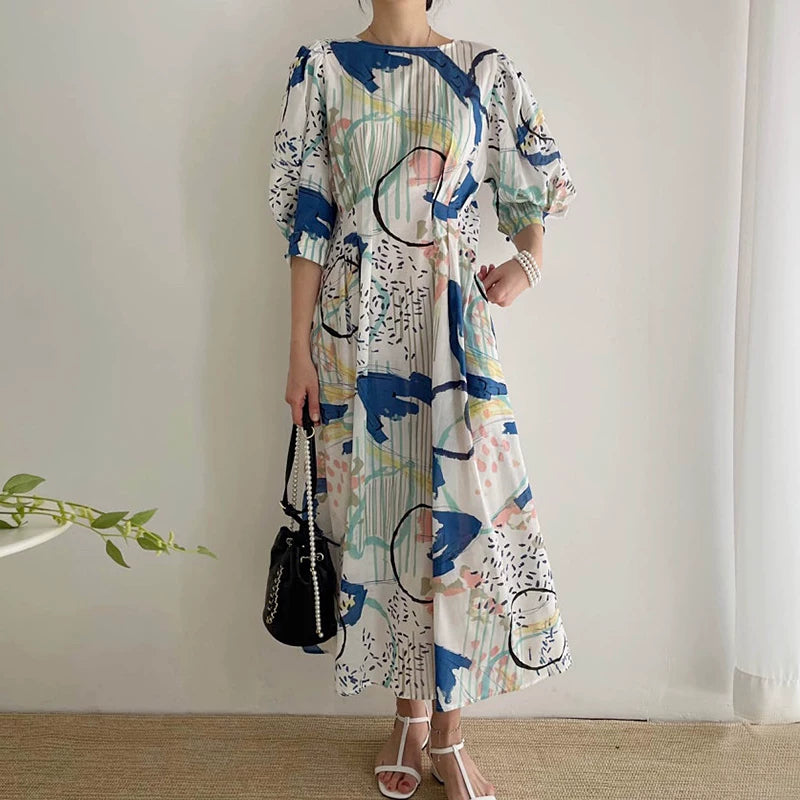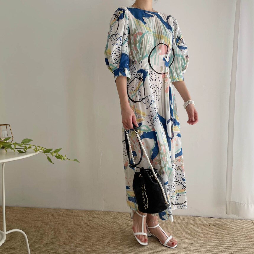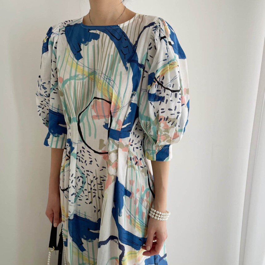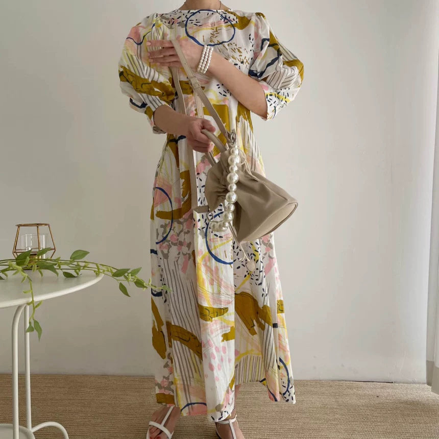 【ワンピース】夏新作 ラウンドネック プリント プリーツ 半袖ワンピース レディース ロング丈 【SHシリーズ】