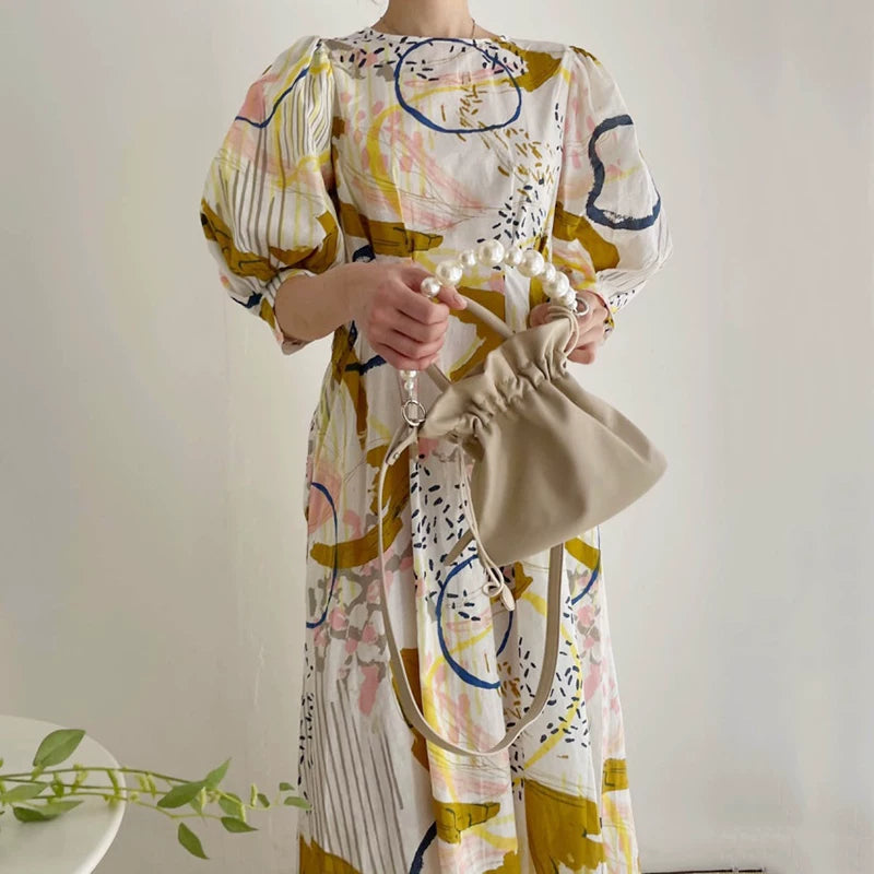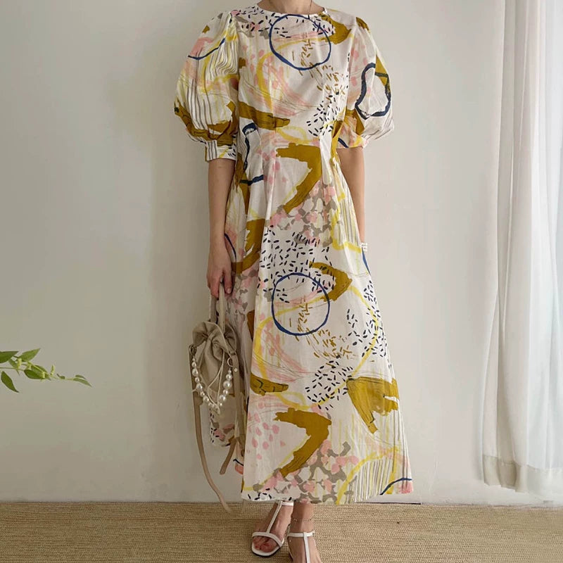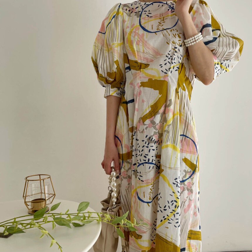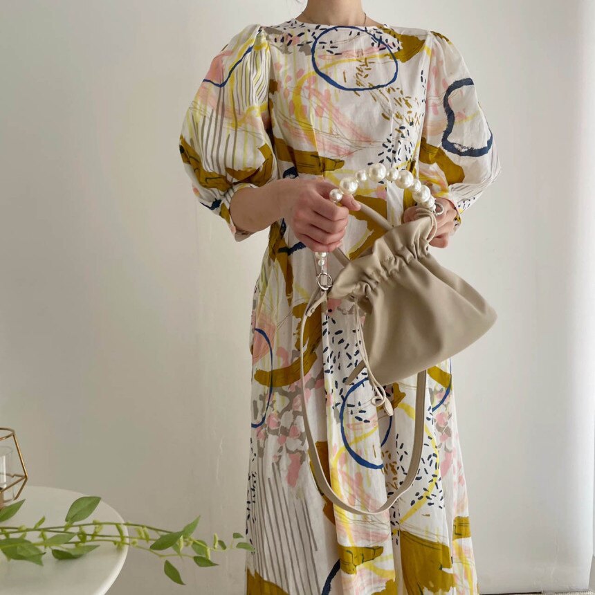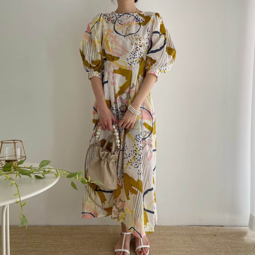 【商品名】【ワンピース】夏新作 ラウンドネック プリント プリーツ 半袖ワンピース レディース ロング丈【SHシリーズ】