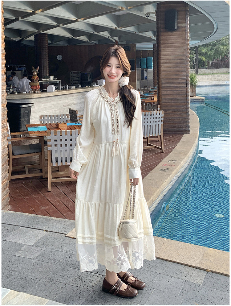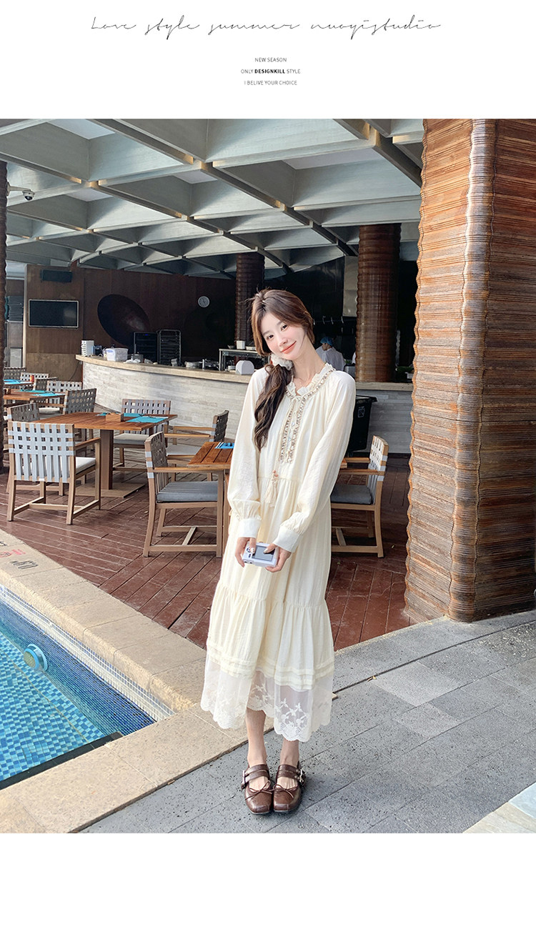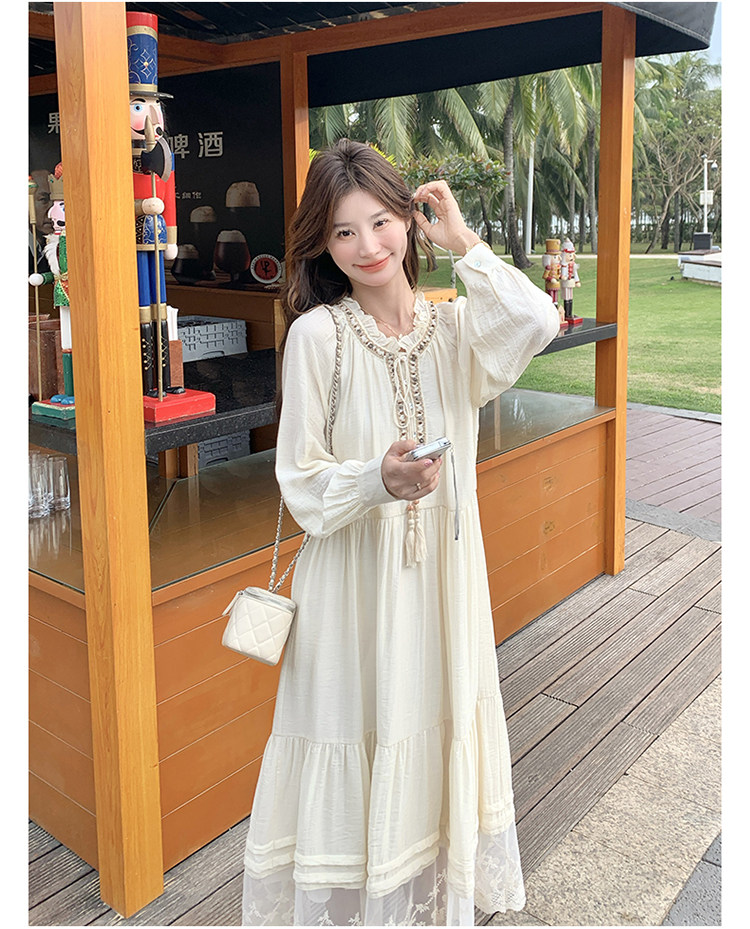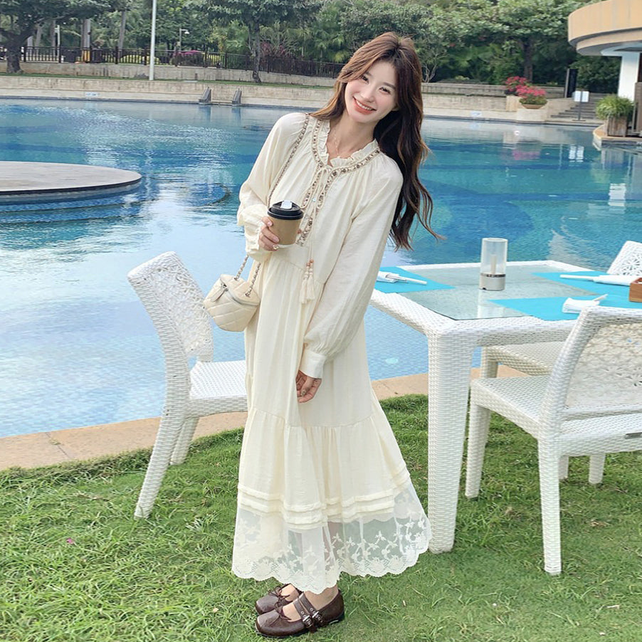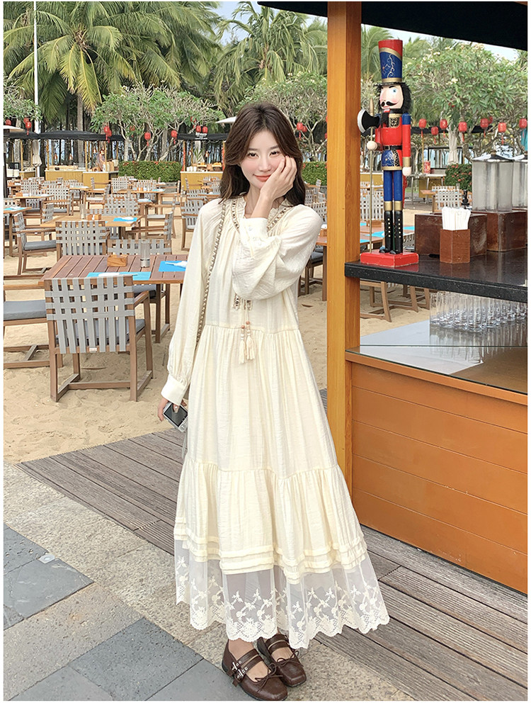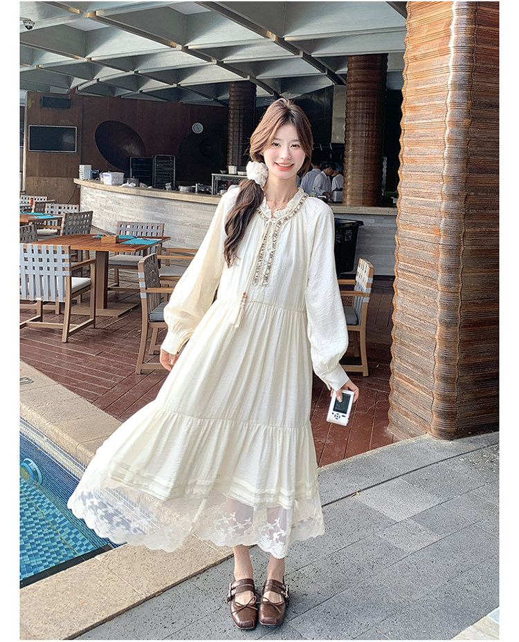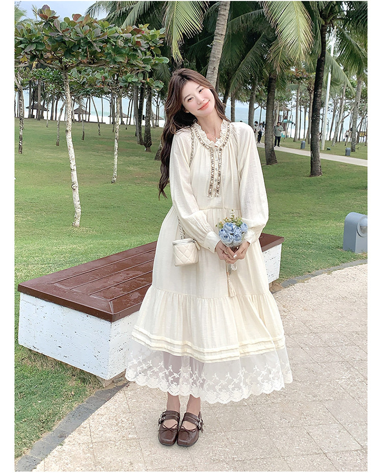 【商品名】【ワンピース】ベージュ フラワーレース刺繍襟 ワンピース レディース 新作 長袖 フェミニン フレンチ風ロングドレス【JZシリーズ】