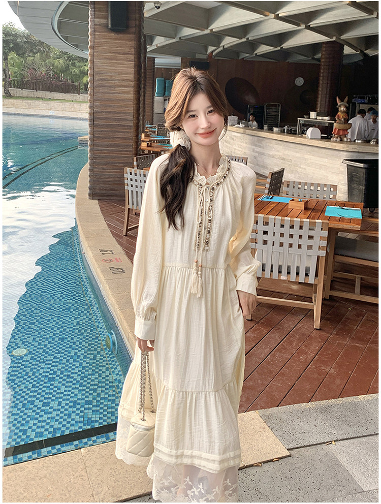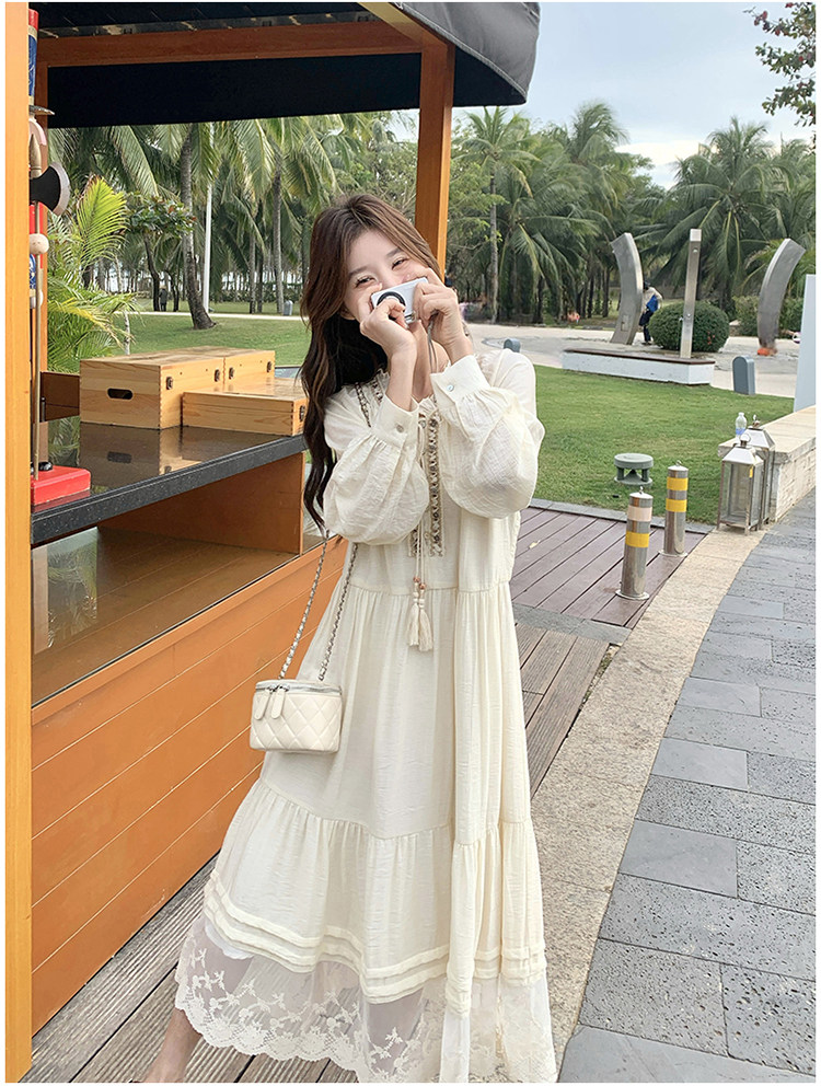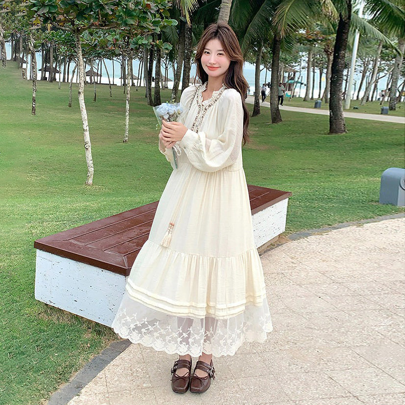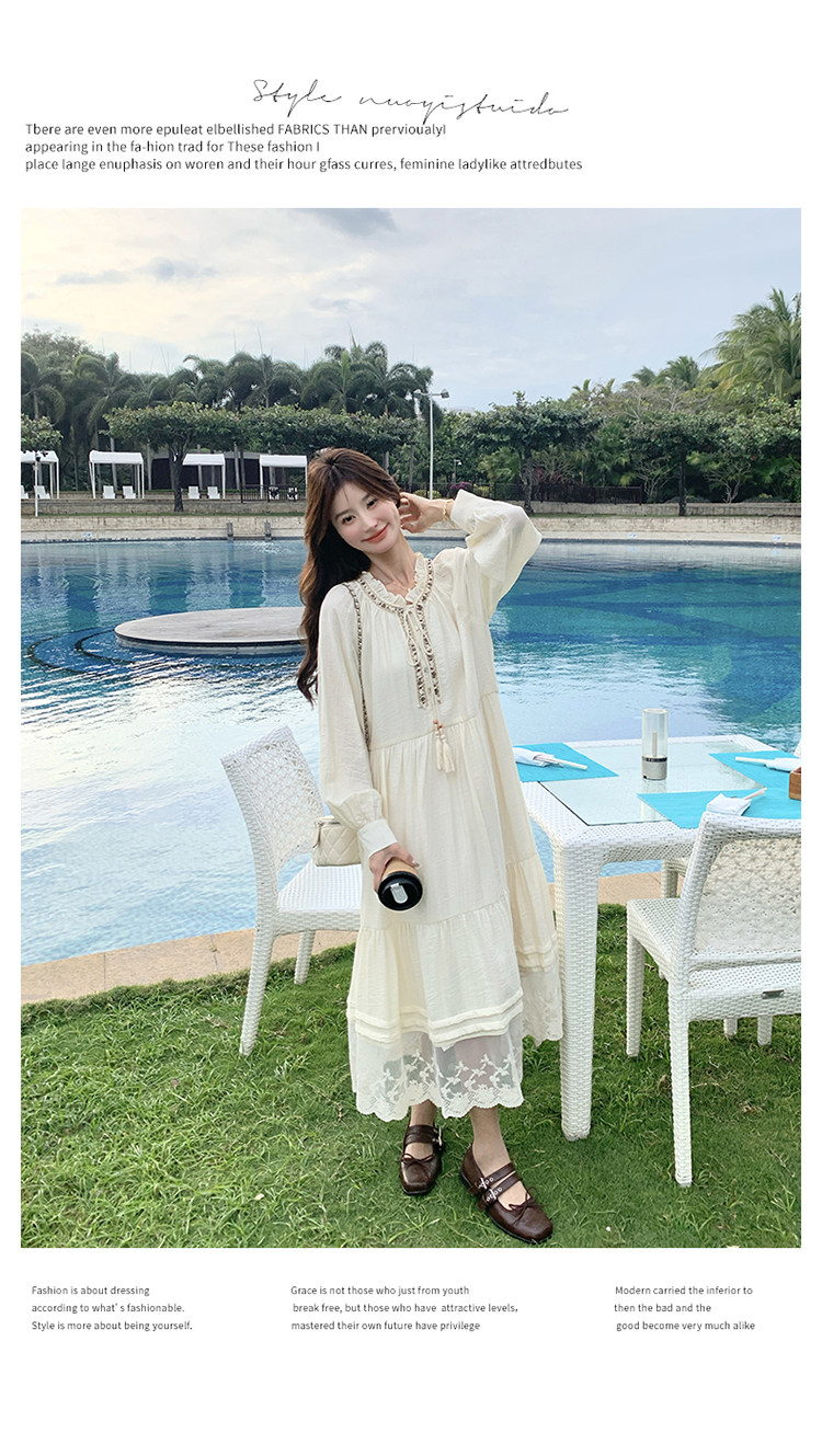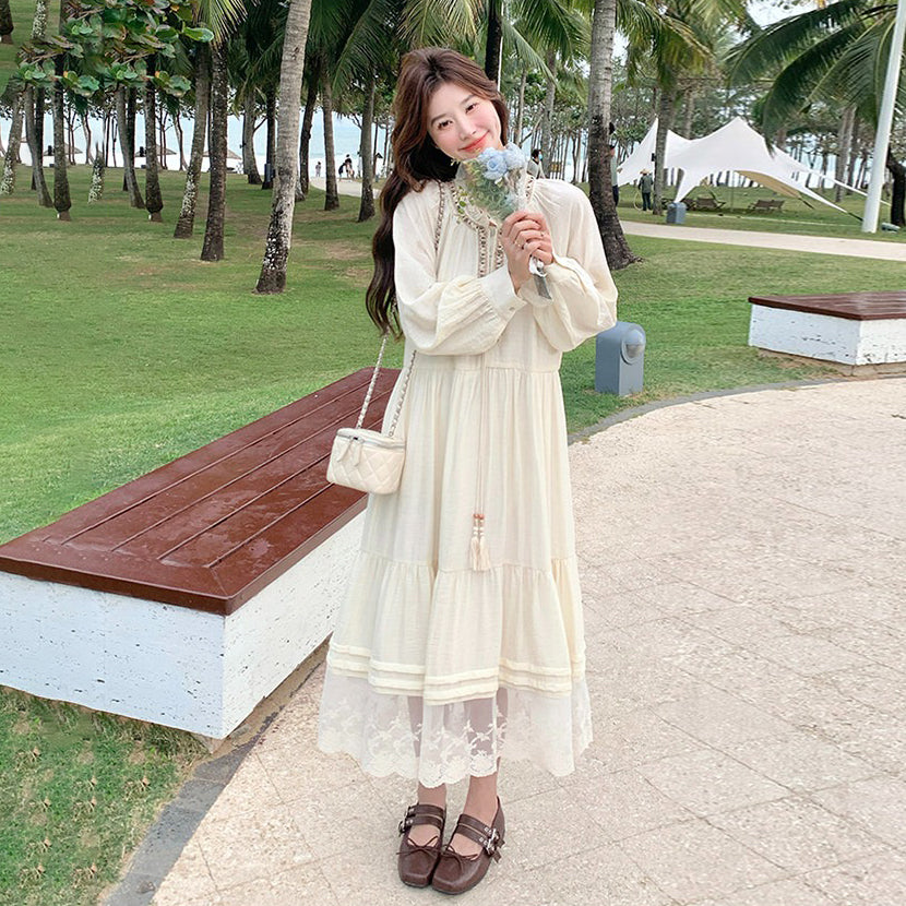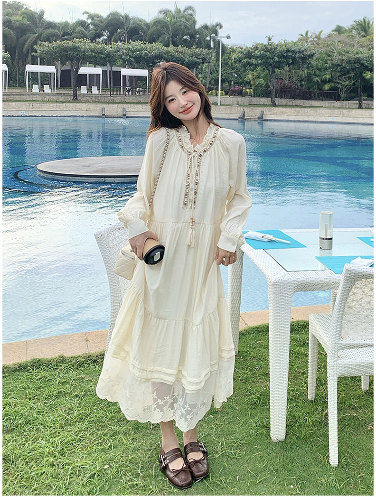 【商品名】【ワンピース】ベージュ フラワーレース刺繍襟 ワンピース レディース 新作 長袖 フェミニン フレンチ風ロングドレス【JZシリーズ】