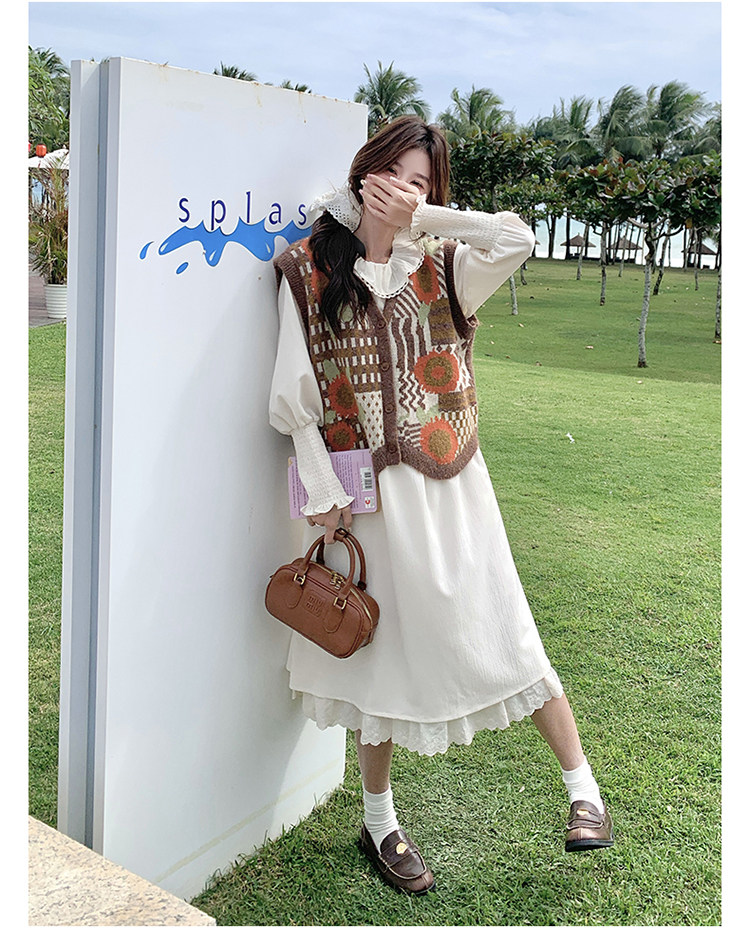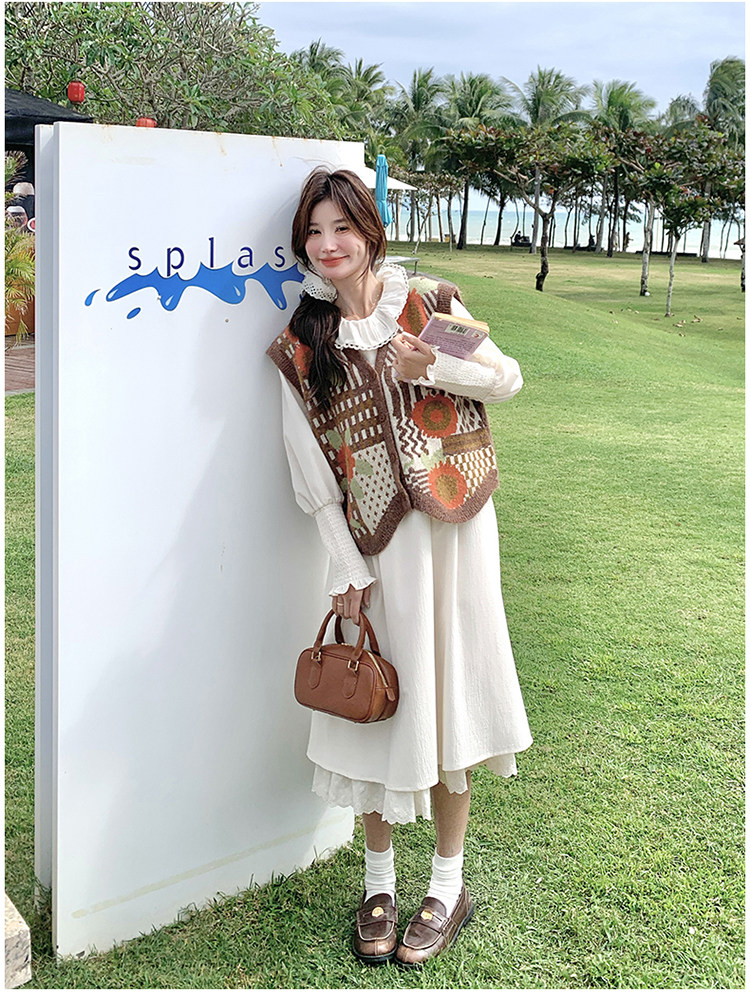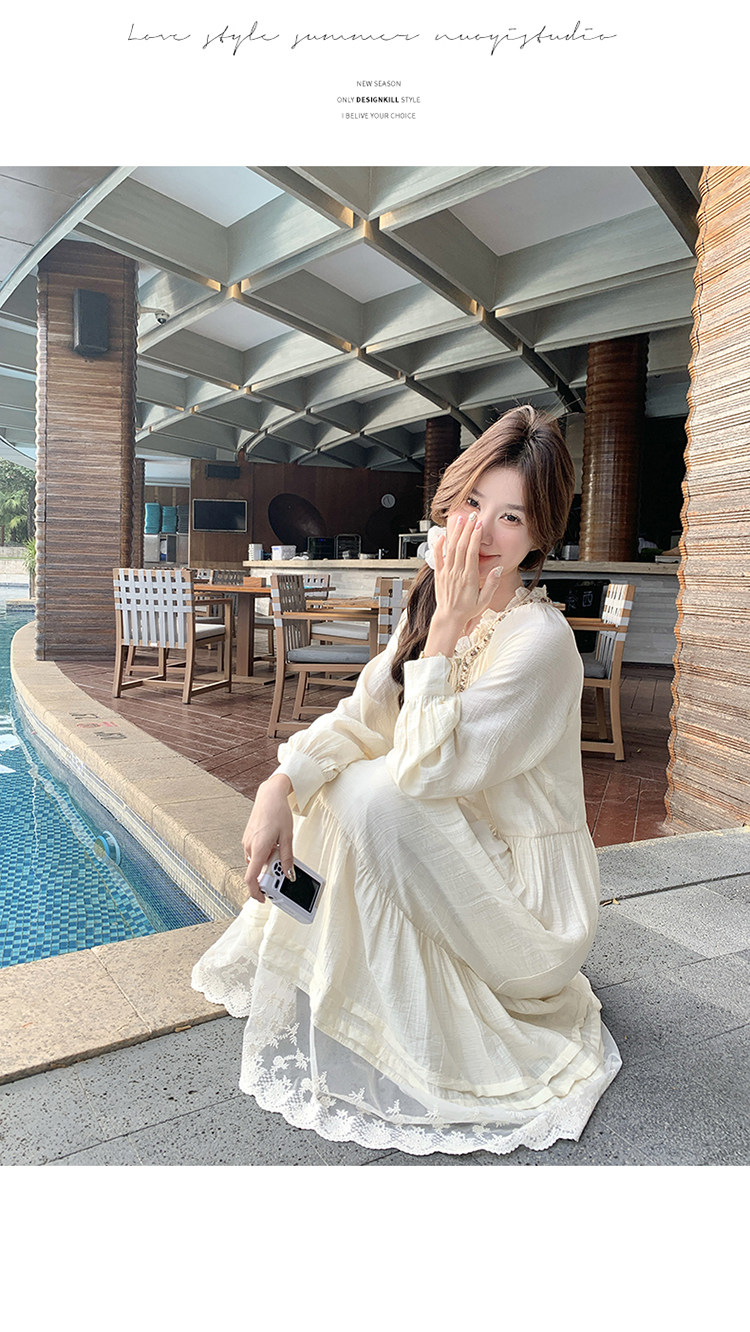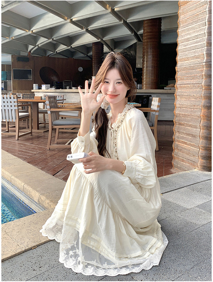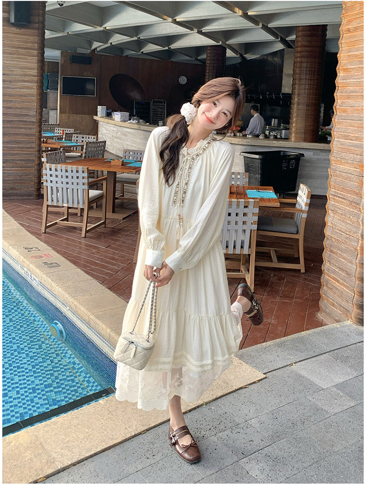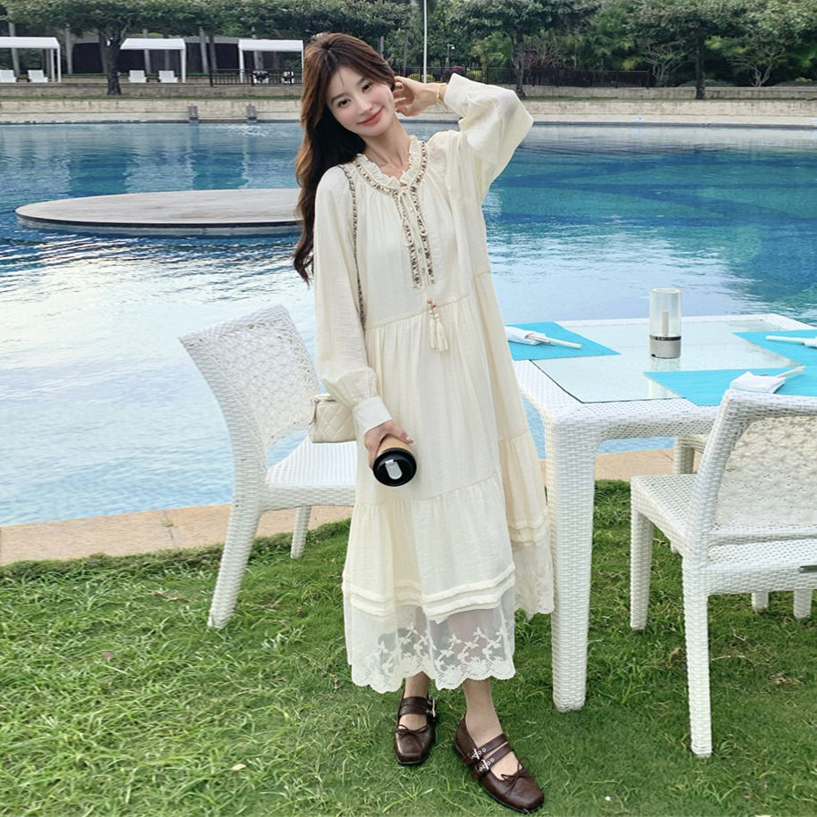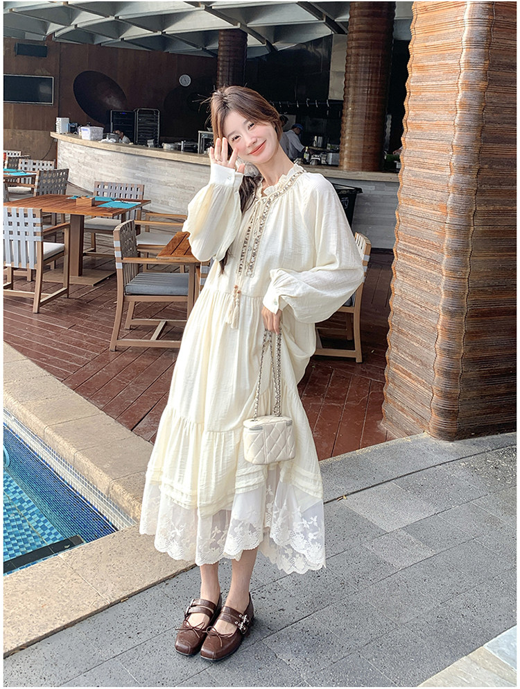 【商品名】【ワンピース】ベージュ フラワーレース刺繍襟 ワンピース レディース 新作 長袖 フェミニン フレンチ風ロングドレス【JZシリーズ】