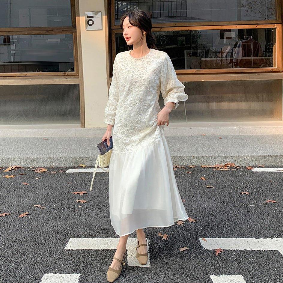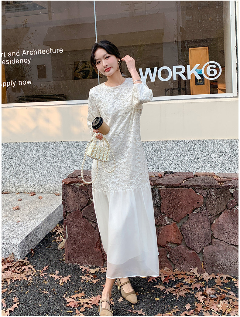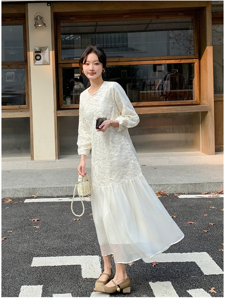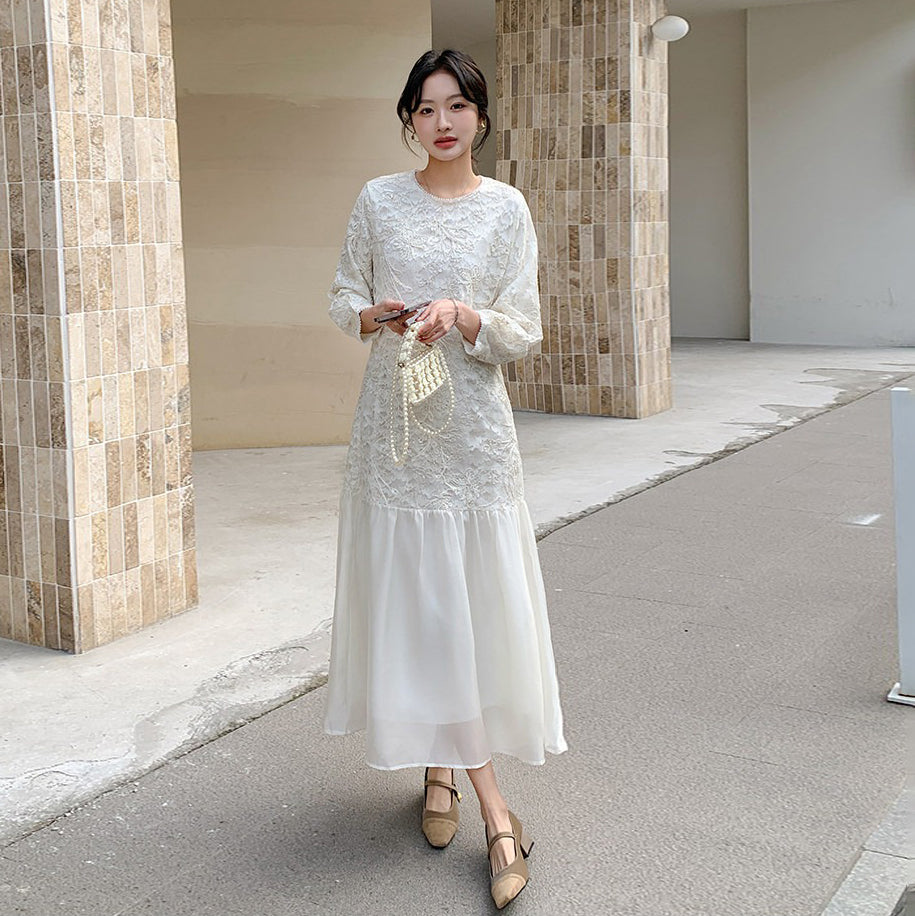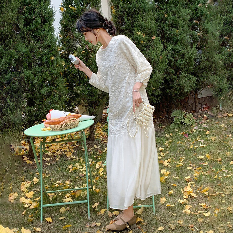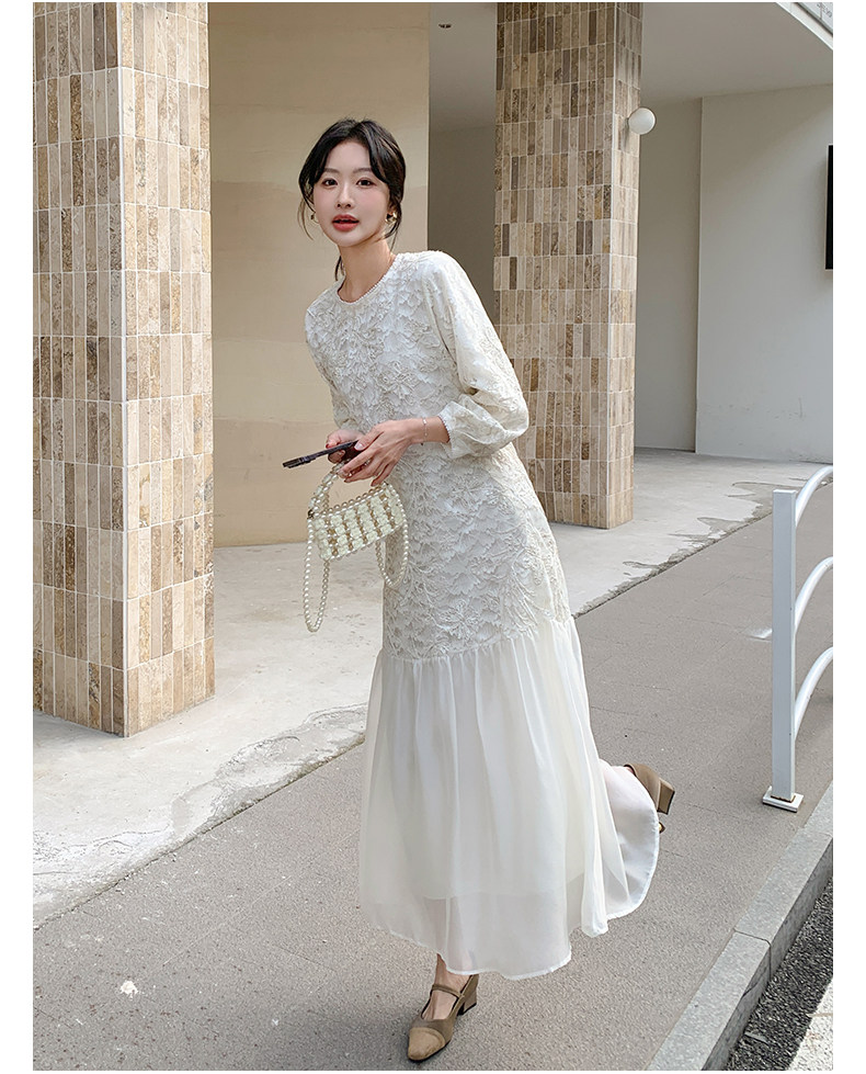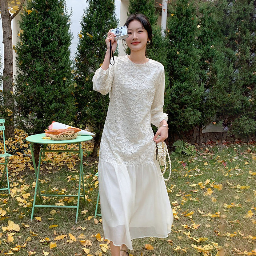 【ワンピース】フレンチ風フェミニンレースワンピース レディース 気品ある軽奢感 花柄長袖ミディドレス【JZシリーズ】