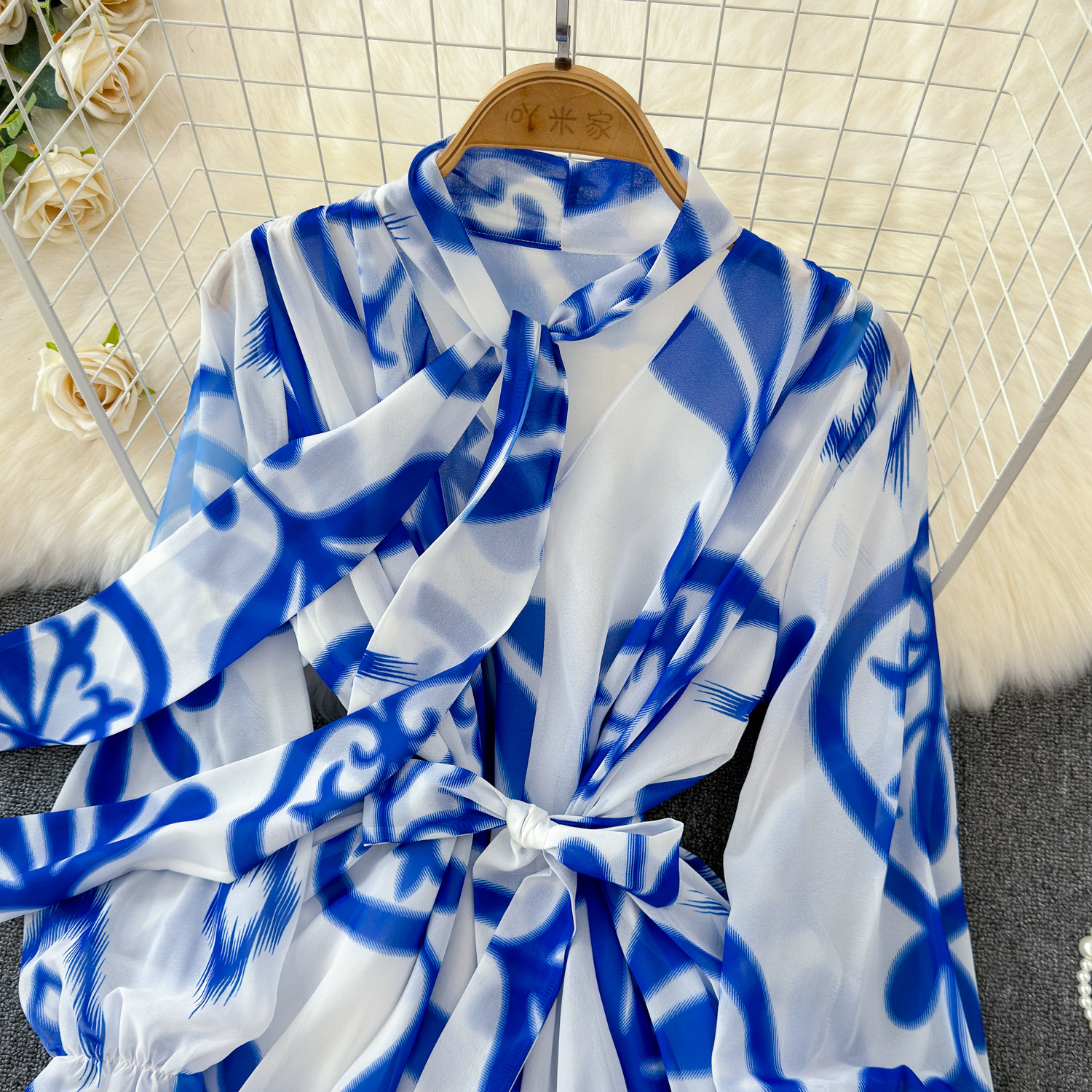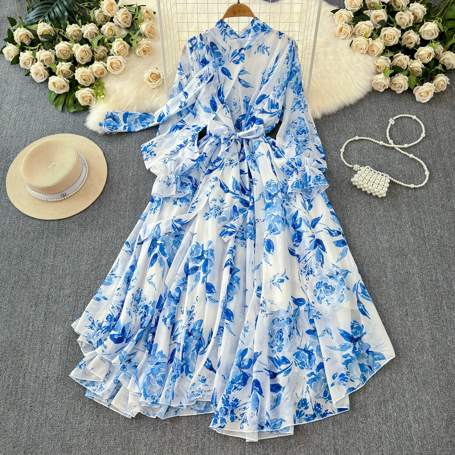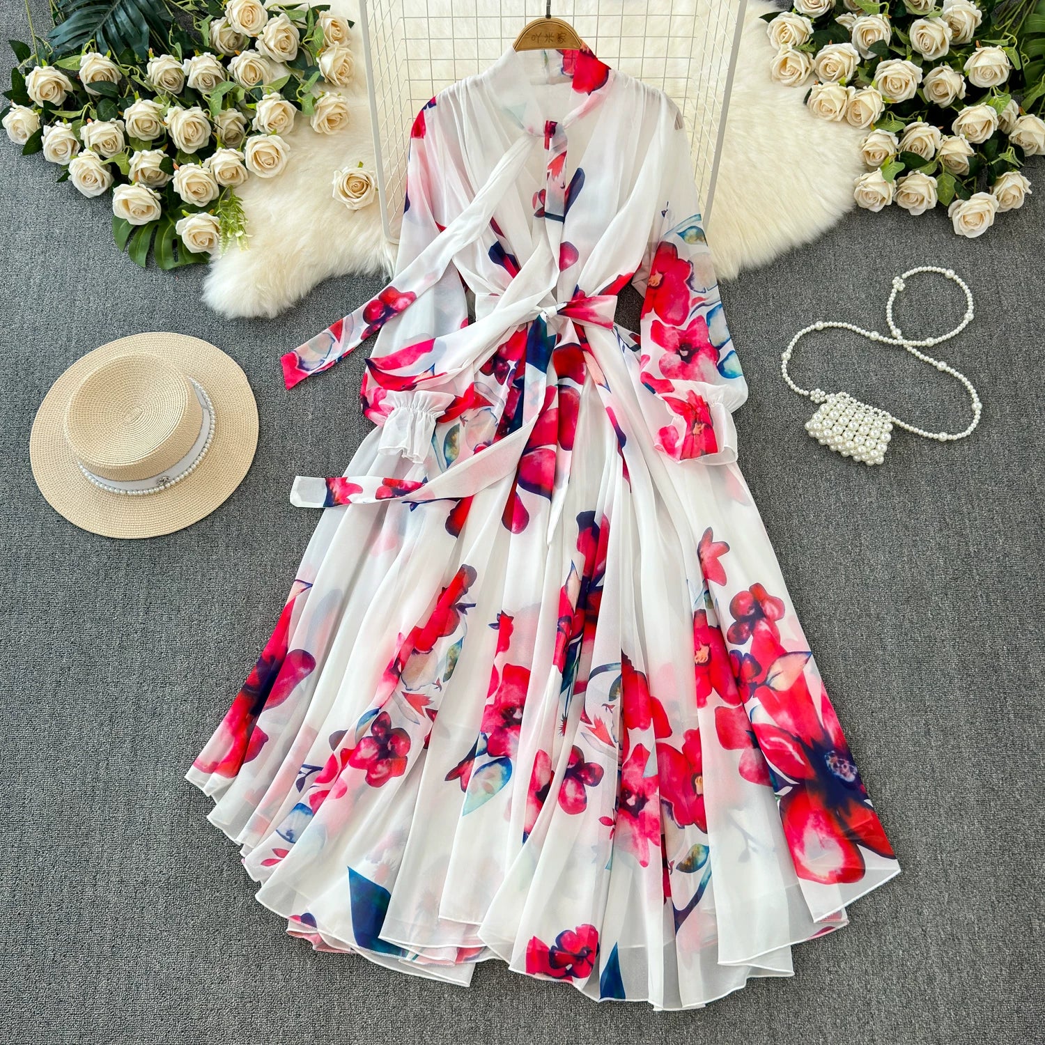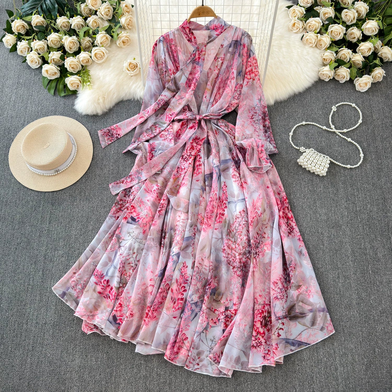 【商品名】【ワンピース】フレンチエレガンス 気質 レディース シフォン 長袖ワンピース 蝶結びネック フレア 大人可愛い【SHシリーズ】