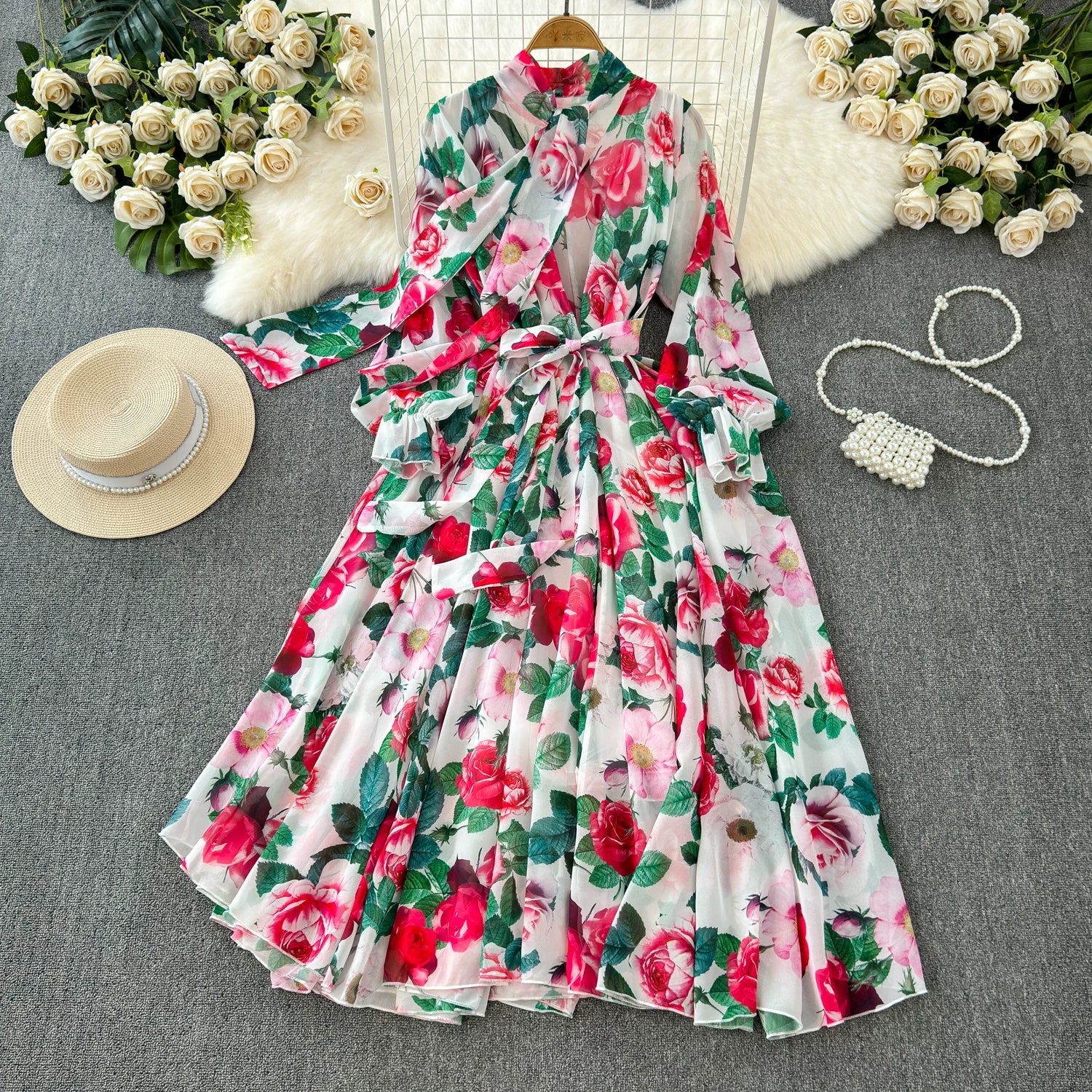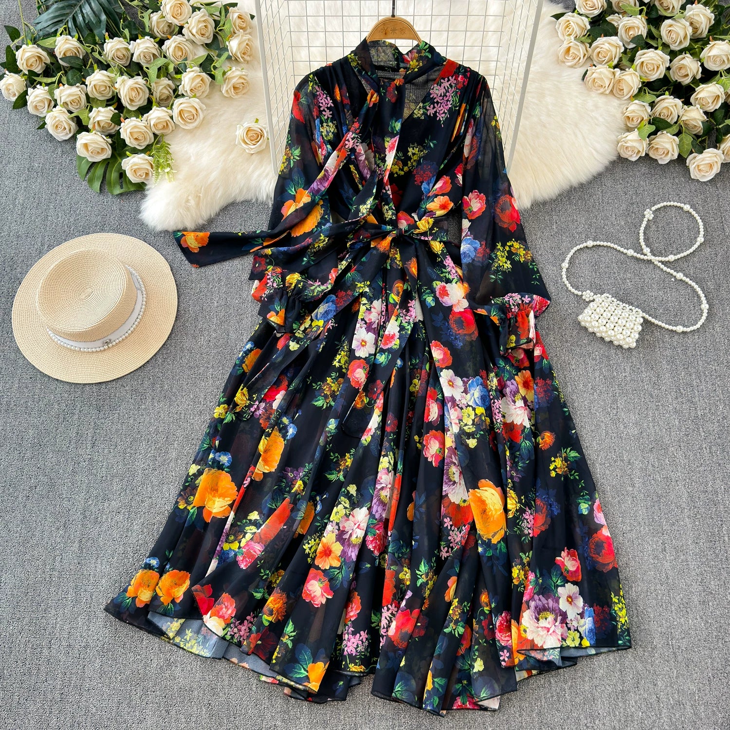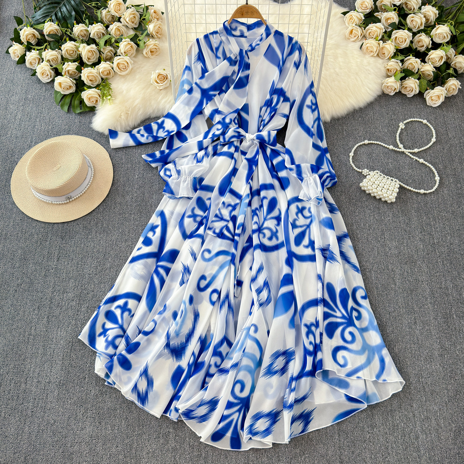 【商品名】【ワンピース】フレンチエレガンス 気質 レディース シフォン 長袖ワンピース 蝶結びネック フレア 大人可愛い【SHシリーズ】