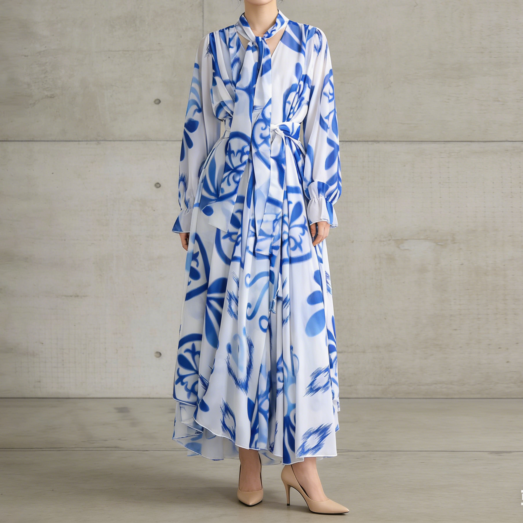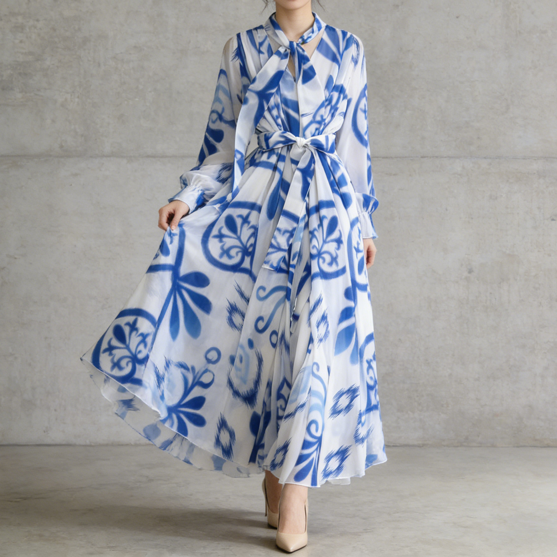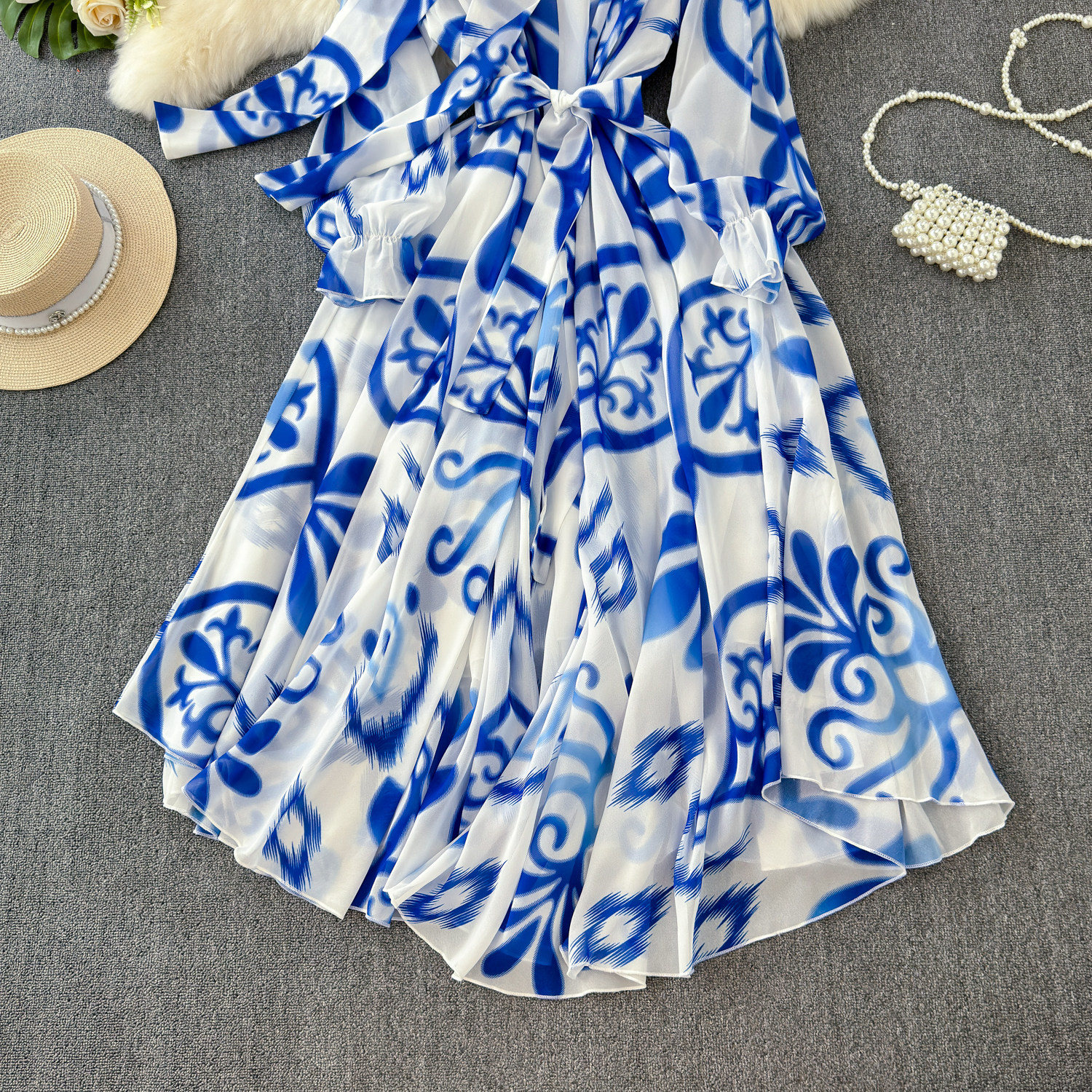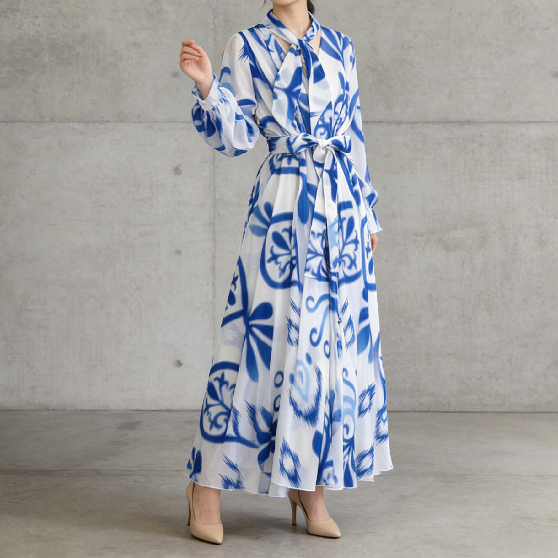 【商品名】【ワンピース】フレンチエレガンス 気質 レディース シフォン 長袖ワンピース 蝶結びネック フレア 大人可愛い【SHシリーズ】