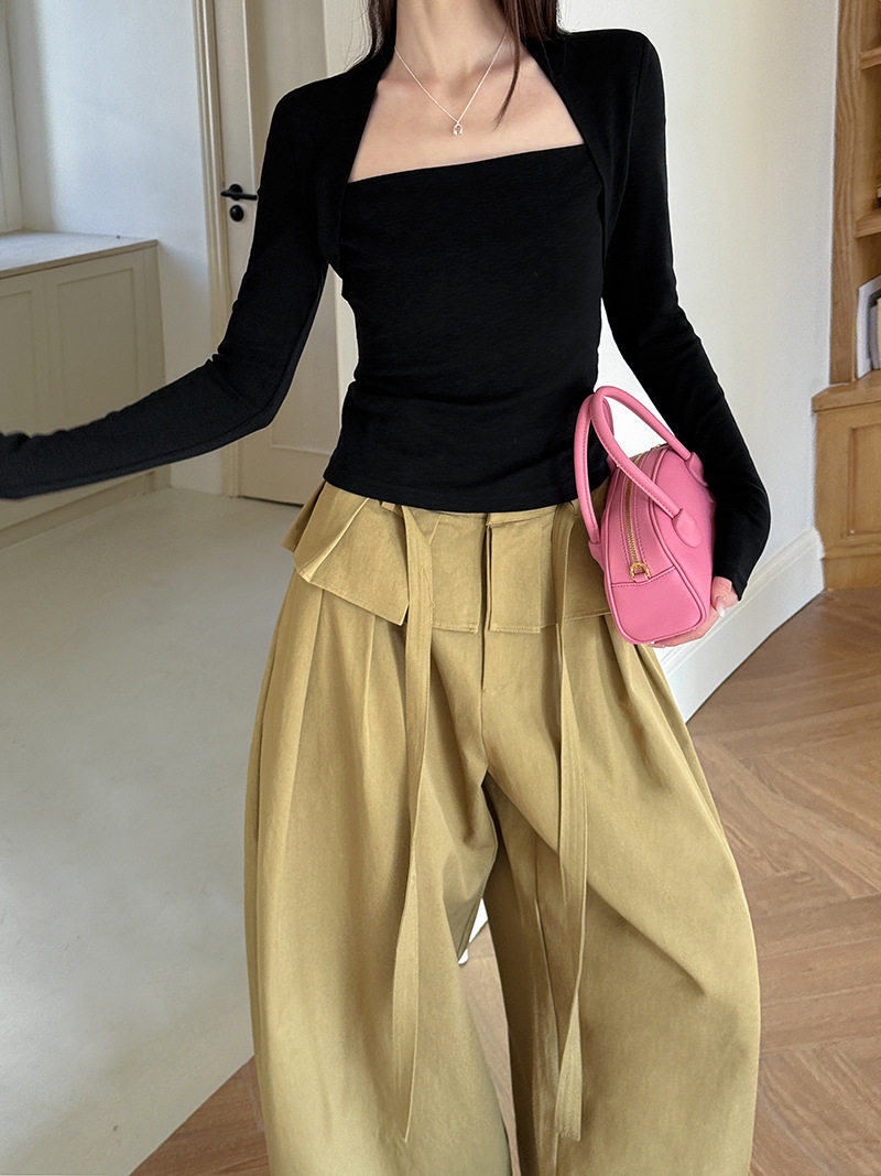 【ボトムス】デザイン感 フェイクレイヤード レース切替 ハイウエストワイドパンツ レディース 春新作 ゆったり カジュアルスラックス【JZシリーズ】