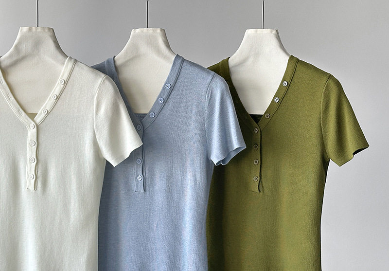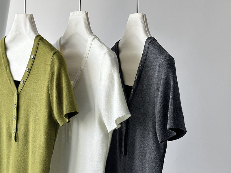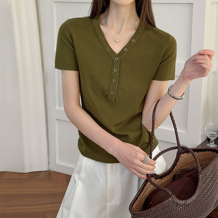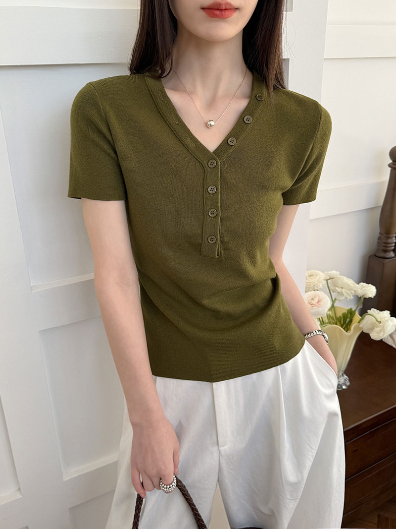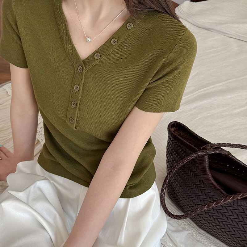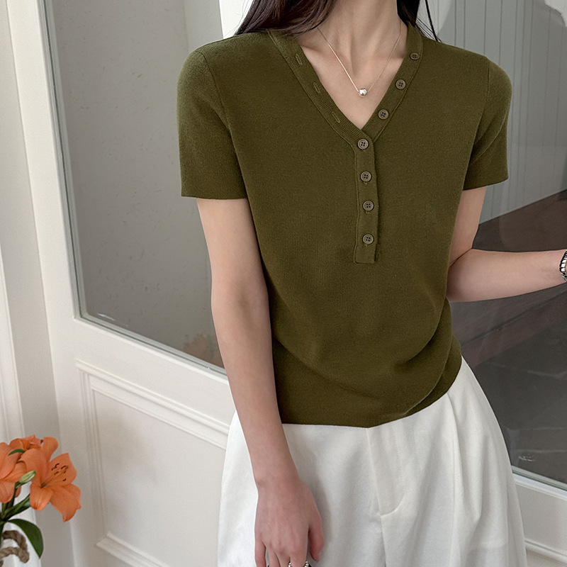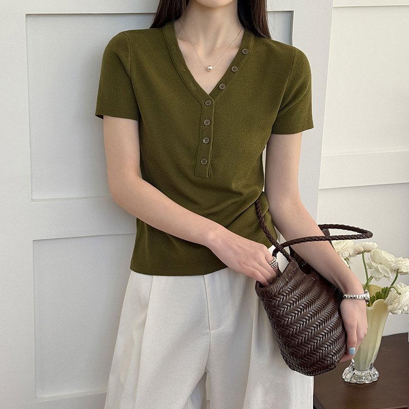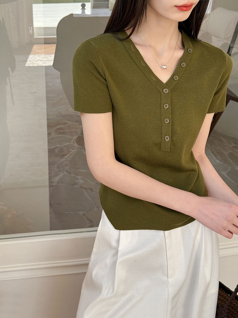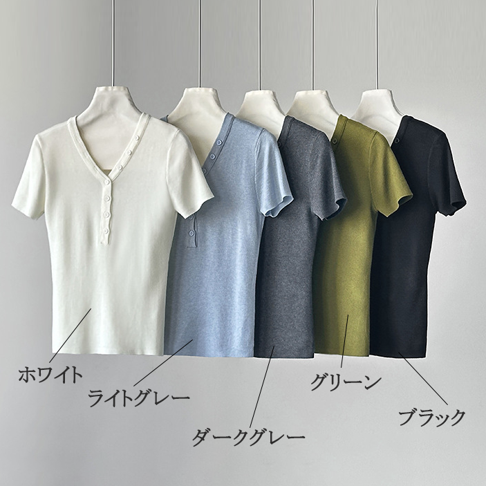 【トップス】Vネック ニットトップス レディース 春新作 半袖 フィット 体型カバー きれいめ カジュアル【JZシリーズ】