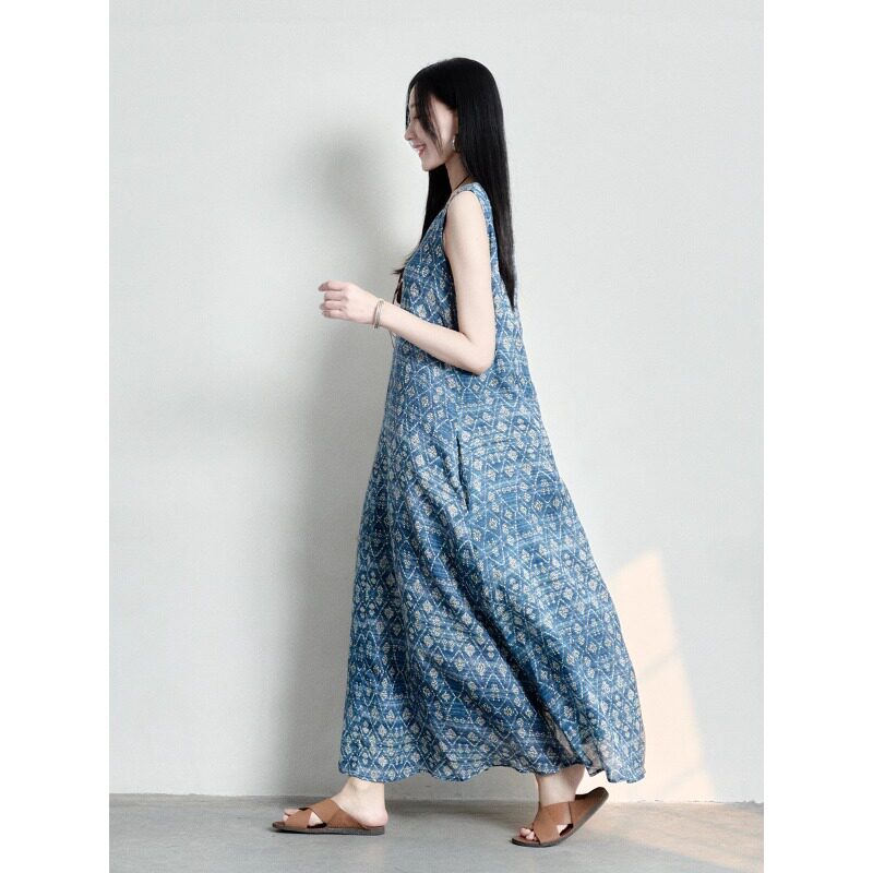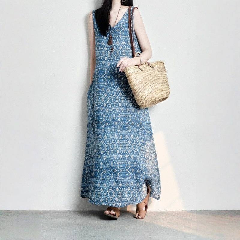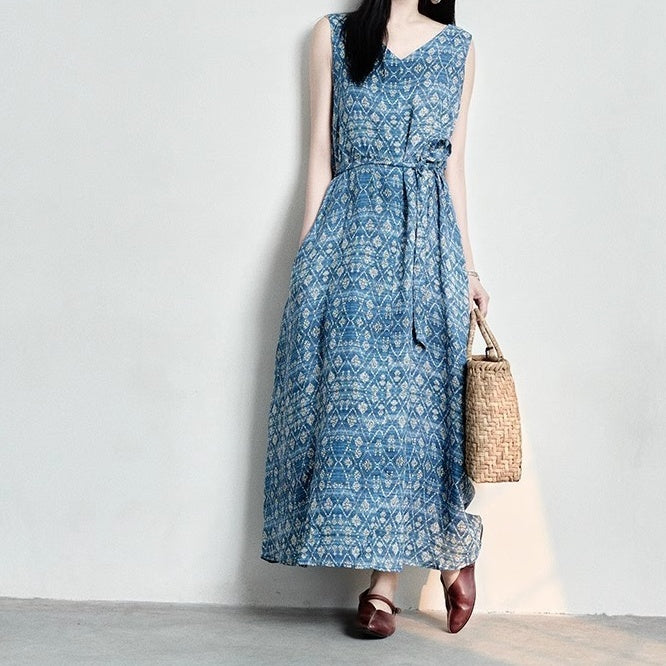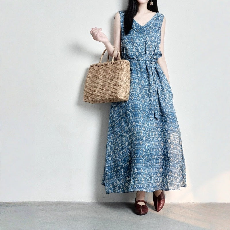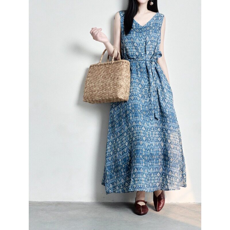 【ワンピース】Vネック レトロ プリント ノースリーブ ワンピース 【SHシリーズ】