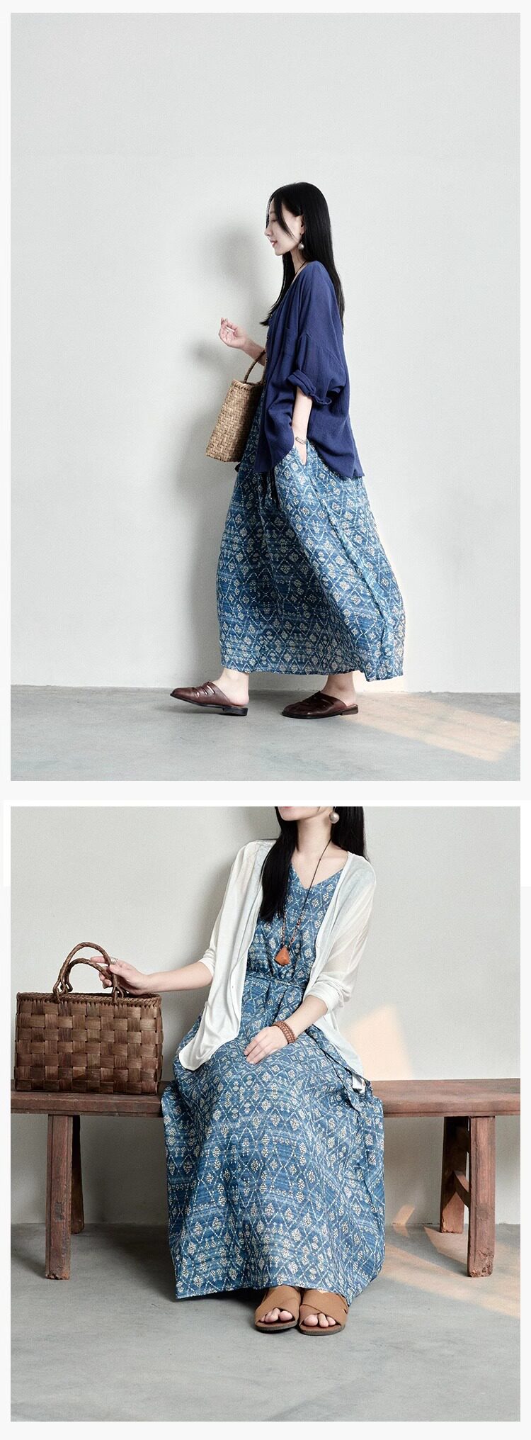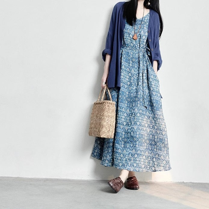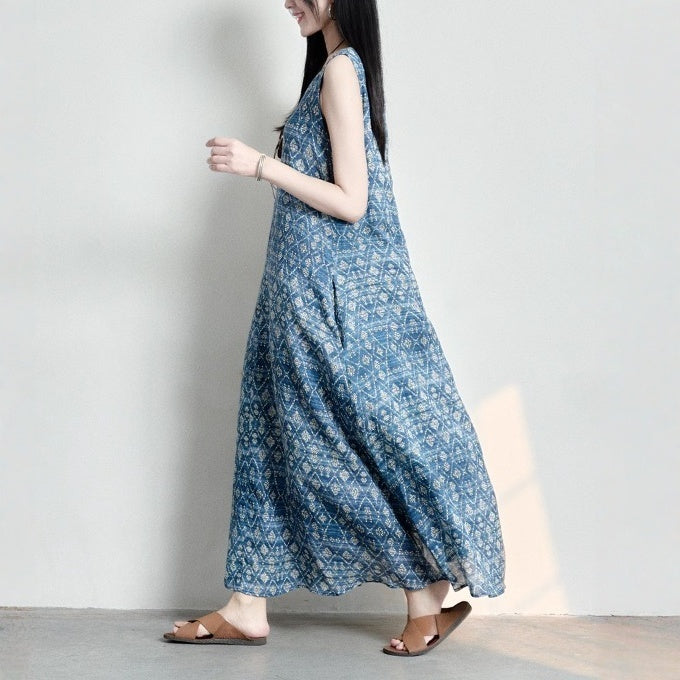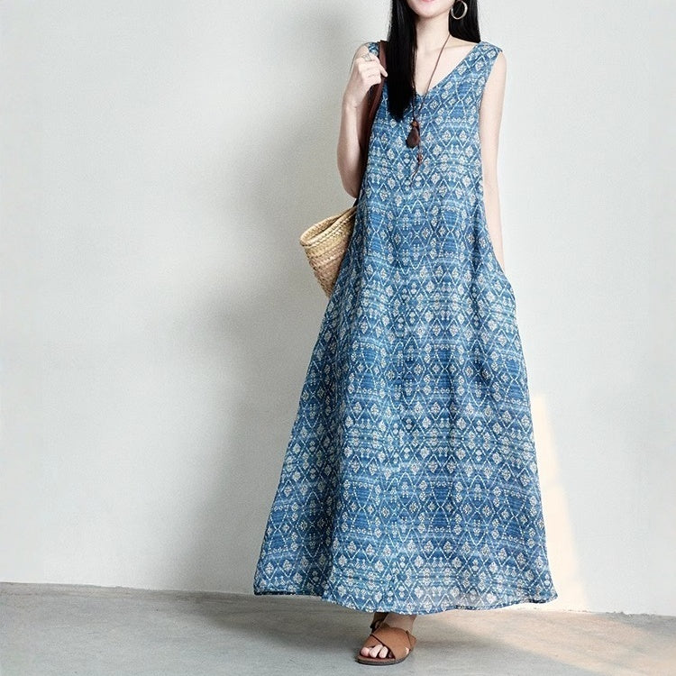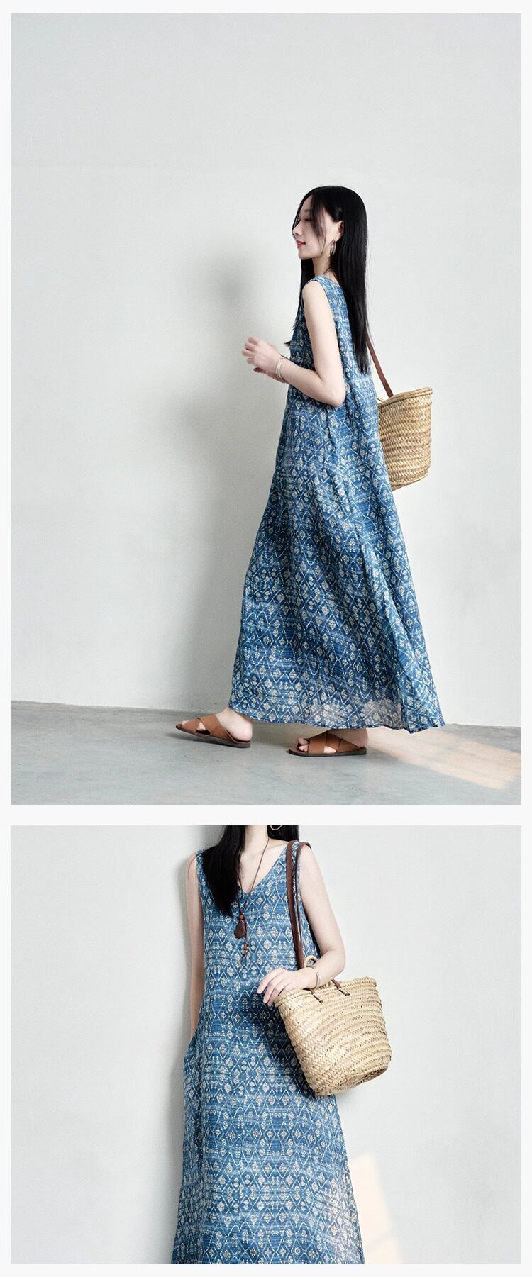 【ワンピース】Vネック レトロ プリント ノースリーブ ワンピース 【SHシリーズ】
