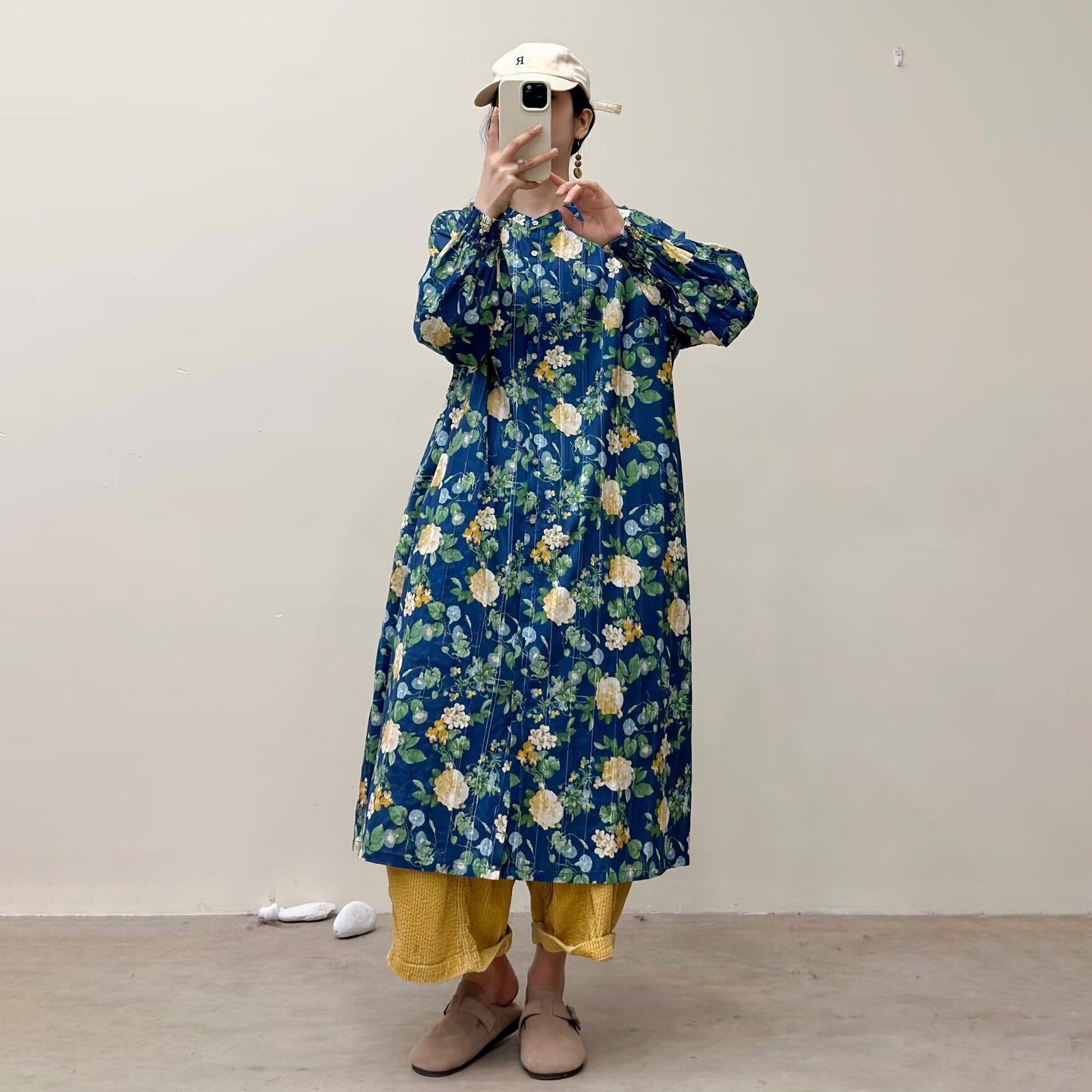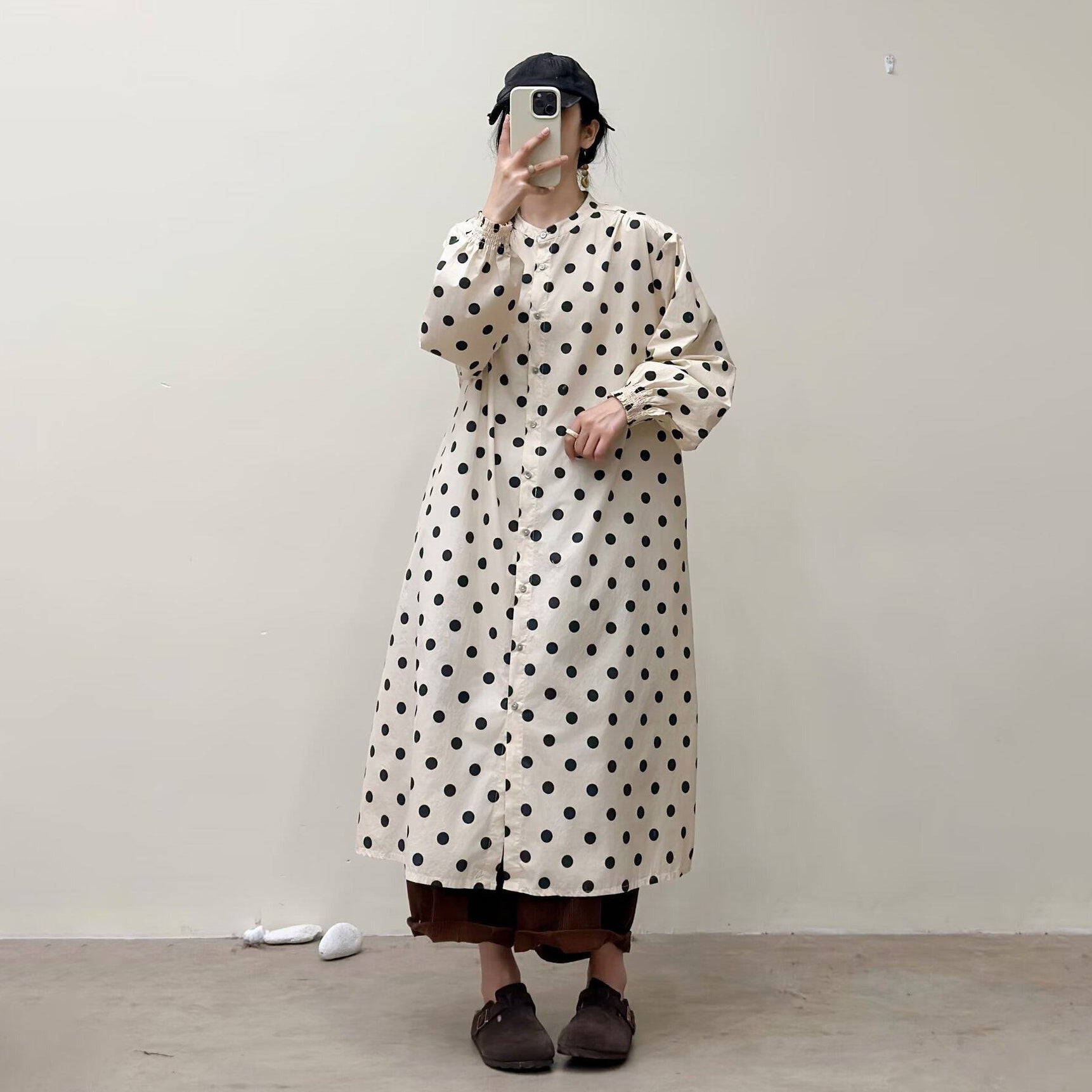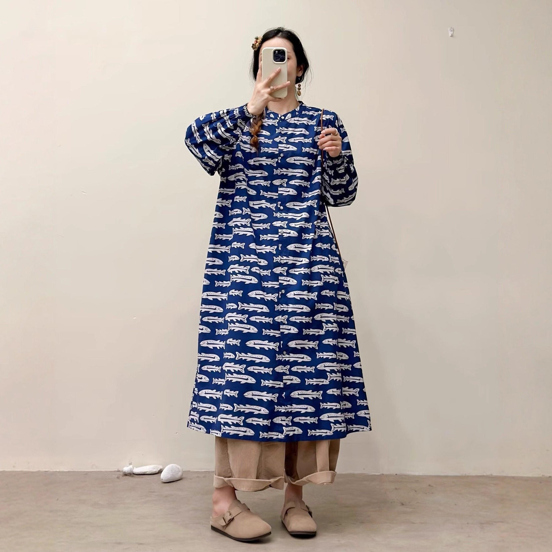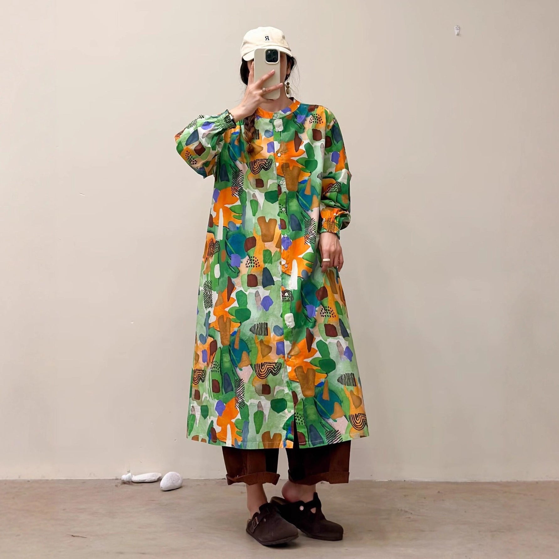選べる7柄!【ワンピース】🎀カジュアルかわいい丸首プリントワンピース 長袖 シングルボタン 春新作 韓国風ウエストシェイプ レディース【SHシリーズ】