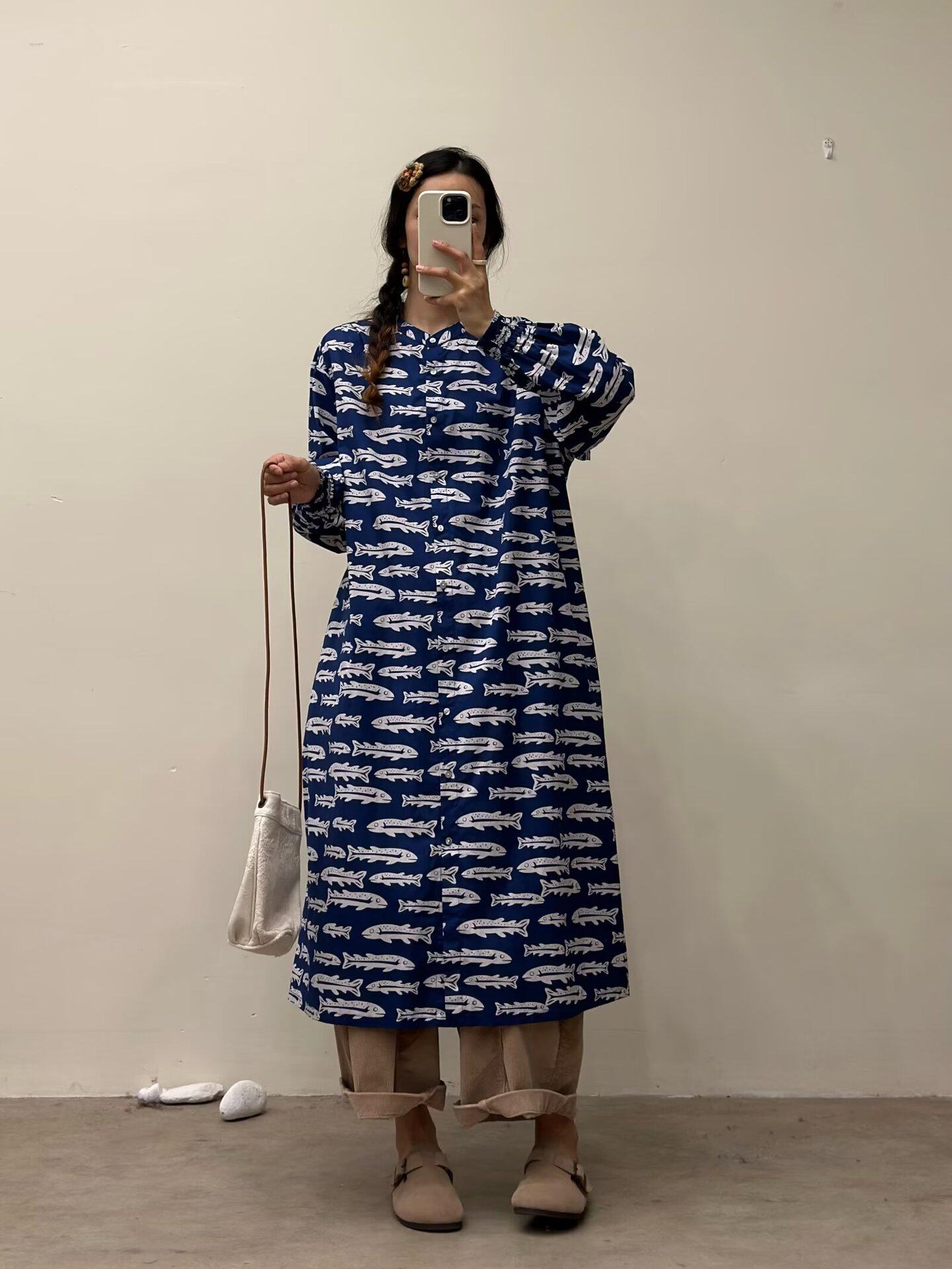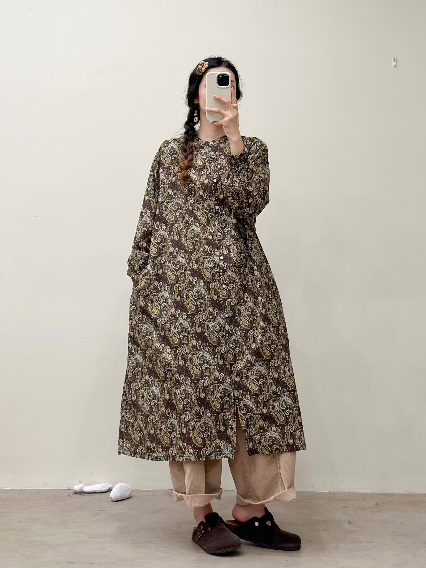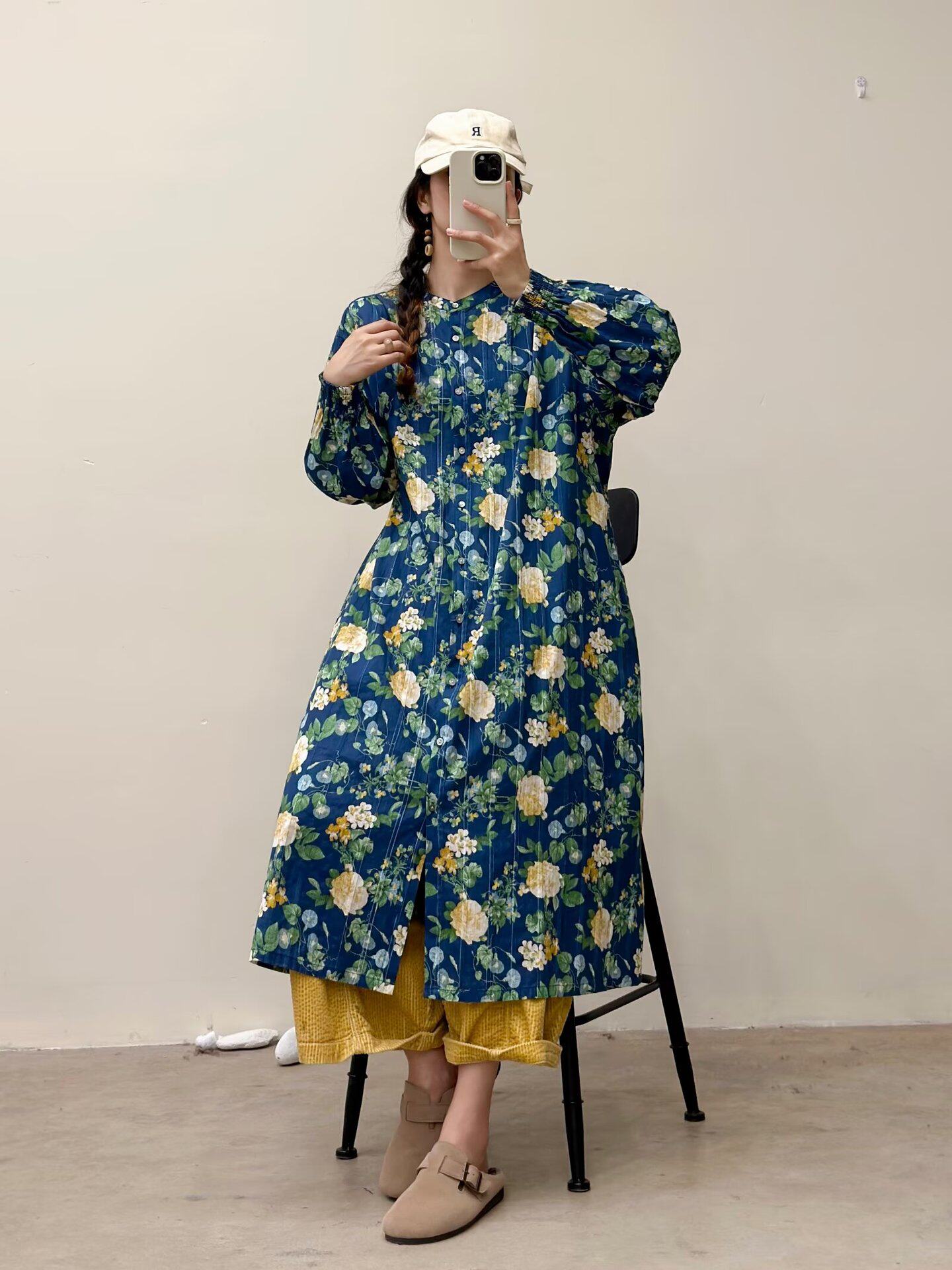 【商品名】【ワンピース】🎀カジュアルかわいい丸首プリントワンピース 長袖 シングルボタン 春新作 韓国風ウエストシェイプ レディース【SHシリーズ】