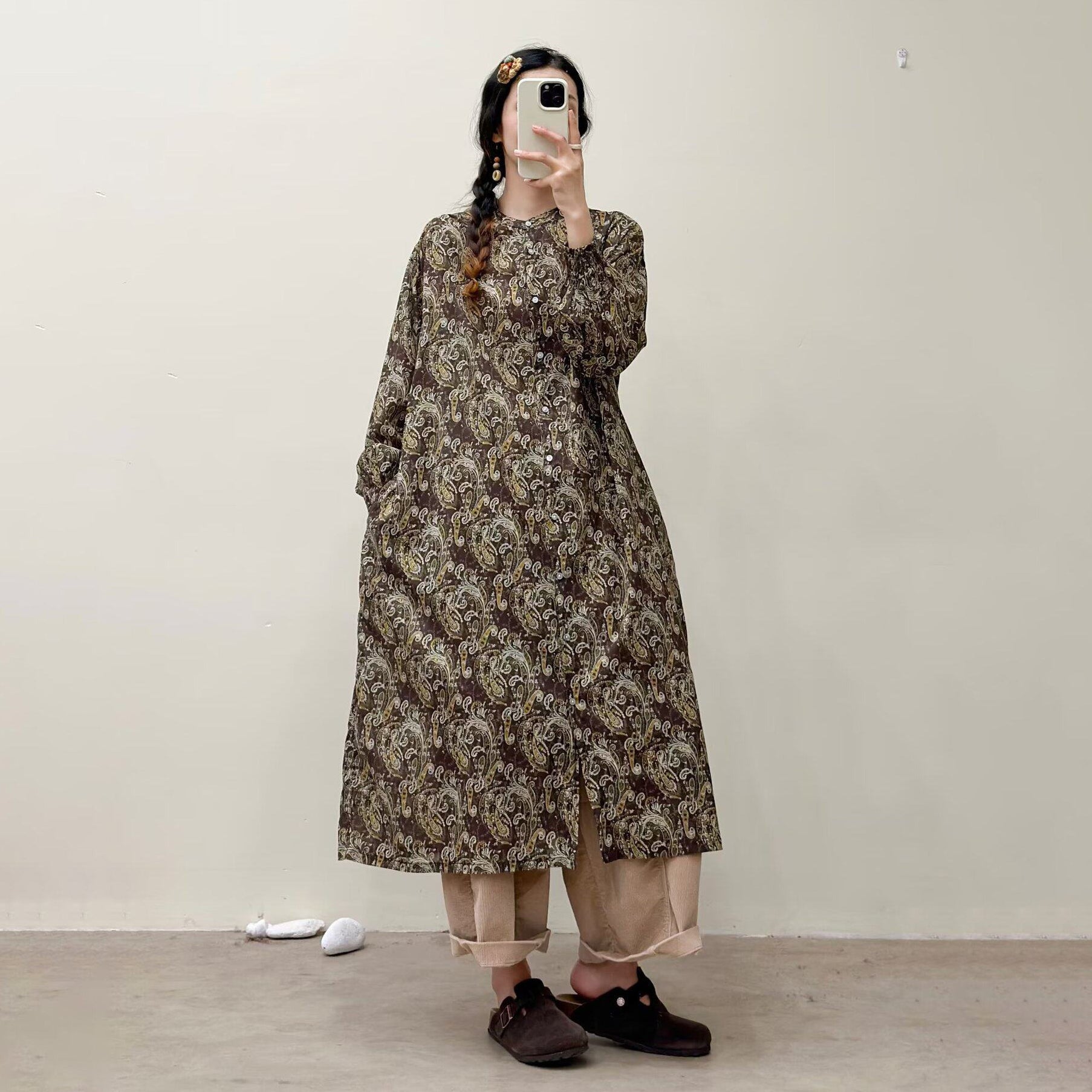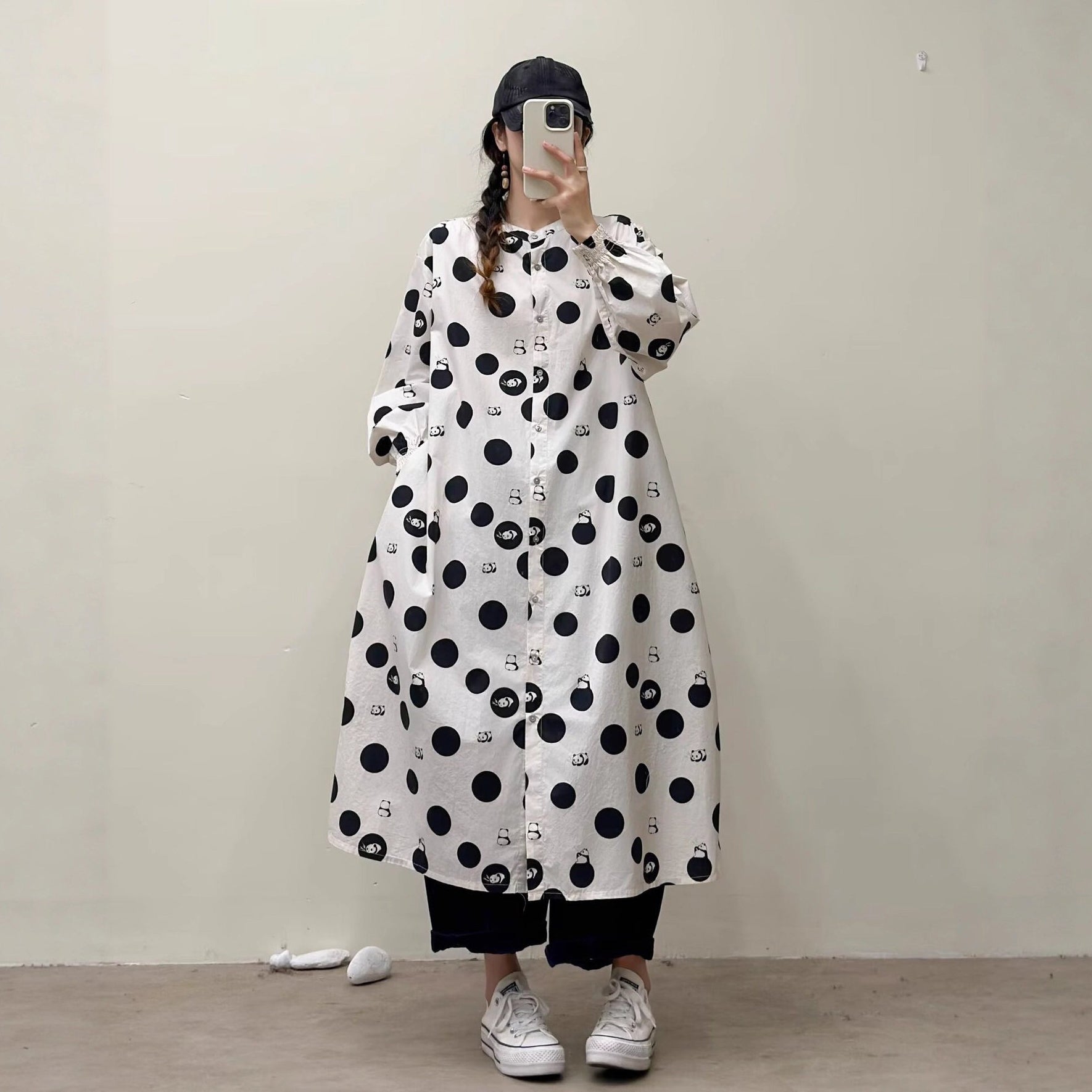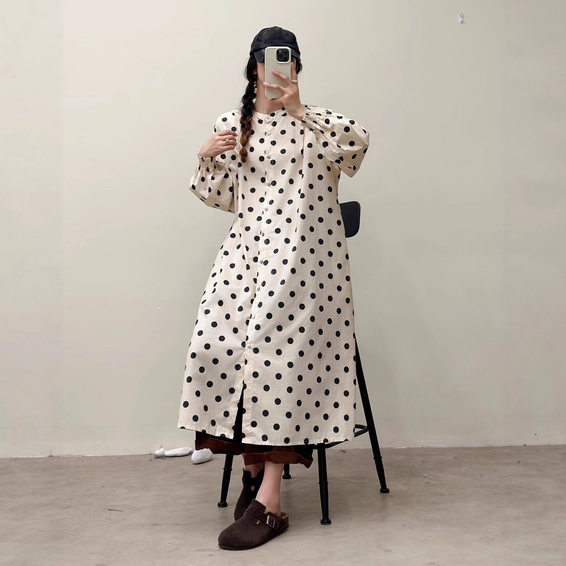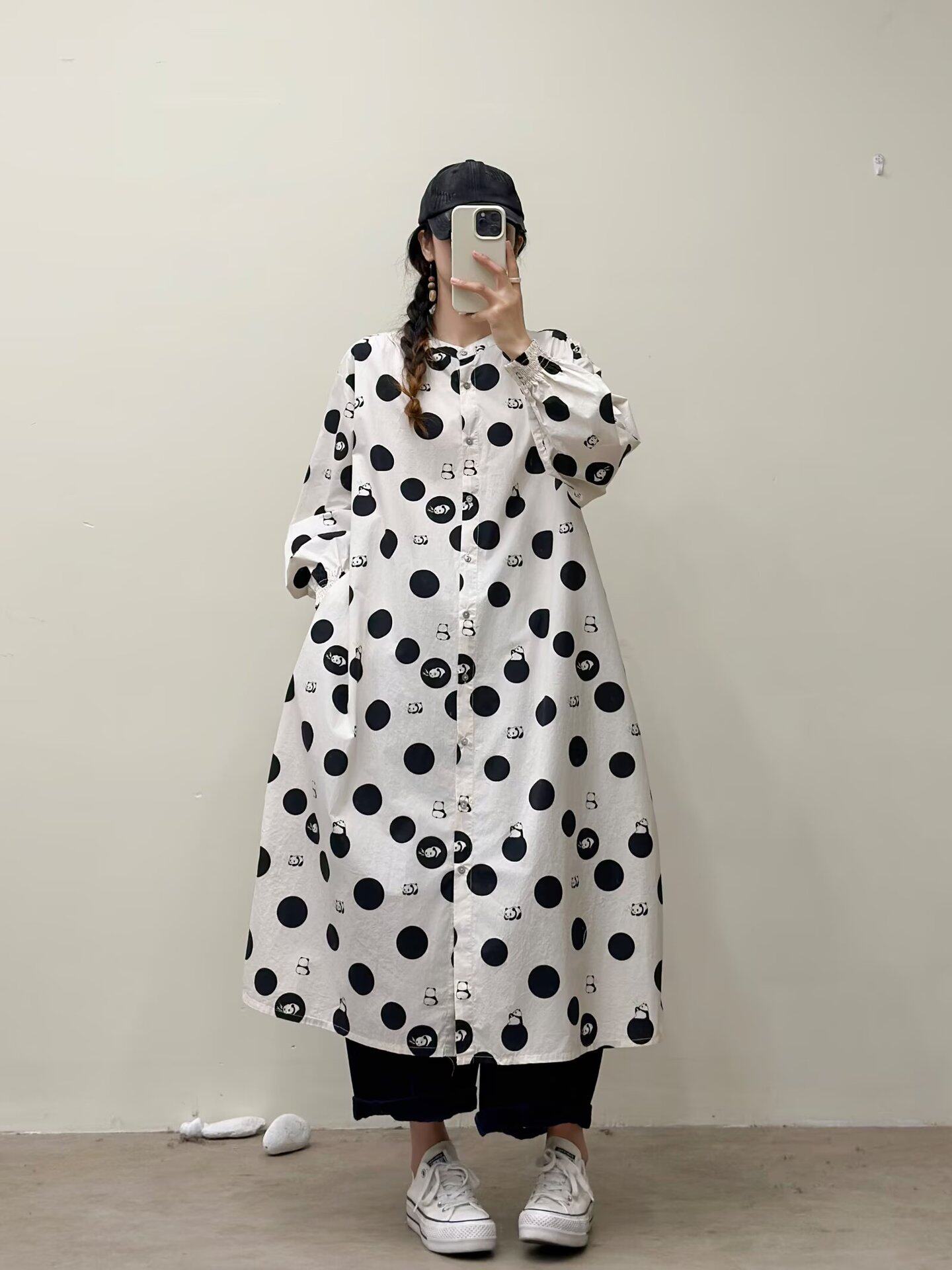 【商品名】【ワンピース】🎀カジュアルかわいい丸首プリントワンピース 長袖 シングルボタン 春新作 韓国風ウエストシェイプ レディース【SHシリーズ】